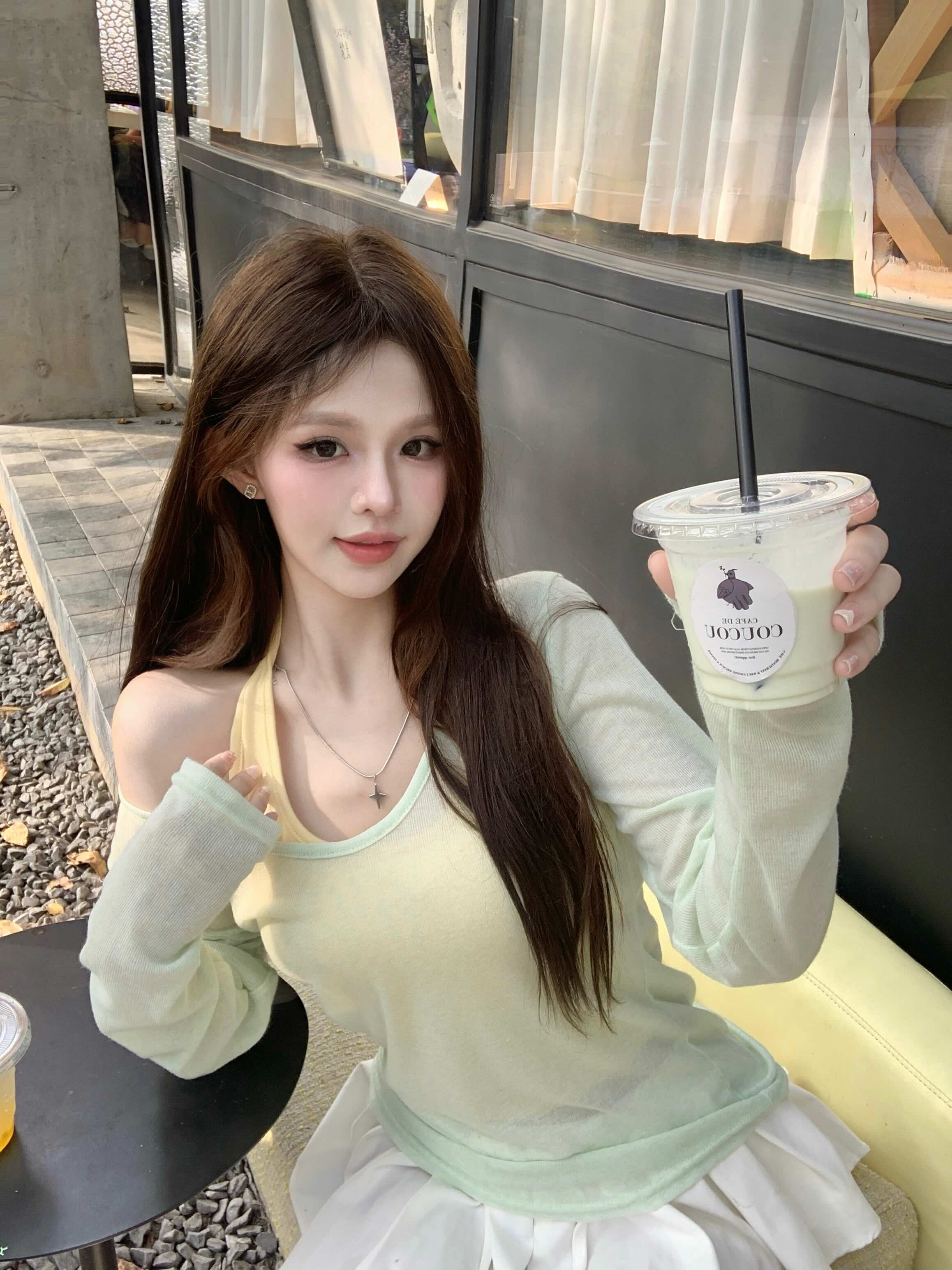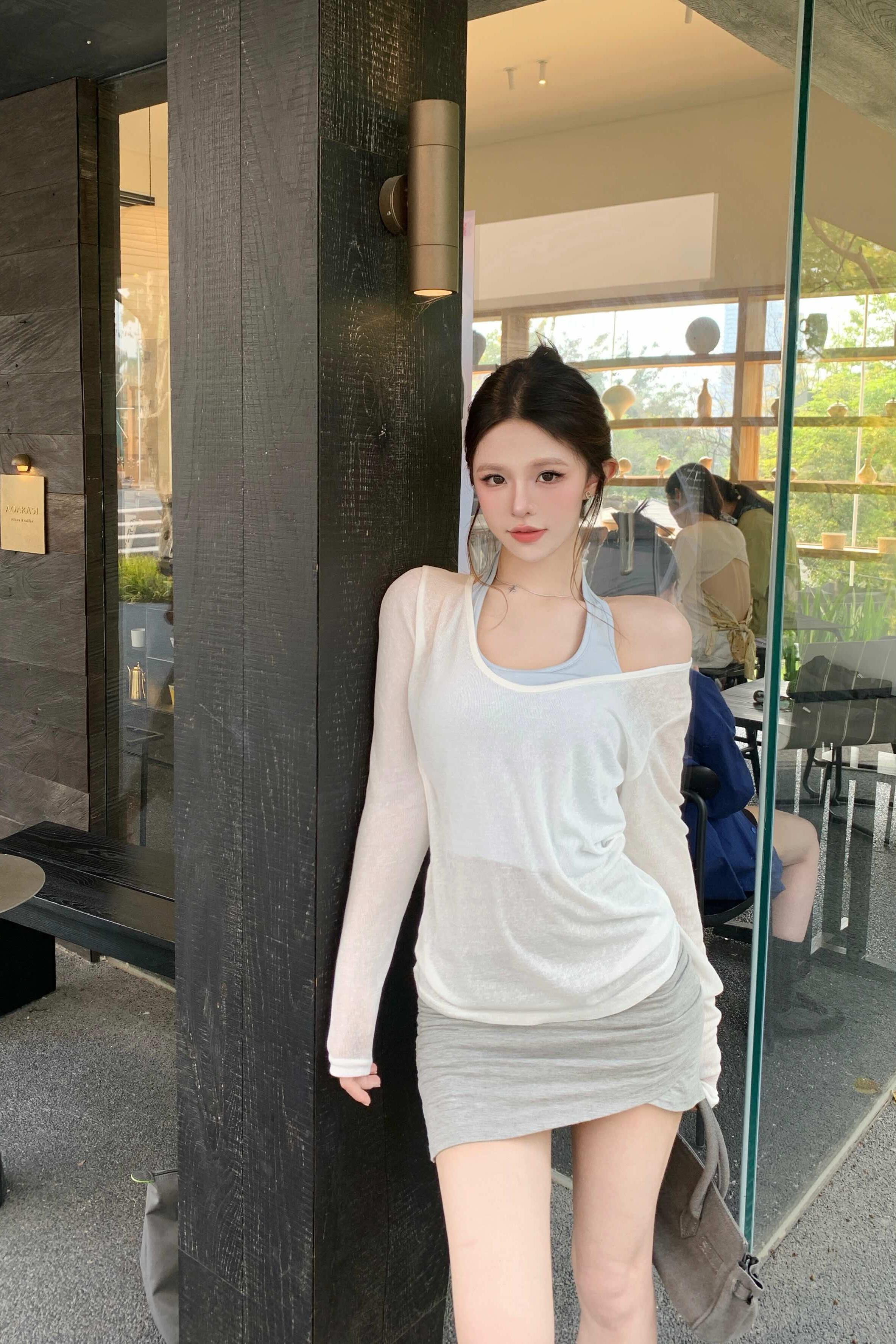 MY6551# 纯欲风套装V领薄款罩衫T恤女小众内搭挂脖背心上衣两件套女裝貨源服裝批發