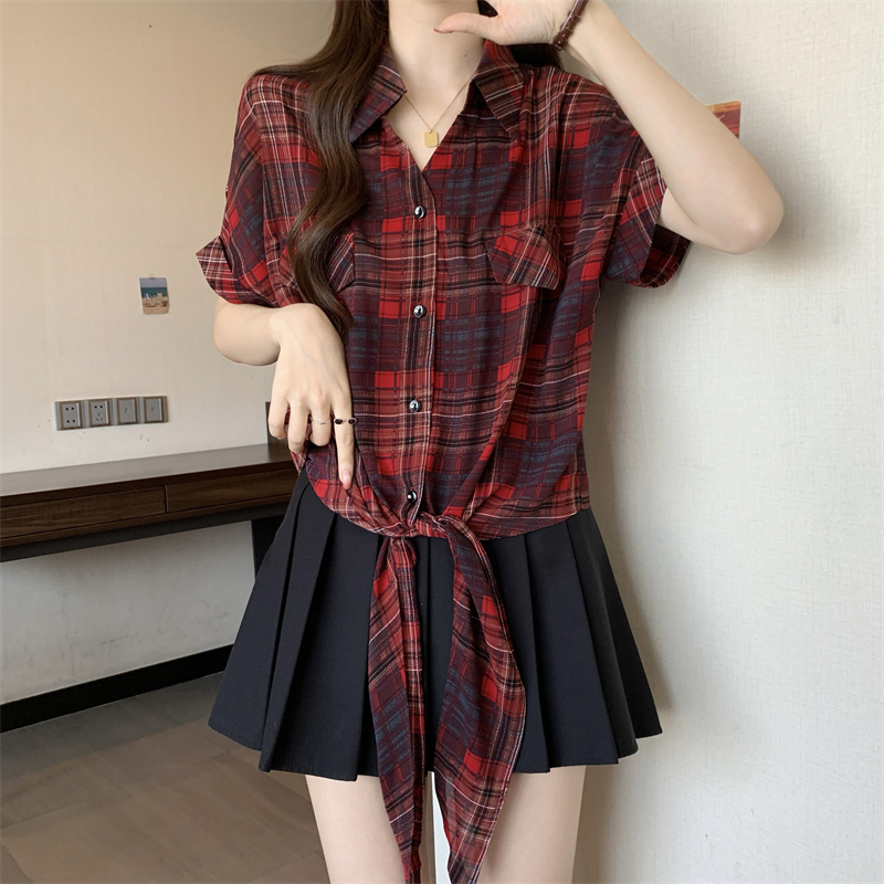 MY6572#大码胖MM新款设计感系带格子雪纺衫遮肉显瘦上衣