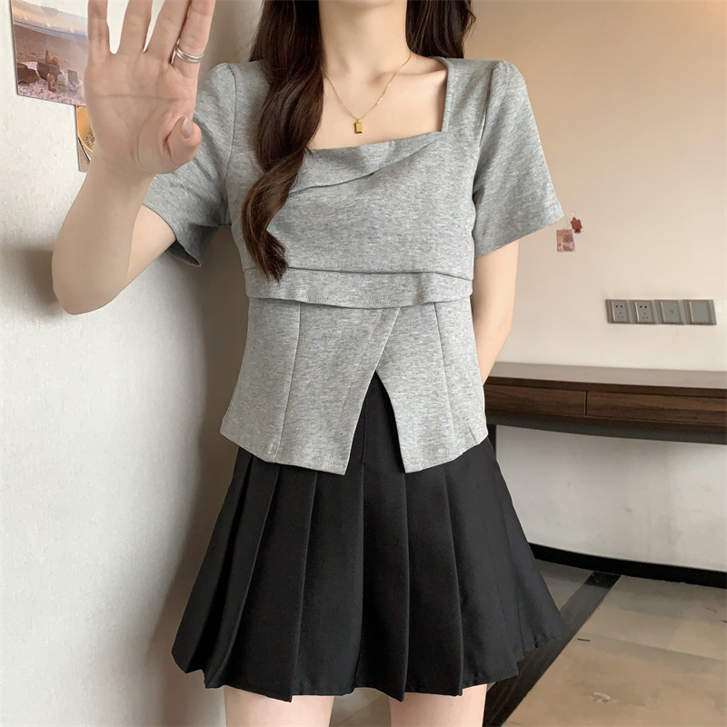 MY6651# 大码女装不规则收腰显瘦设计感气质百搭方领T恤女短袖上衣女裝貨源服裝批發