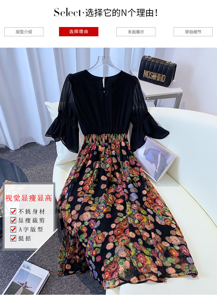 MY6770# 大码女装夏季腰身珍珠装饰显瘦拼接碎花雪纺中长连衣裙短袖女裝貨源服裝批發