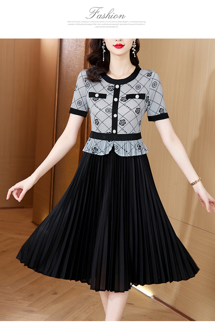 MY7078# 欧洲站夏季新款时尚褶皱圆领拼接修身显瘦连衣裙中长款百褶裙女裝貨源服裝批發