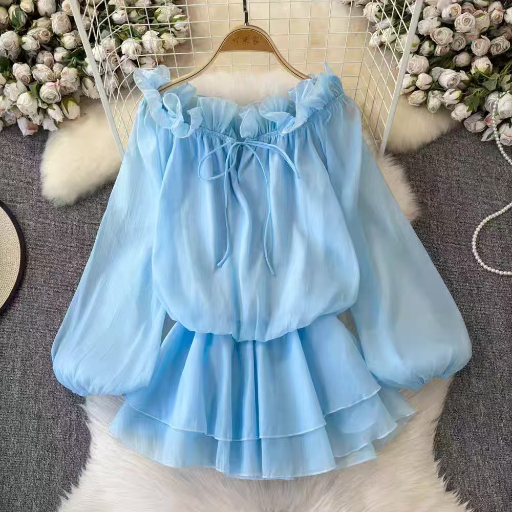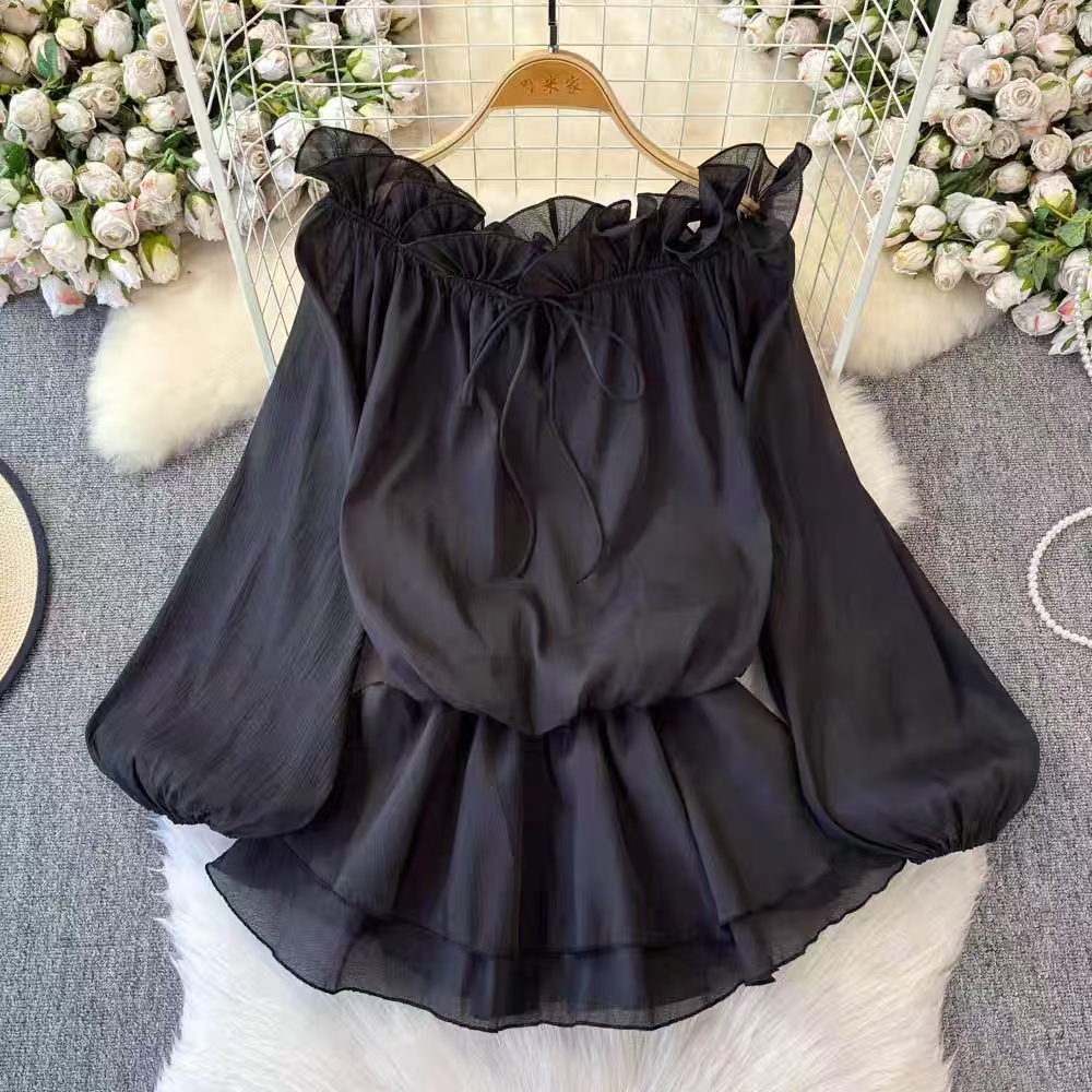 MY7096# 新款法式气质高级感衬衣一字肩短款长袖上衣黑色重工衬衫女裝貨源服裝批發