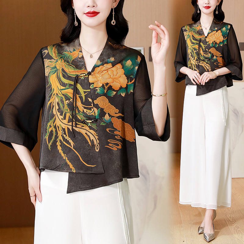 MY7120# 夏季新款香云纱上衣女高端印花复古真丝衬衫女裝貨源服裝批發