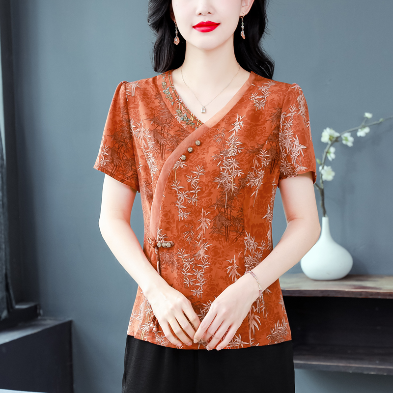 MY7391# 夏季复古国风短袖翻领印花宽松显瘦修身大码上衣女女裝貨源服裝批發