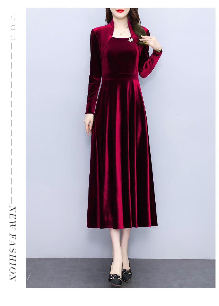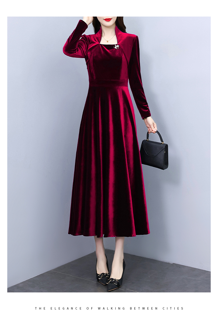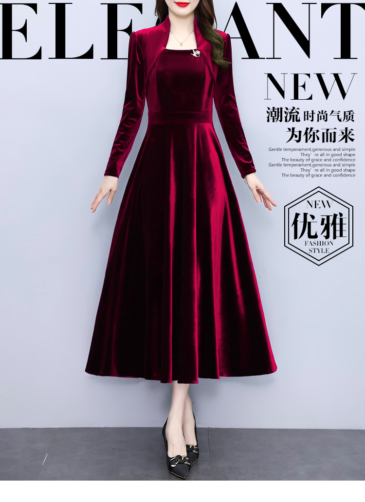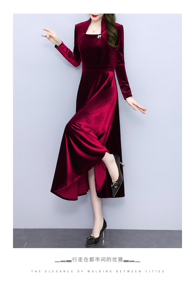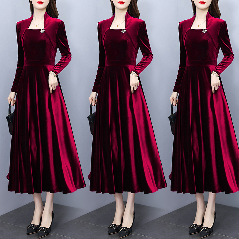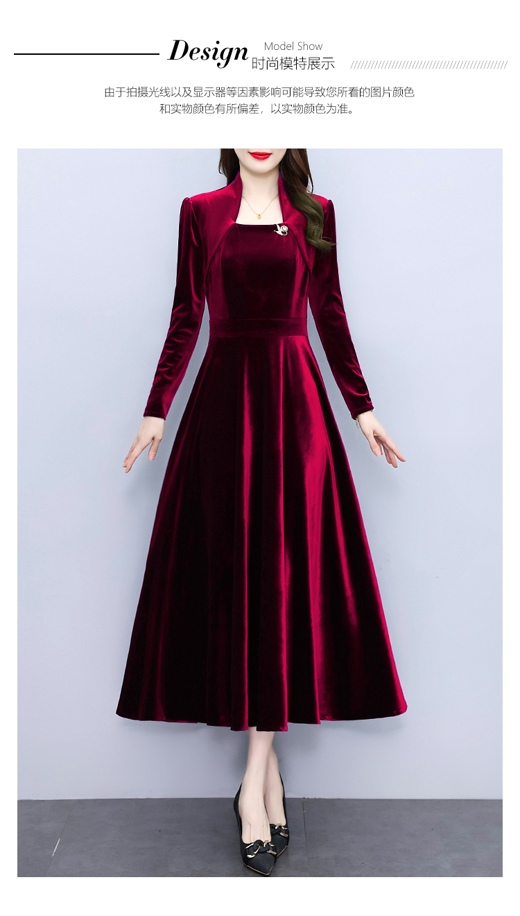 MY13312# 高端名媛酒红色长裙春喜婆婆礼服显瘦长袖丝绒连衣裙女女裝貨源服裝批發