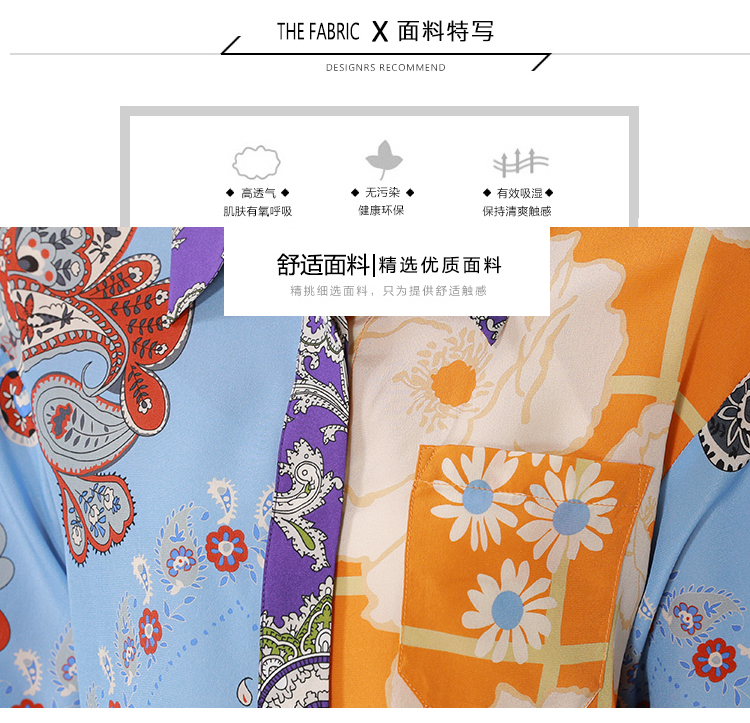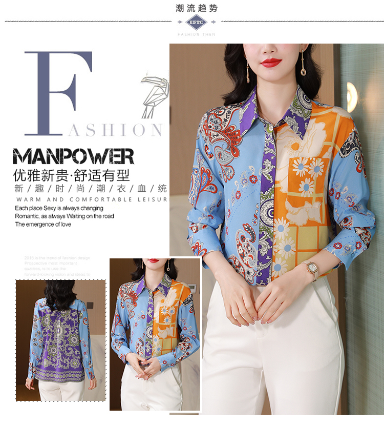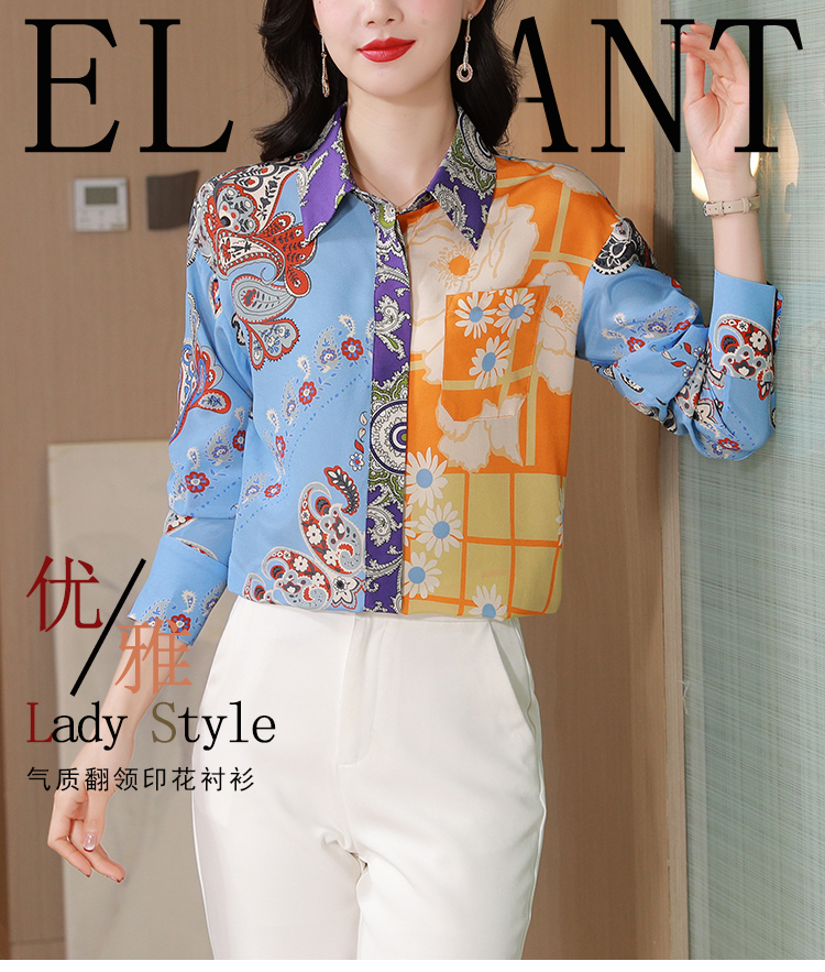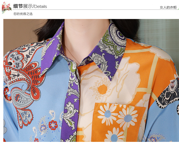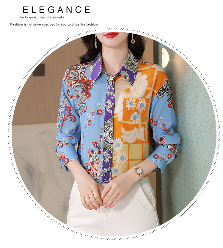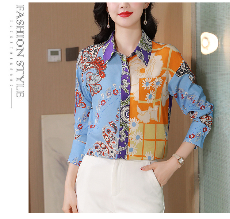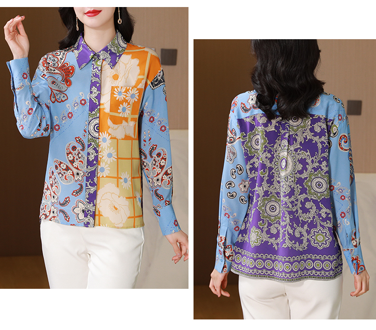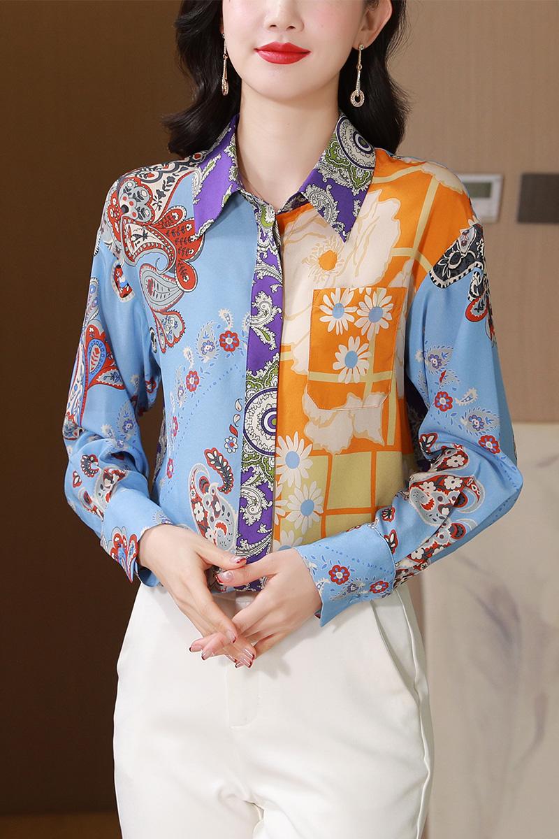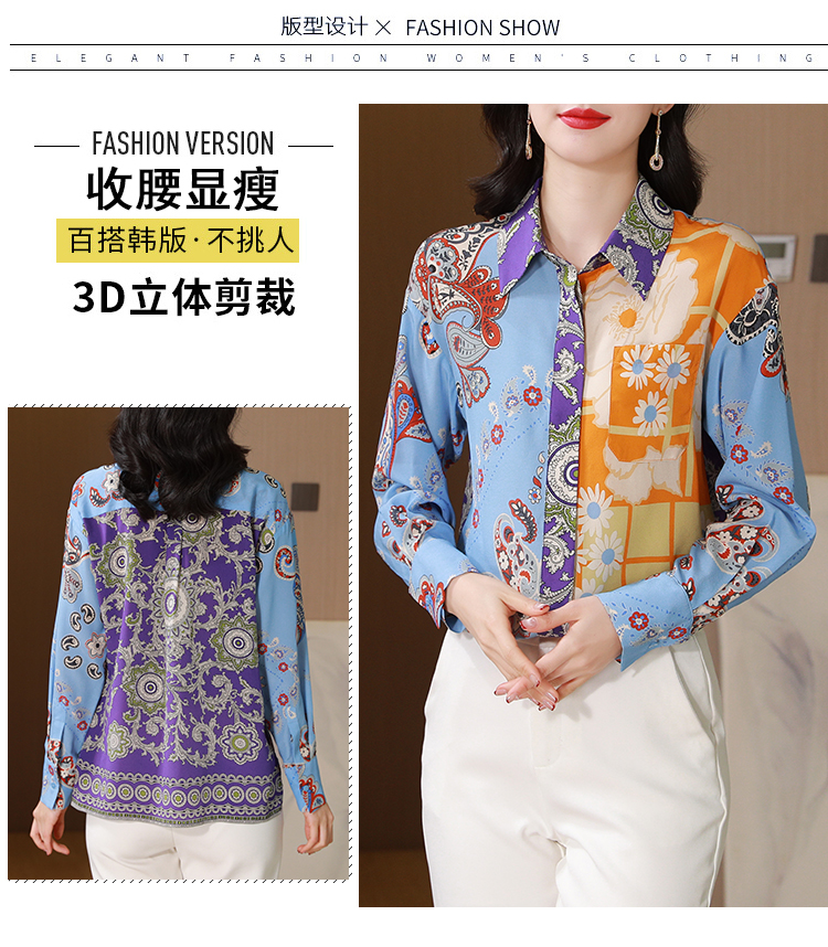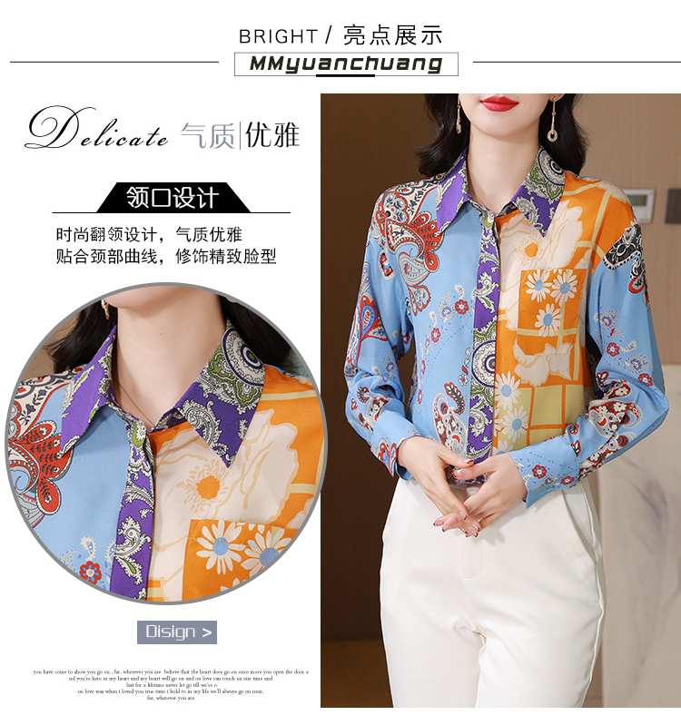 MY13776# 女裝貨源真丝复古印花长袖衬衫新款宽松翻领桑蚕丝衬衣港味显...