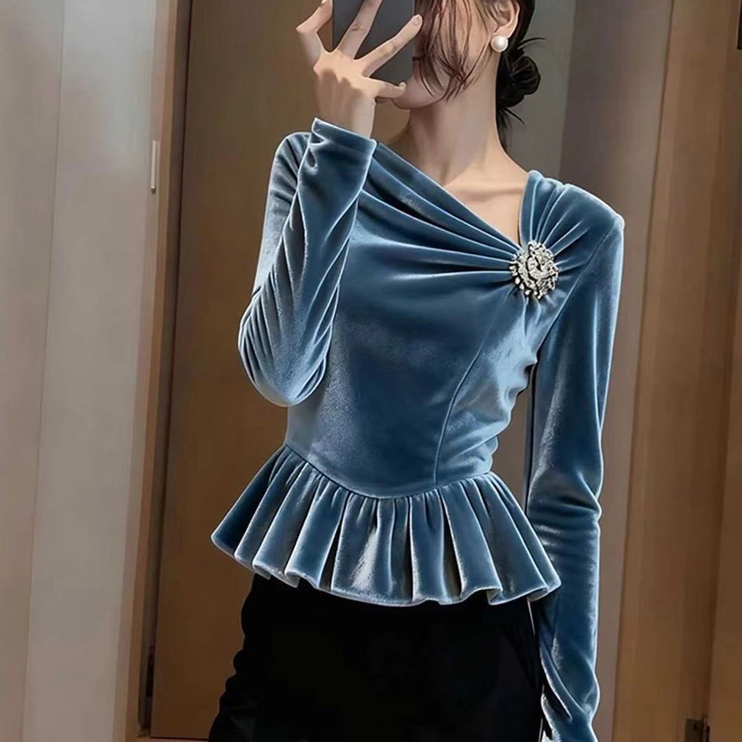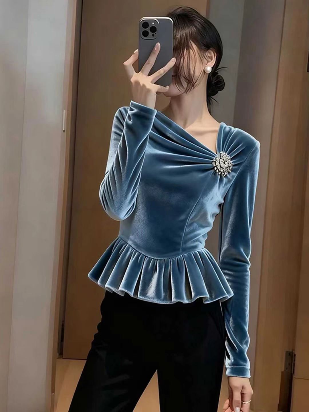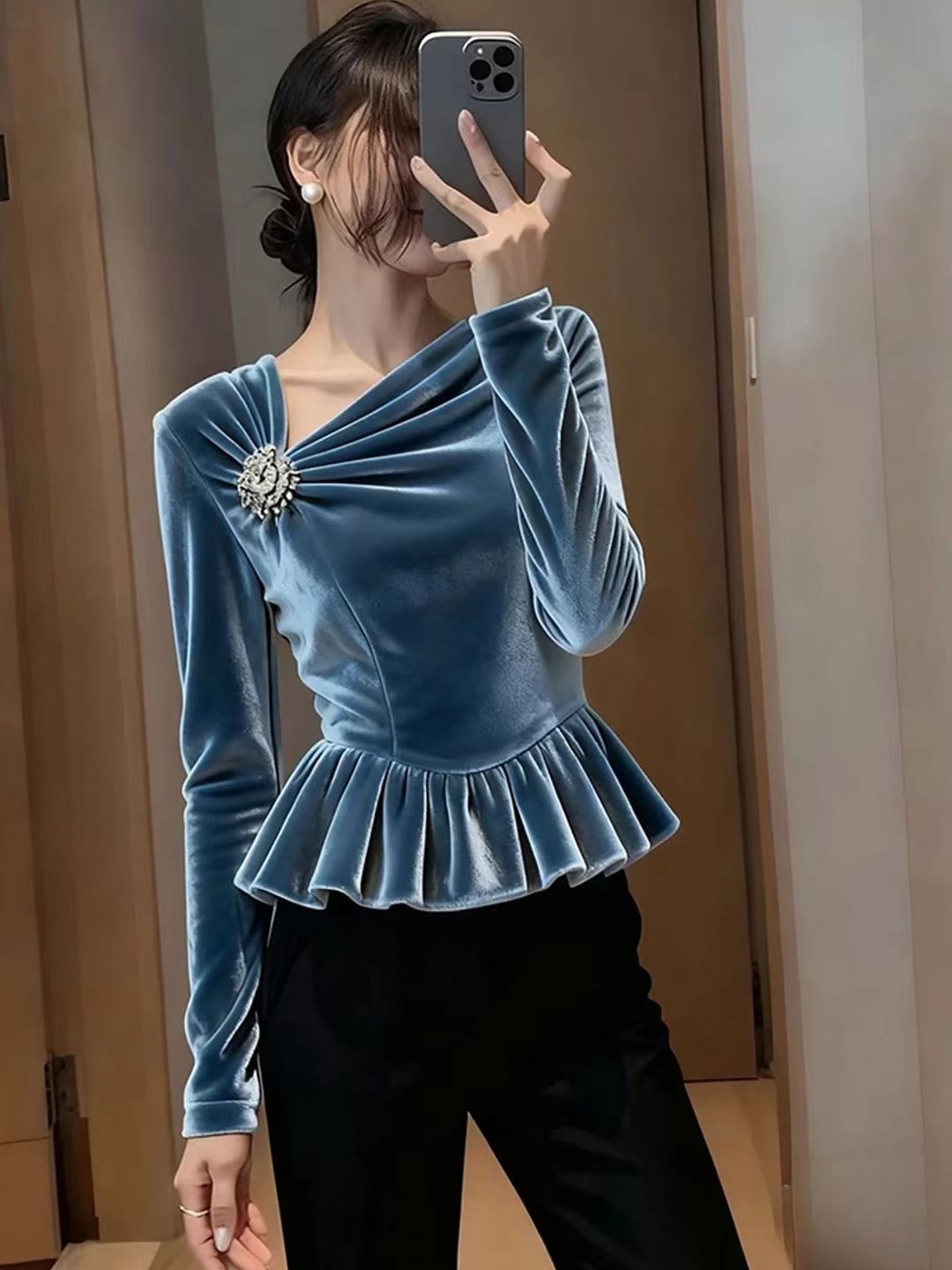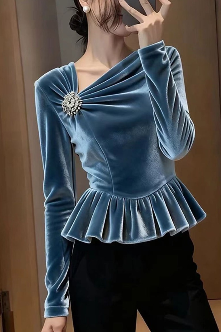 MY13832# 女裝貨源蓝色丝绒上衣女高级感轻奢减龄洋气独特漂亮法式掐腰衬衫女裝貨源服裝批發服裝批發