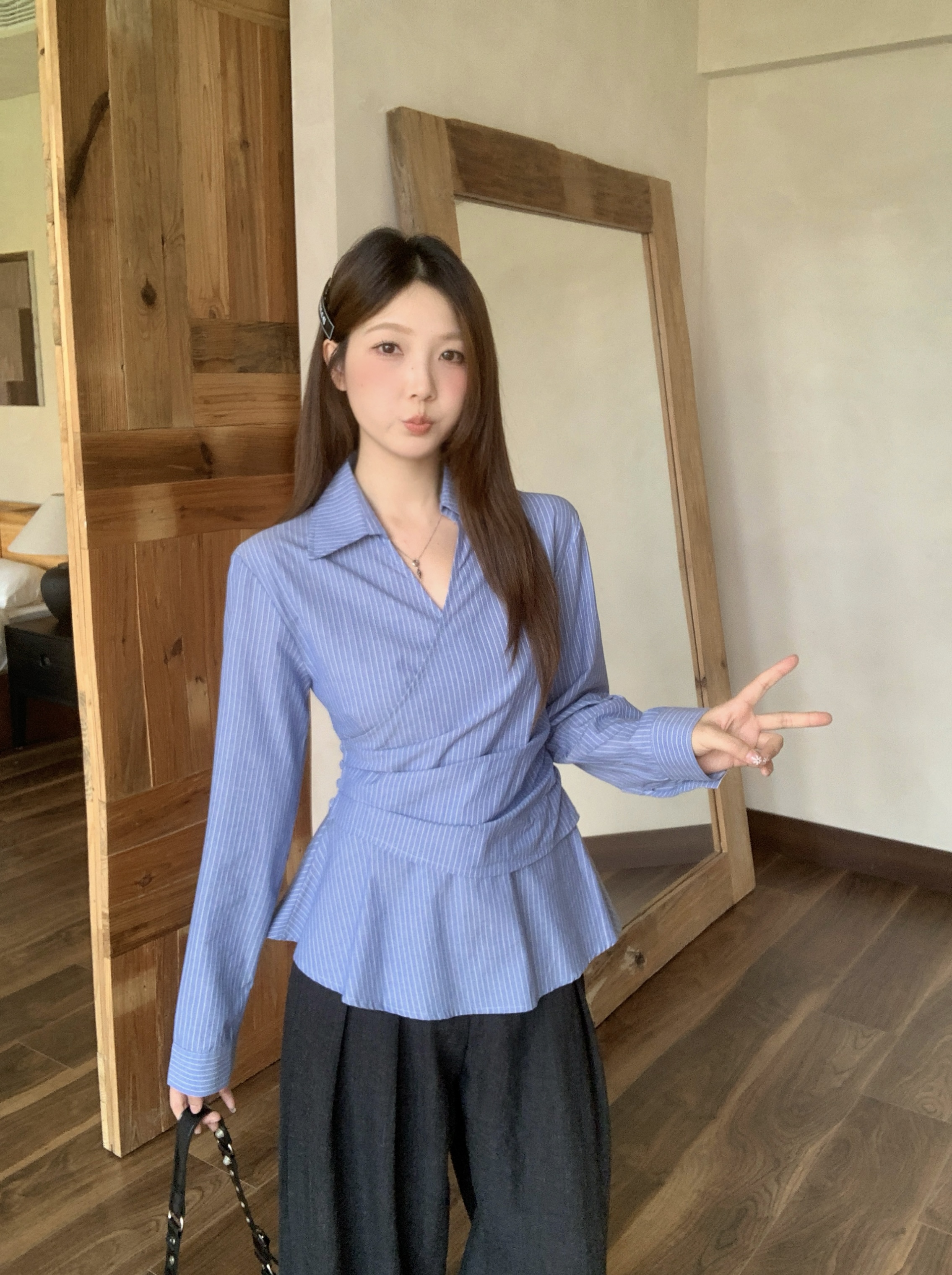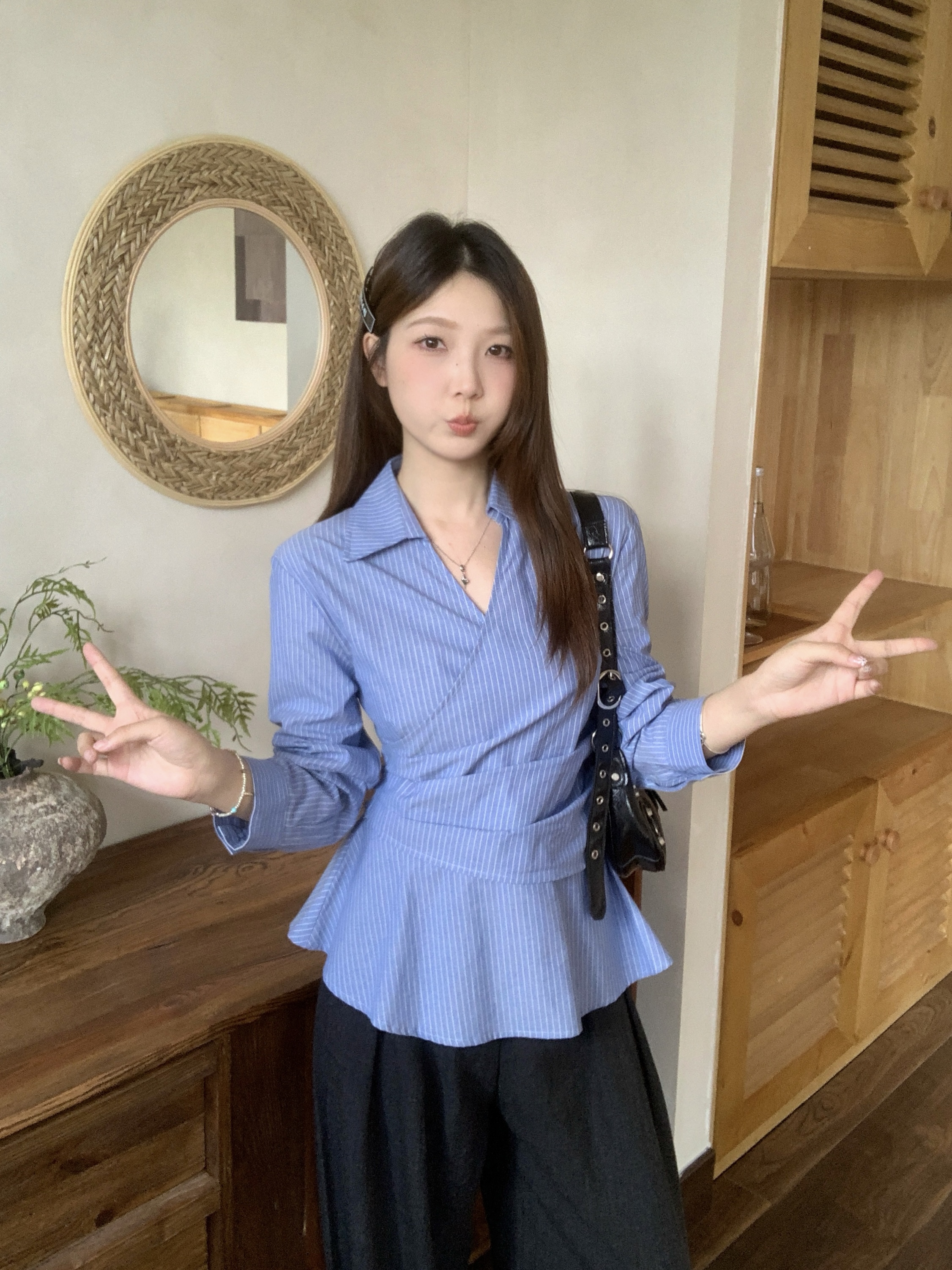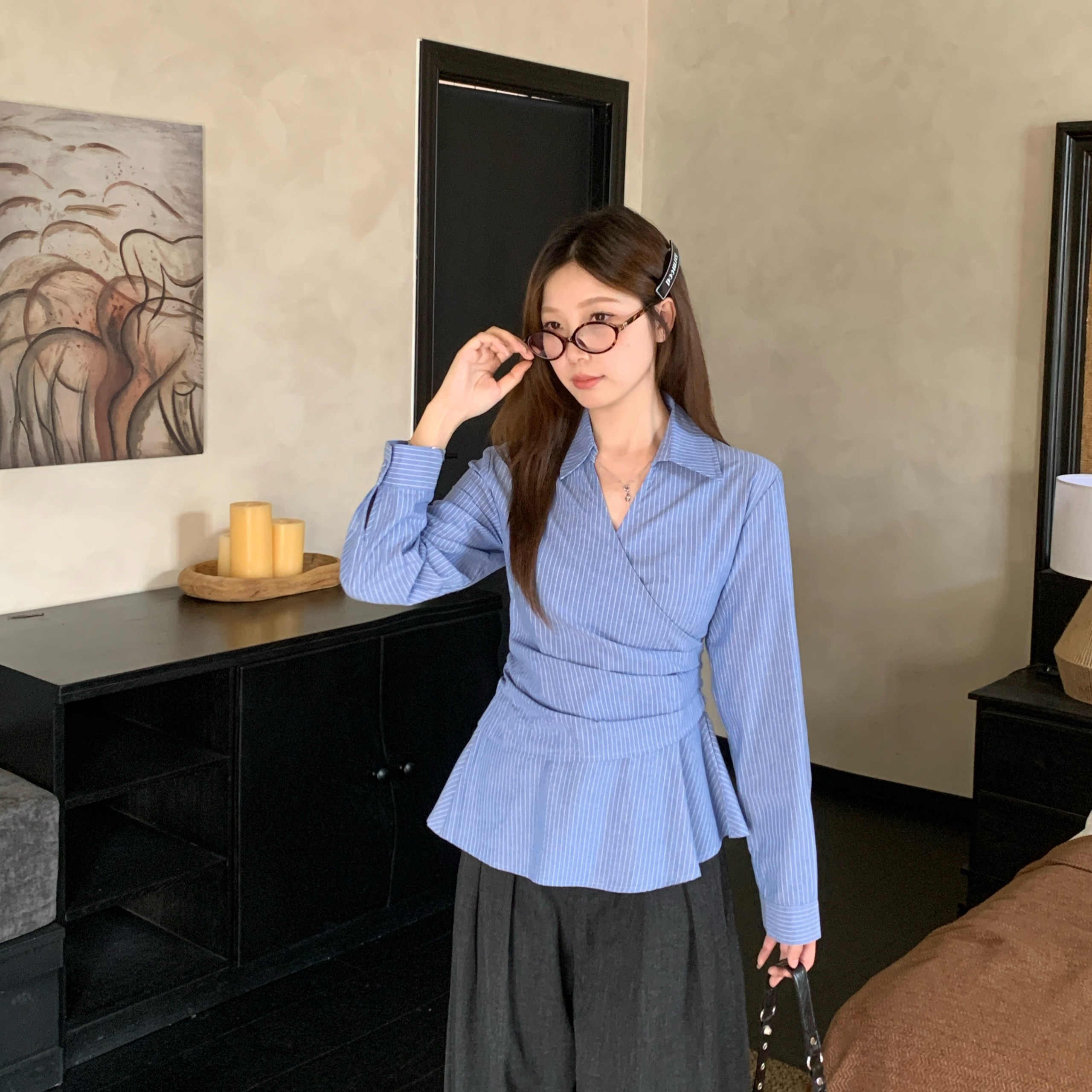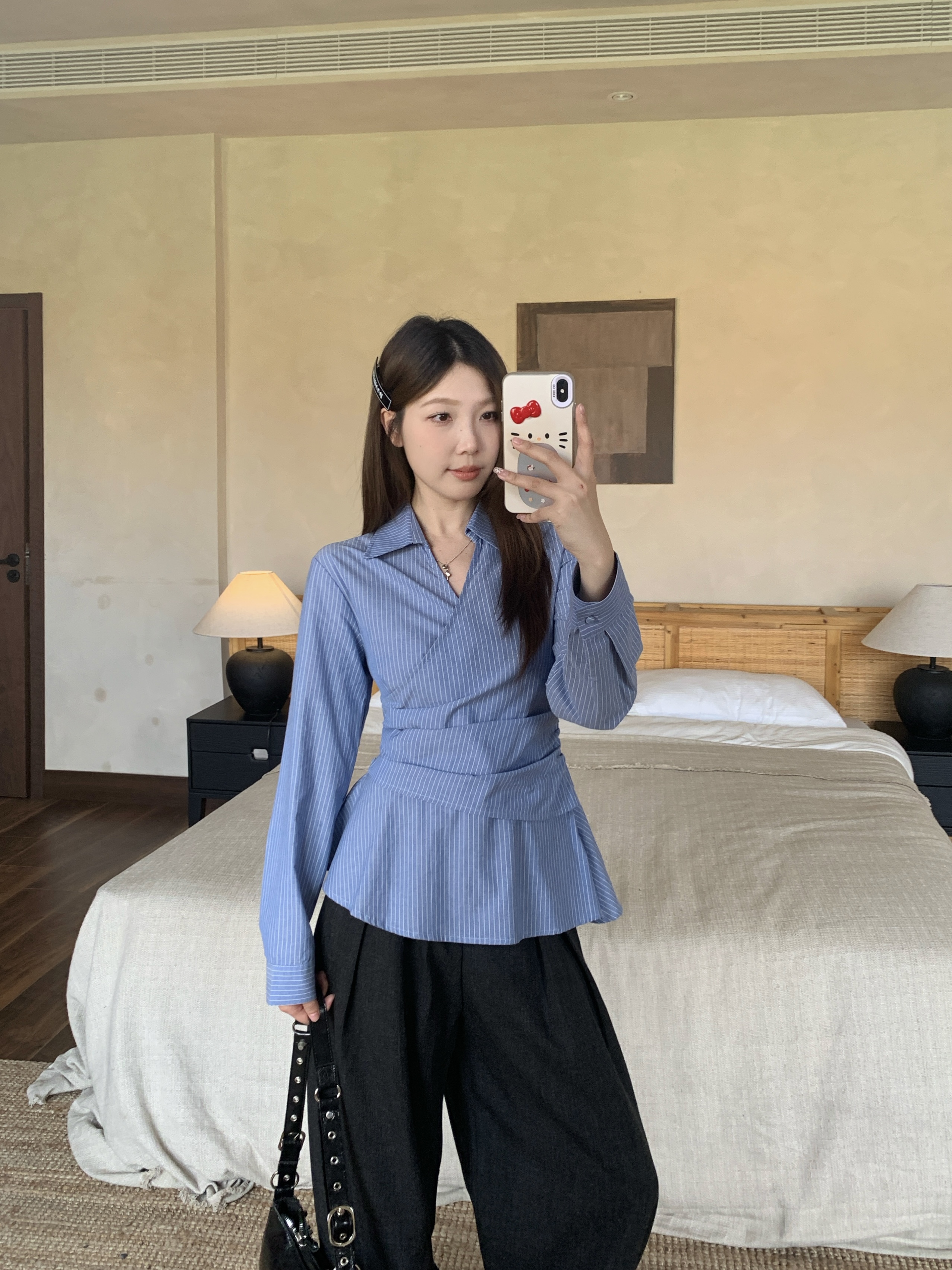 MY13838# 女裝貨源大码胖MM秋季新款韩系侧边纽扣收腰显瘦衬衫条纹百搭上衣女裝貨源服裝批發服裝批發