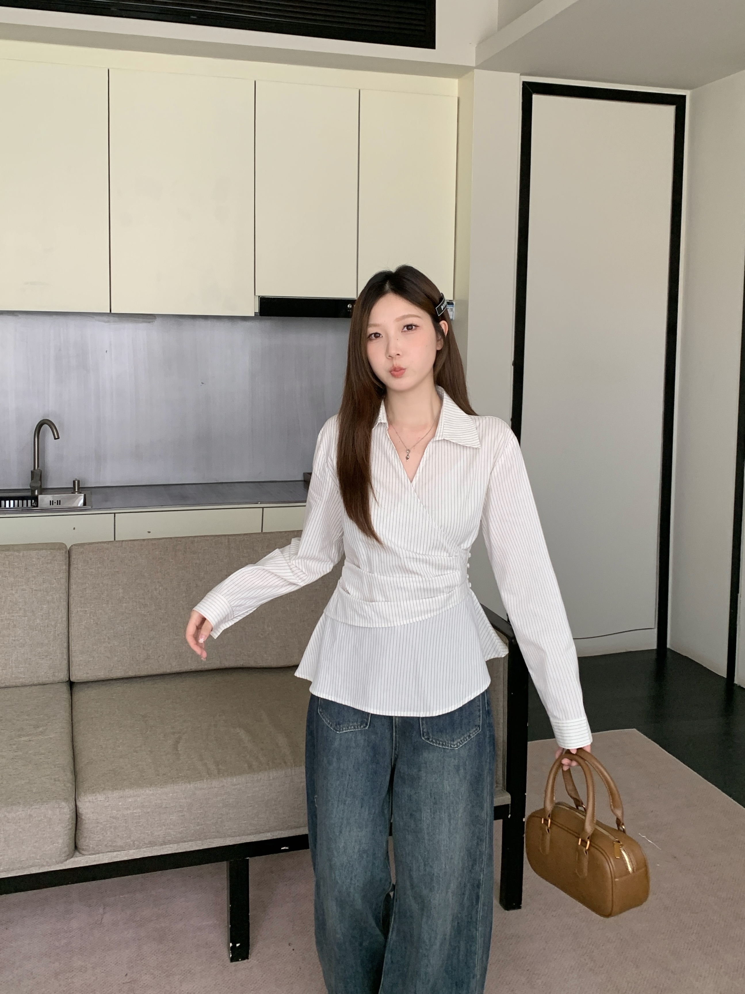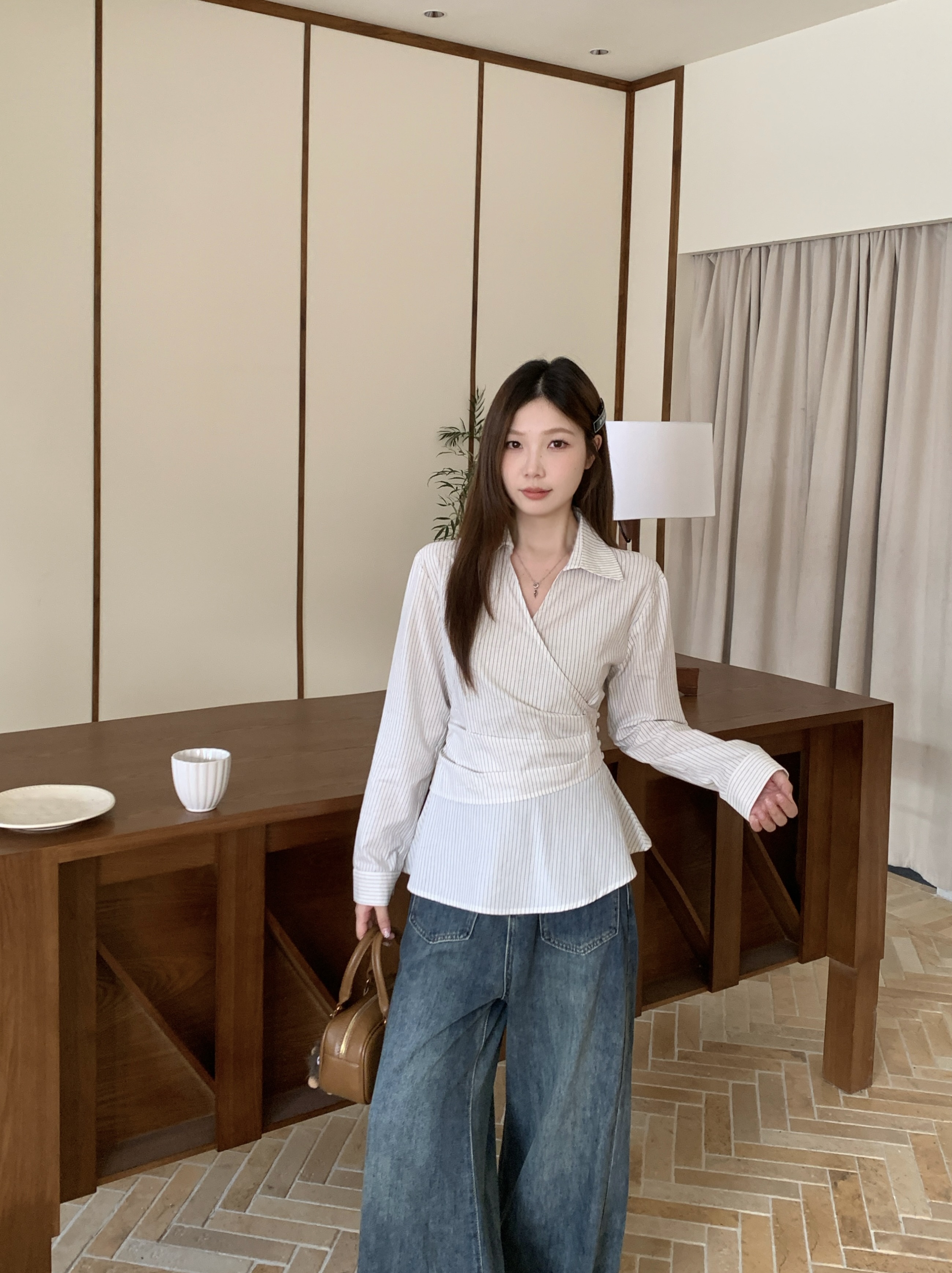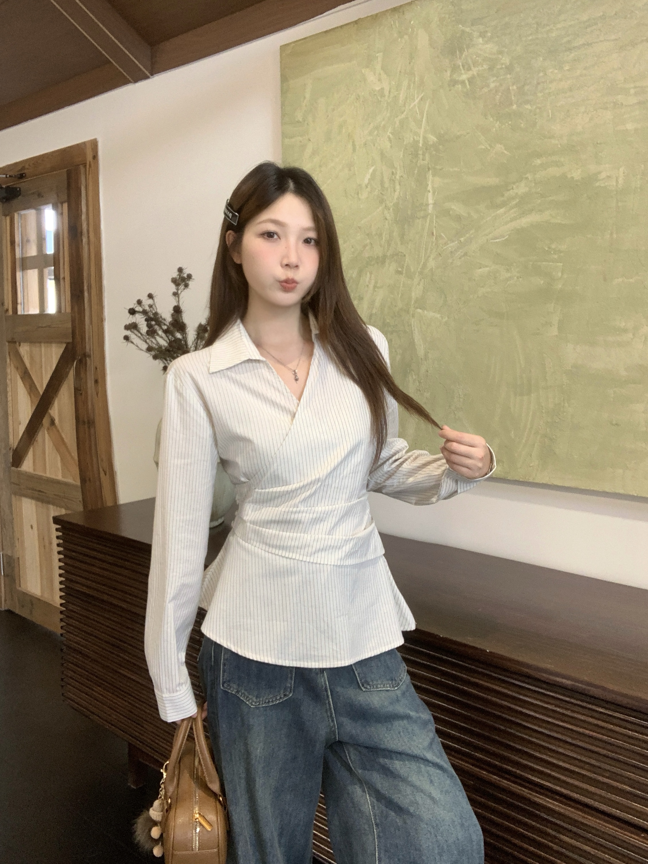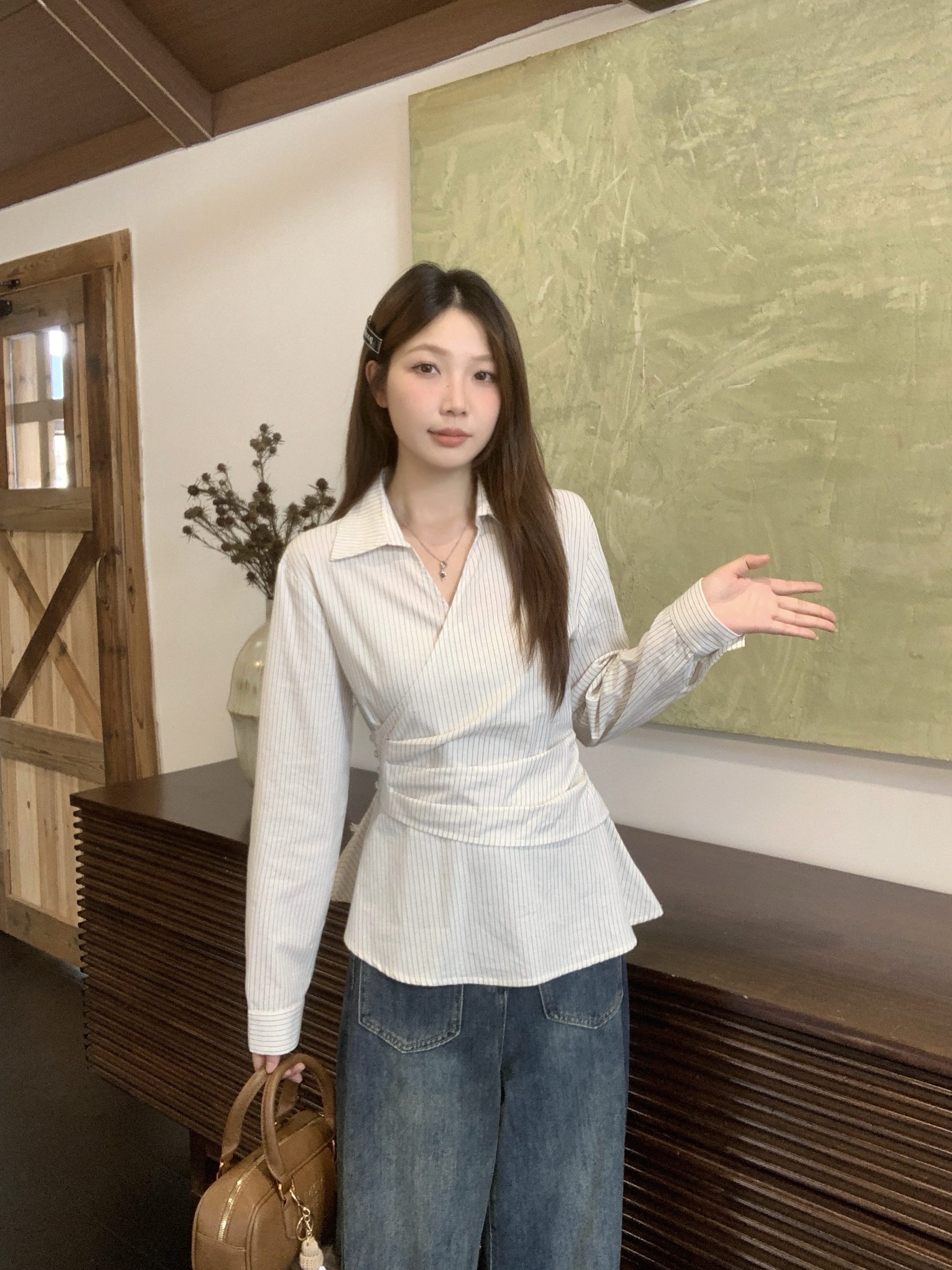 MY13838# 女裝貨源大码胖MM秋季新款韩系侧边纽扣收腰显瘦衬衫条纹百搭上衣女裝貨源服裝批發服裝批發