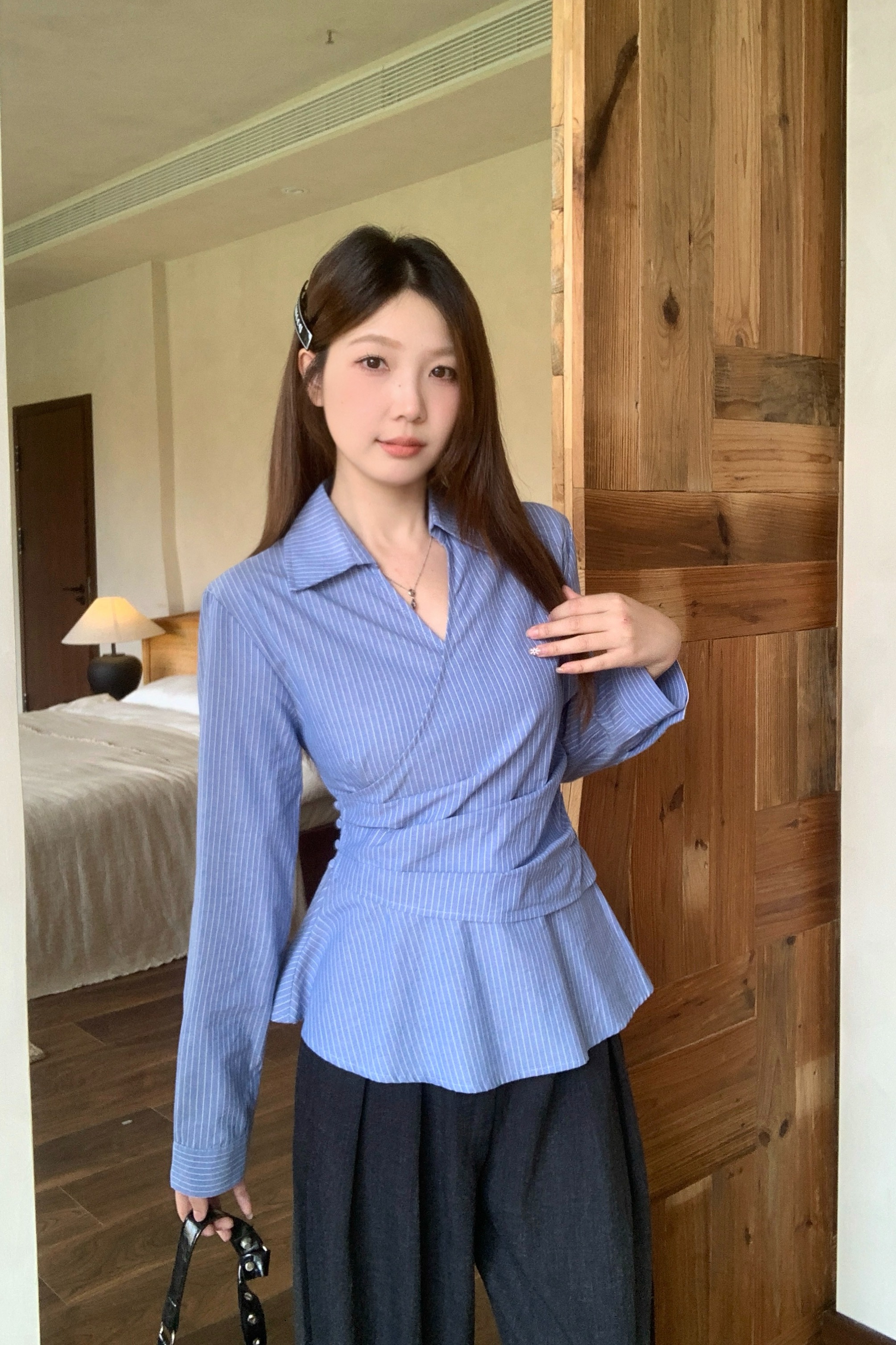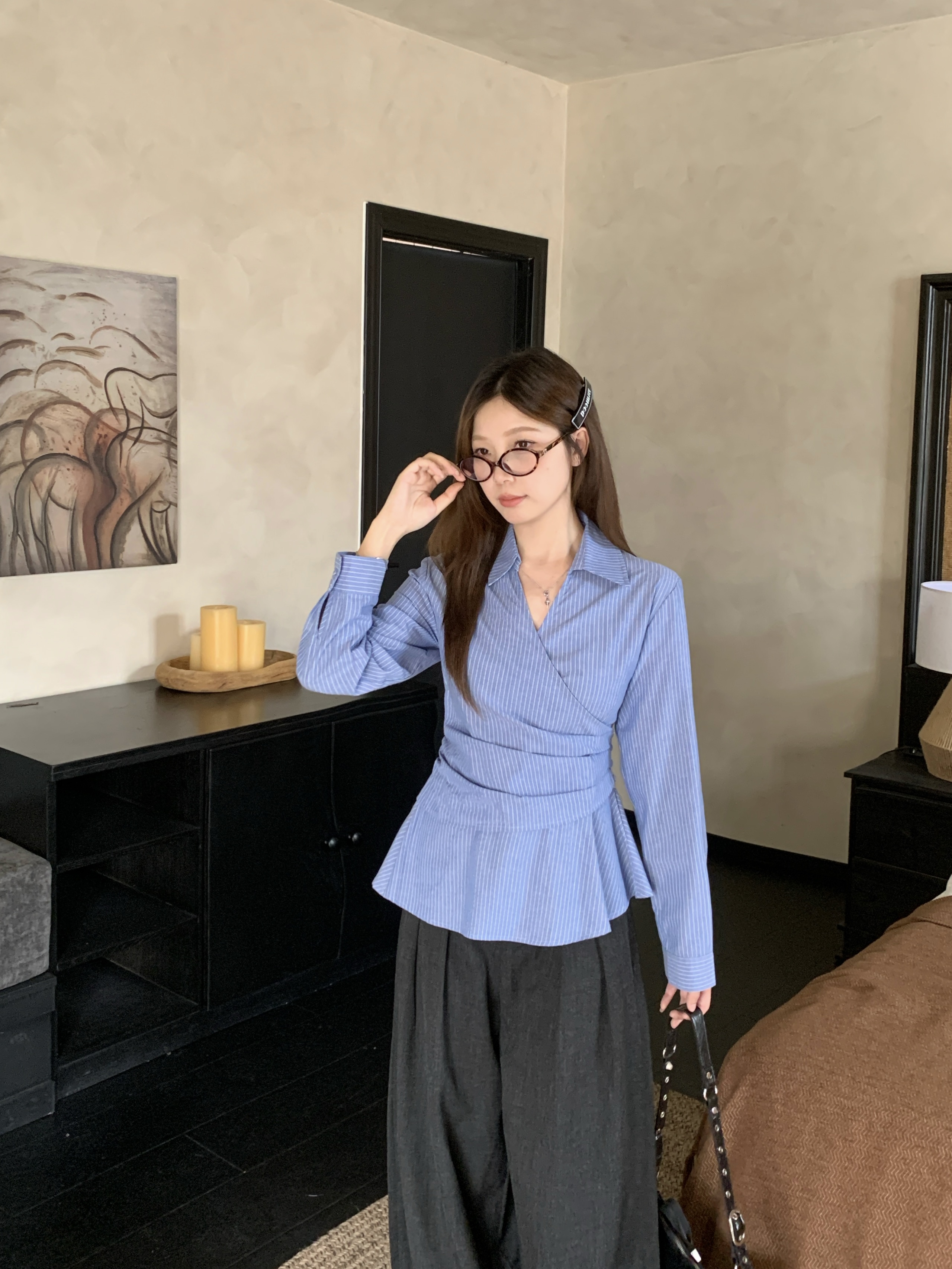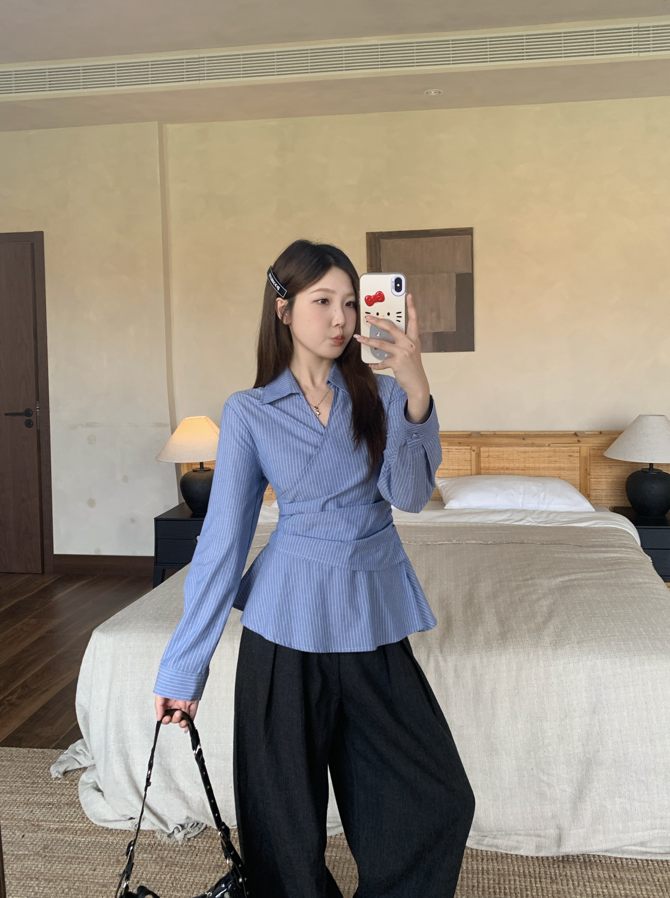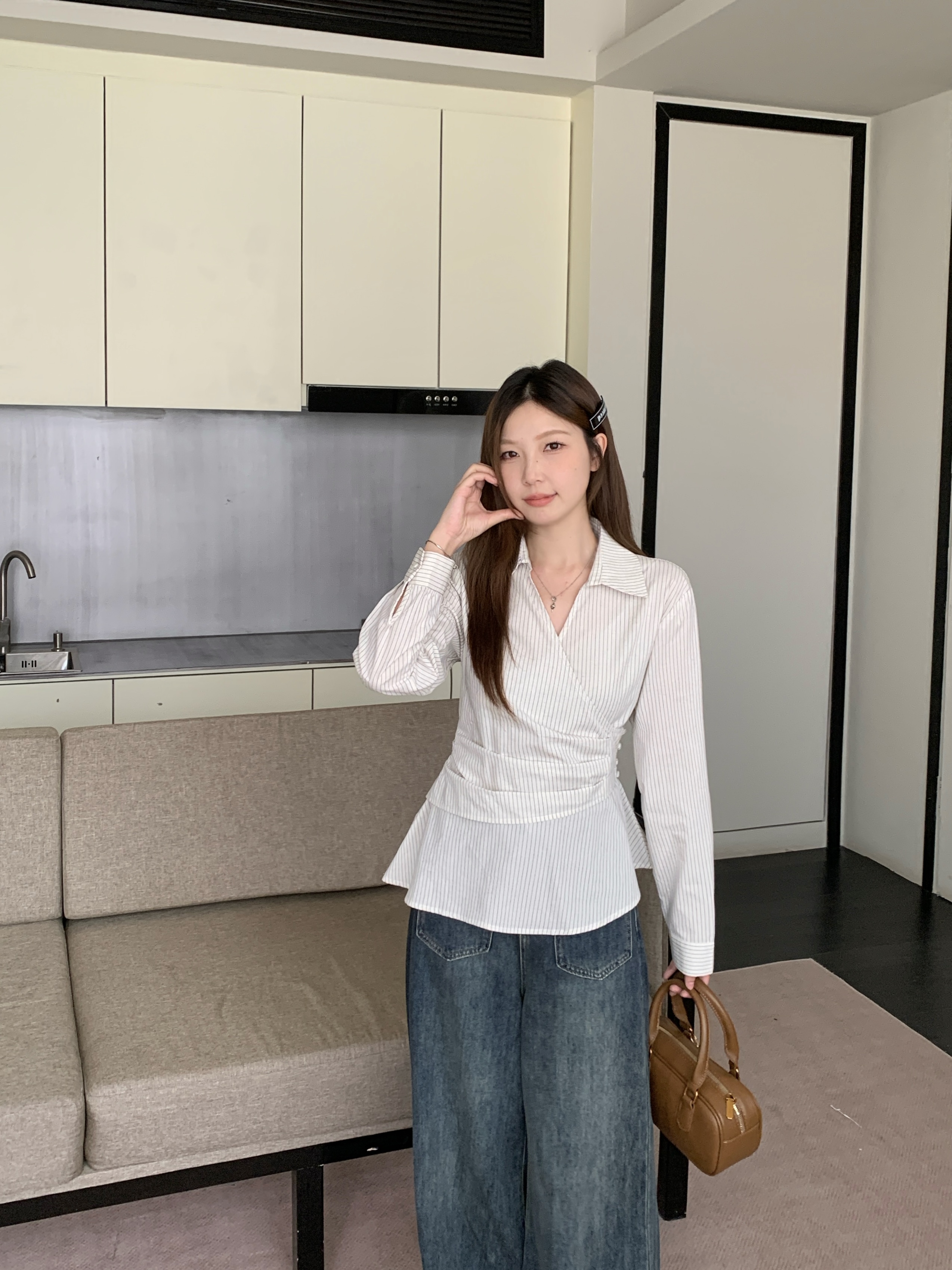 MY13838# 女裝貨源大码胖MM秋季新款韩系侧边纽扣收腰显瘦衬衫条纹百搭上衣女裝貨源服裝批發服裝批發