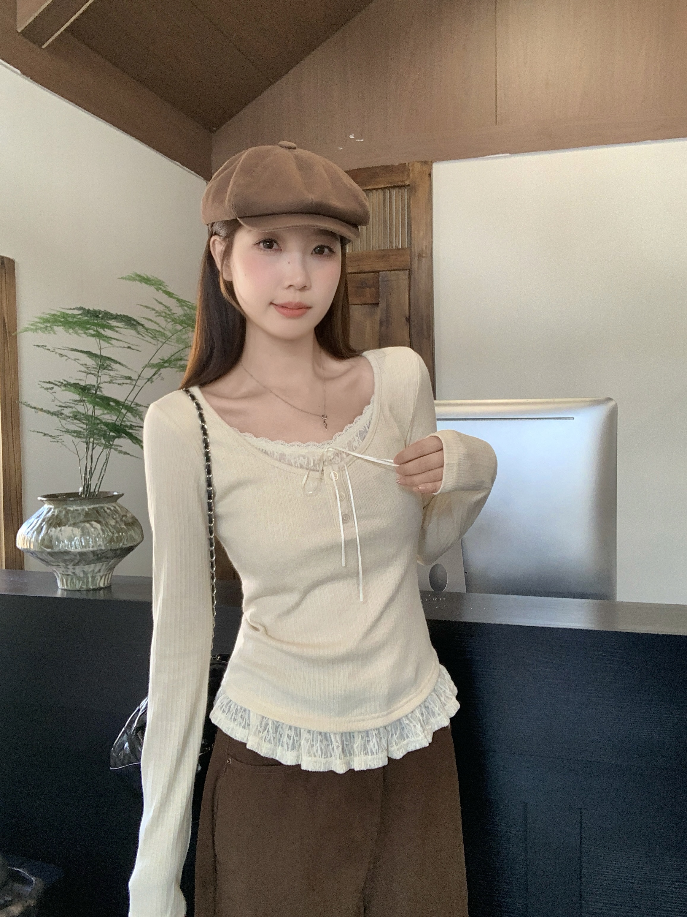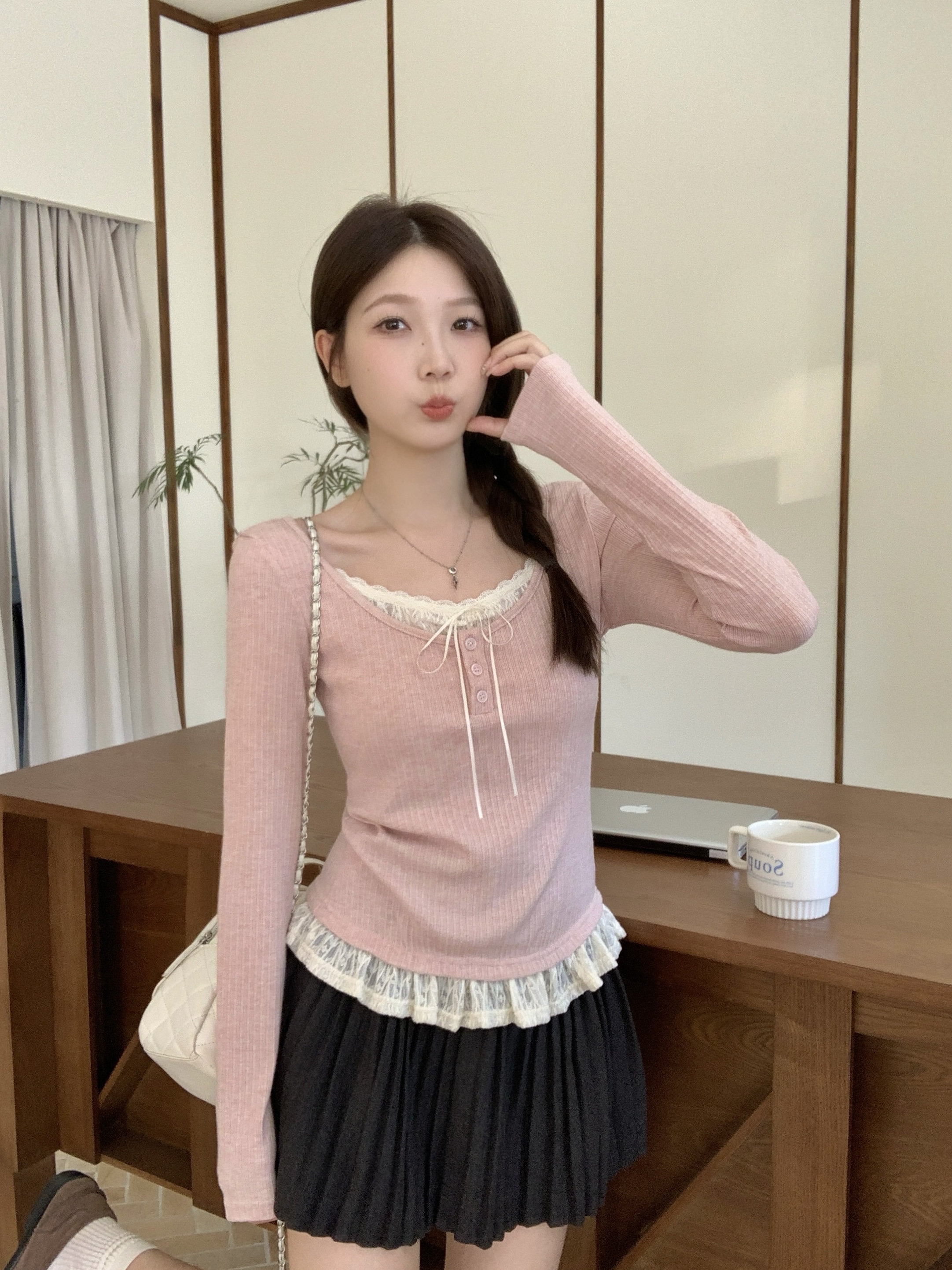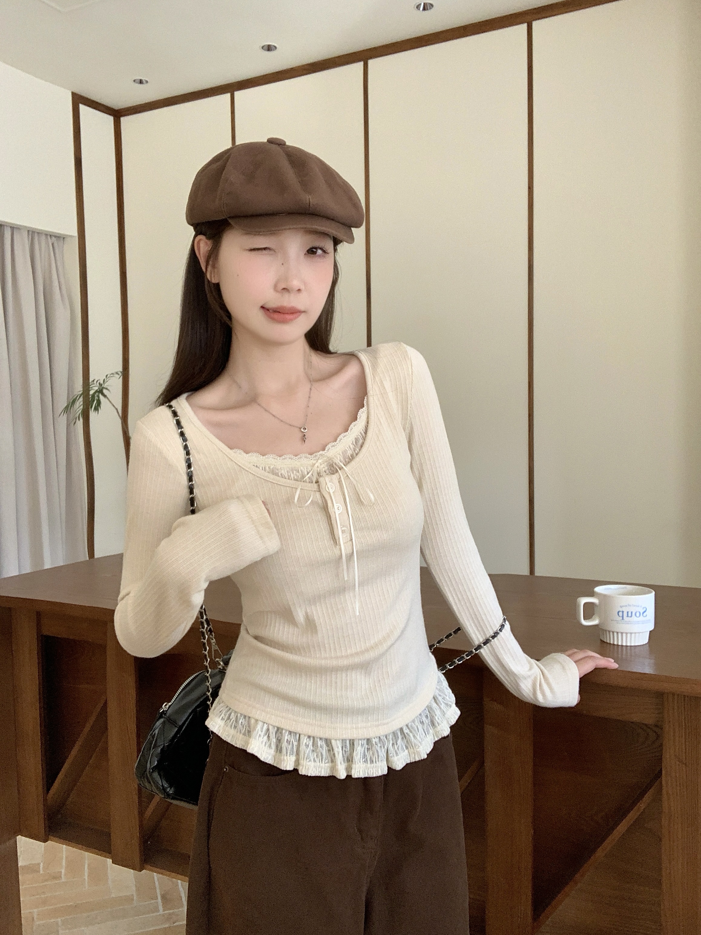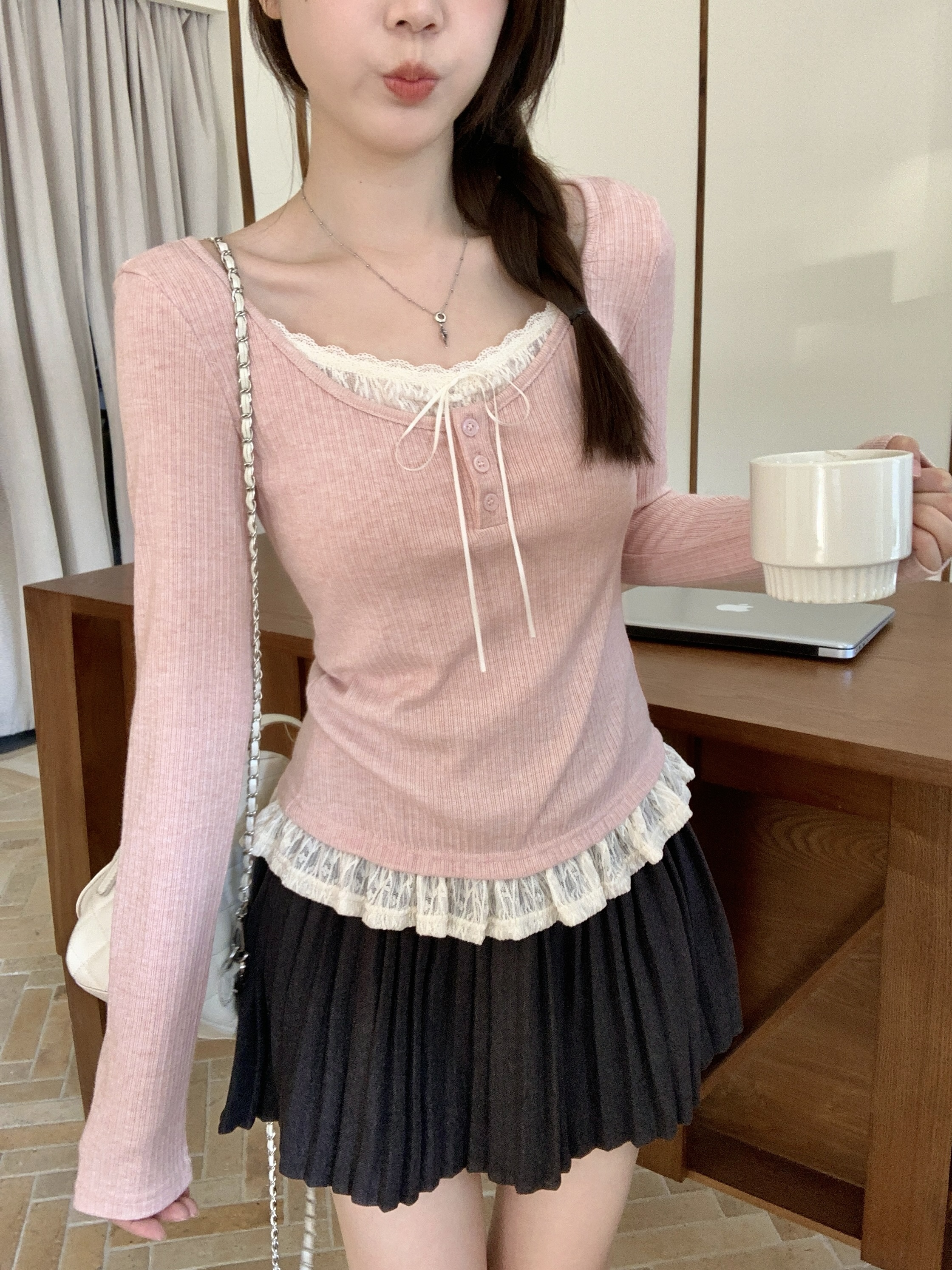 MY13839# 女裝貨源大码胖MM秋冬新款韩系纯欲氛围感蕾丝假两件长袖T恤百搭上衣女裝貨源服裝批發服裝批發