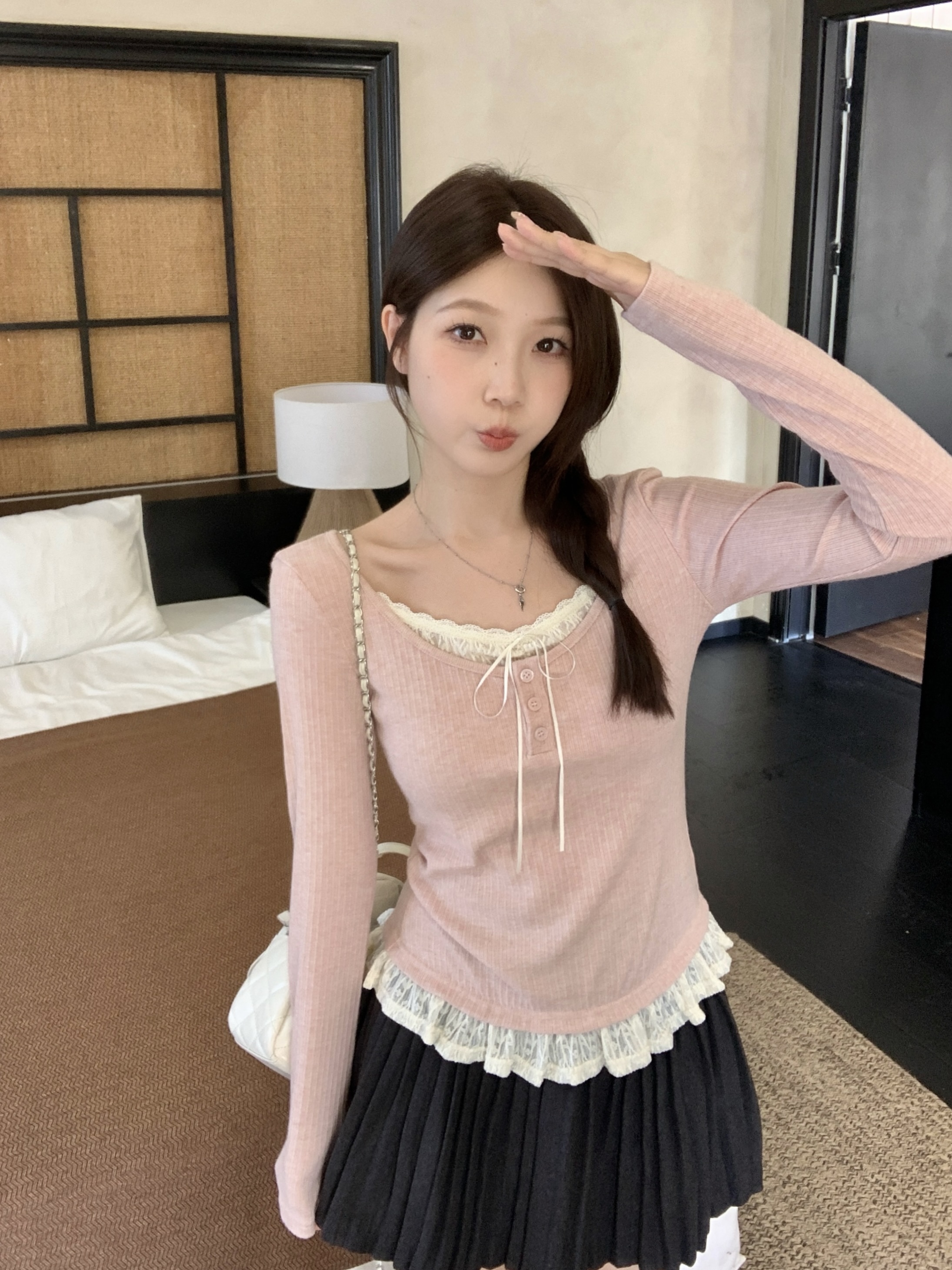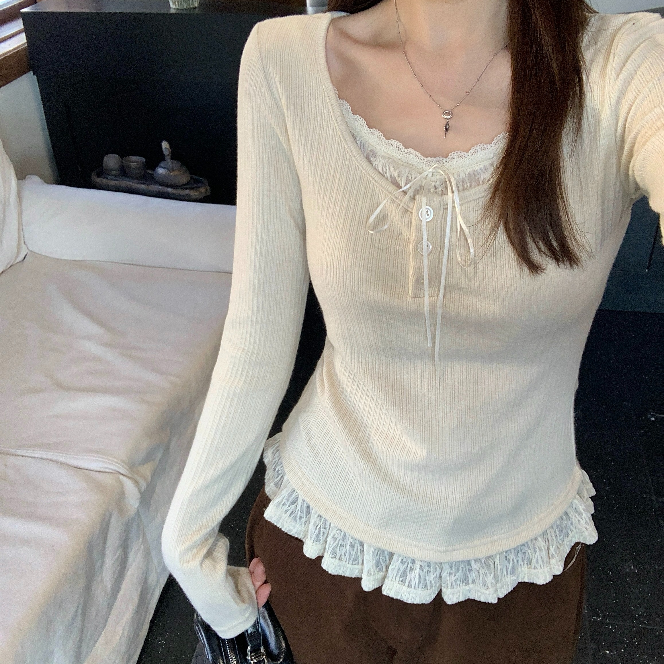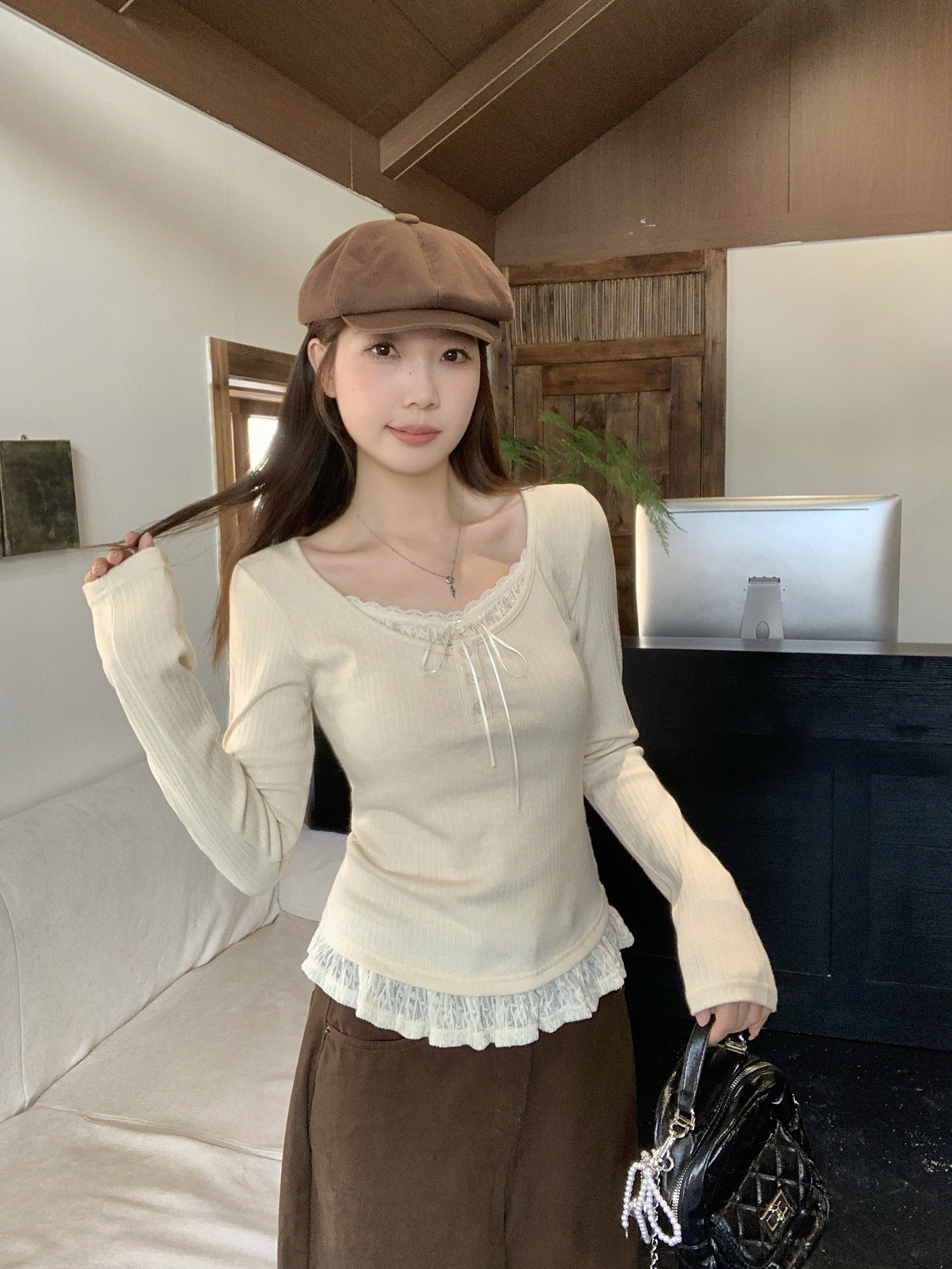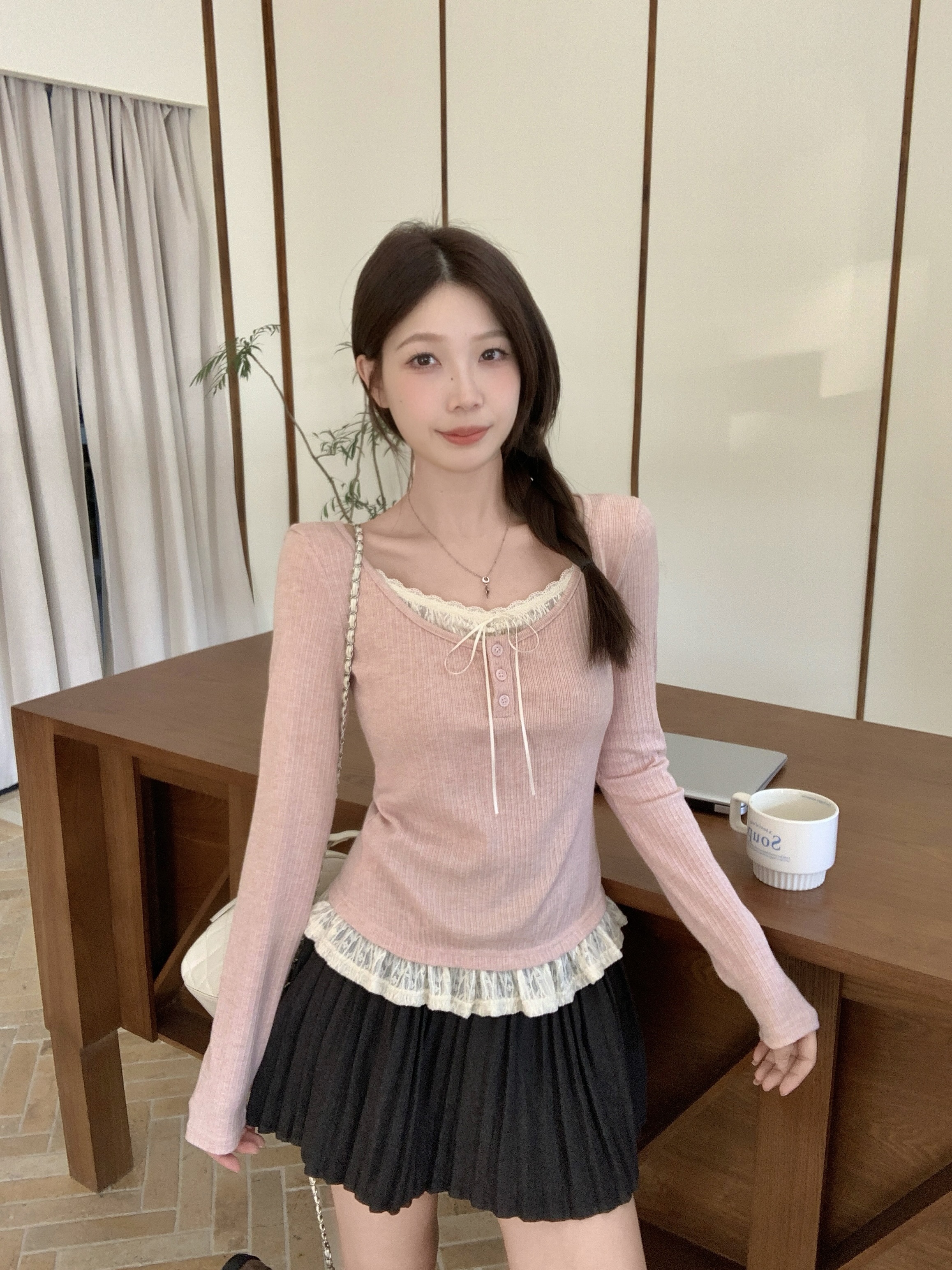 MY13839# 女裝貨源大码胖MM秋冬新款韩系纯欲氛围感蕾丝假两件长袖T恤百搭上衣女裝貨源服裝批發服裝批發