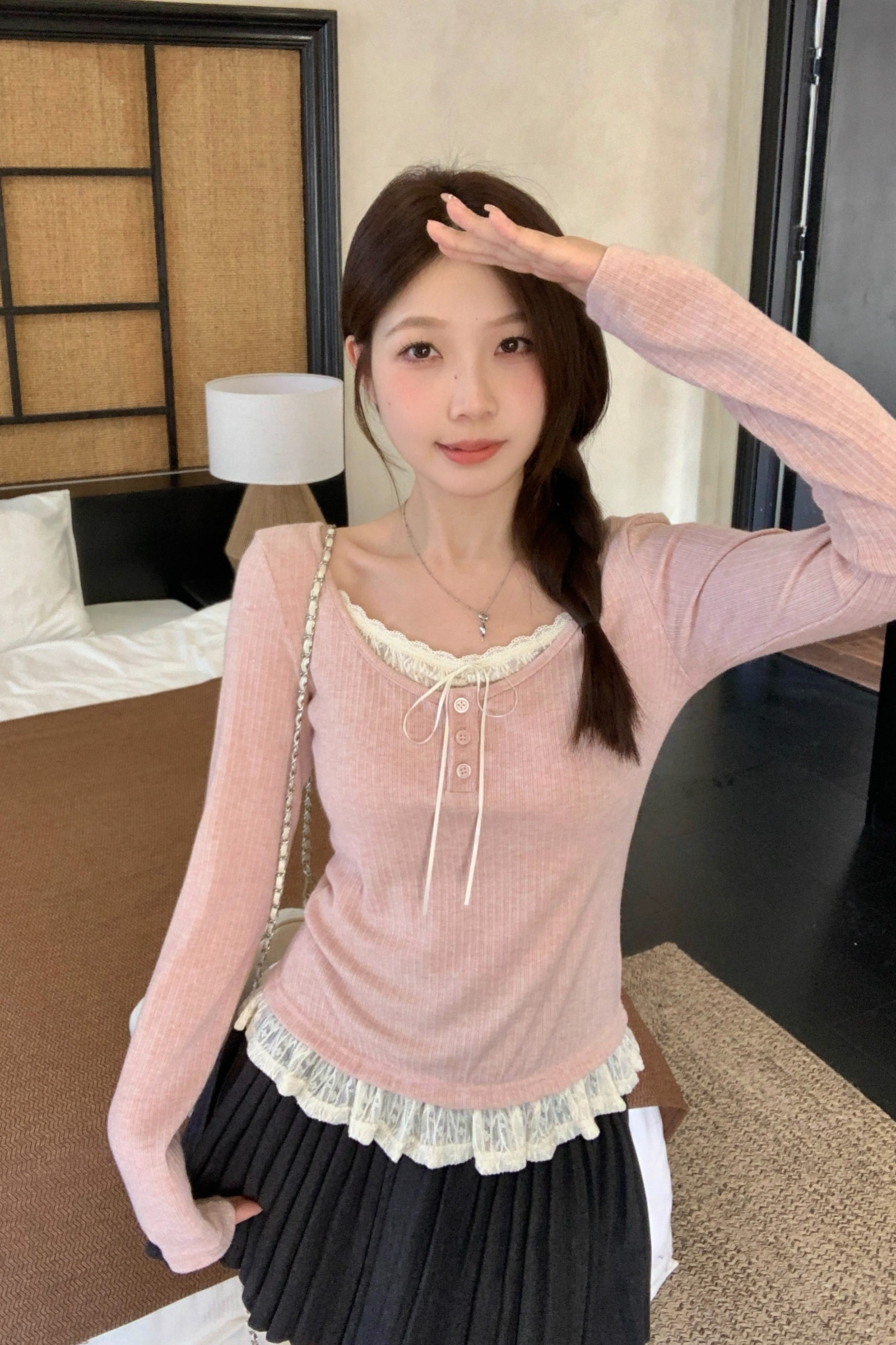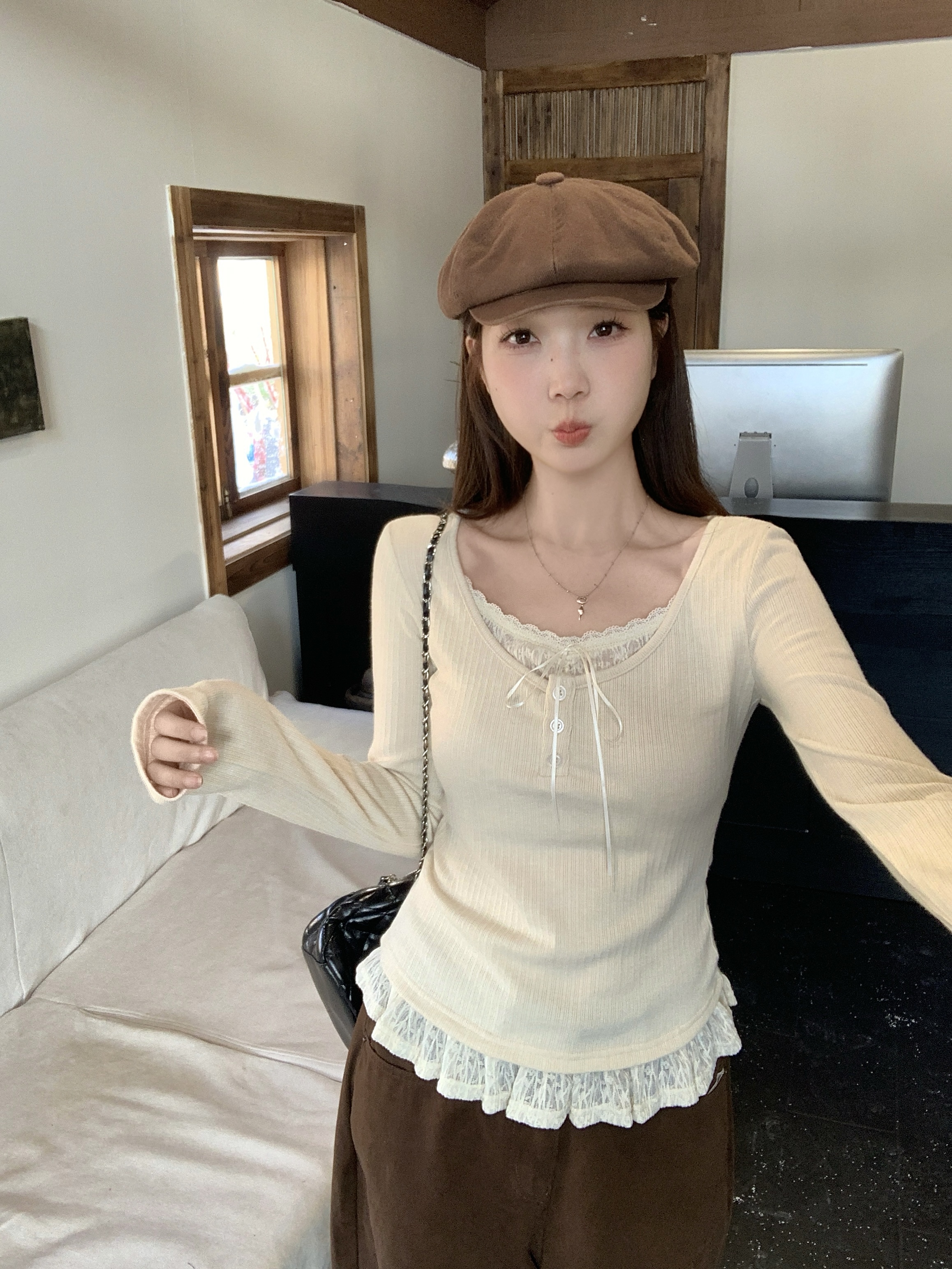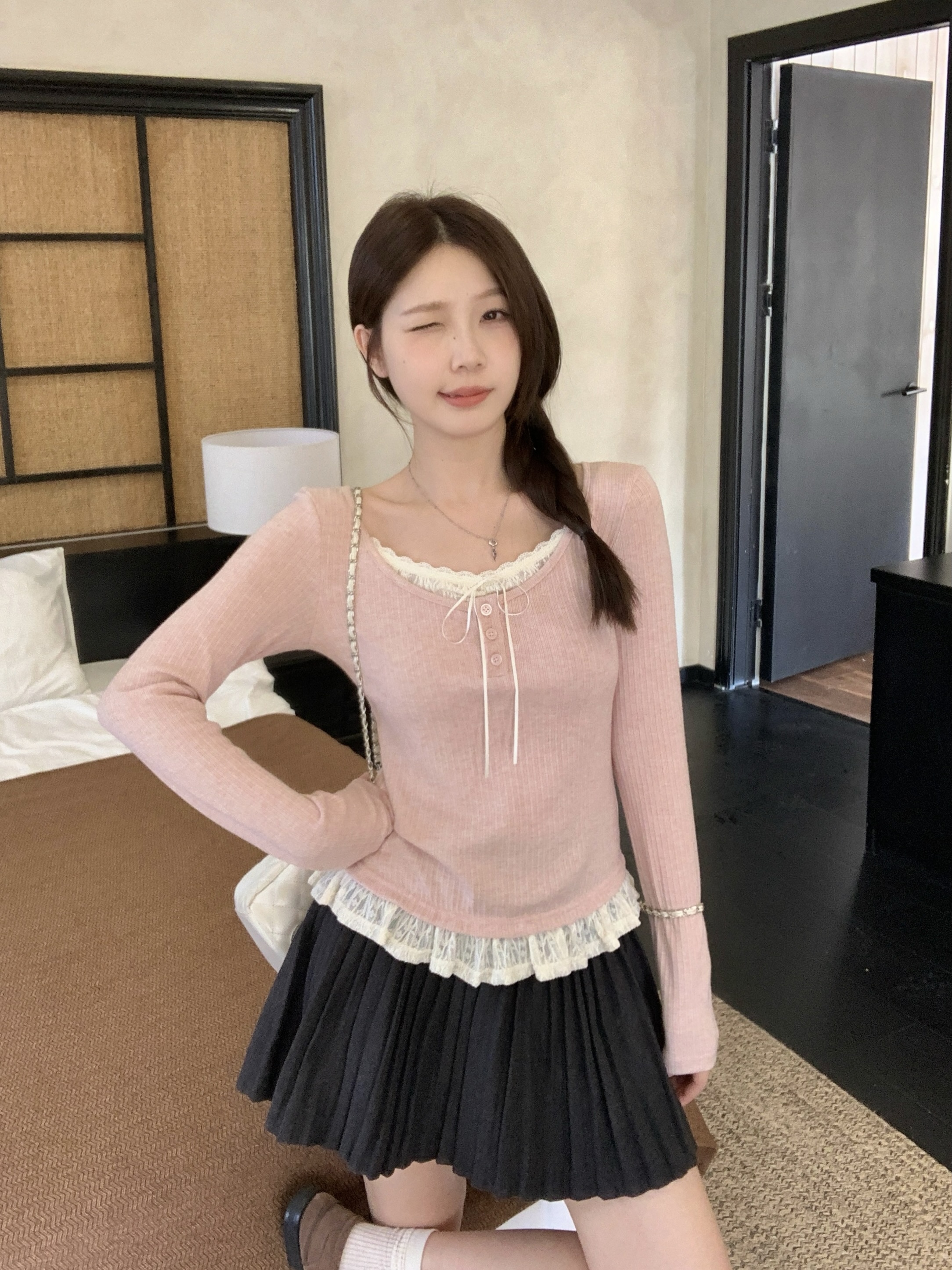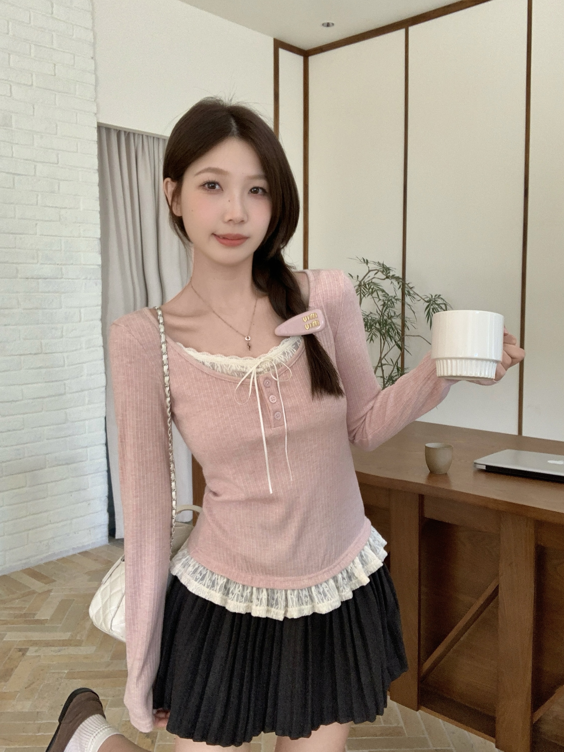 MY13839# 女裝貨源大码胖MM秋冬新款韩系纯欲氛围感蕾丝假两件长袖T恤百搭上衣女裝貨源服裝批發服裝批發