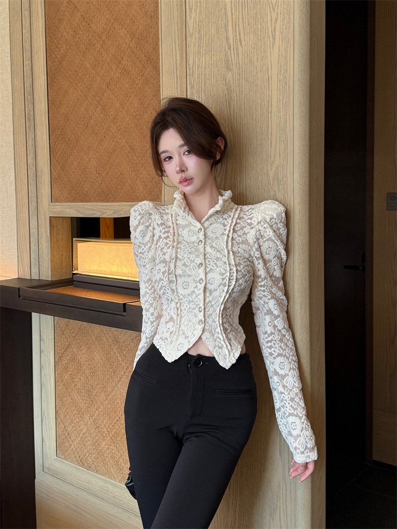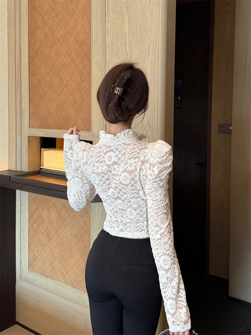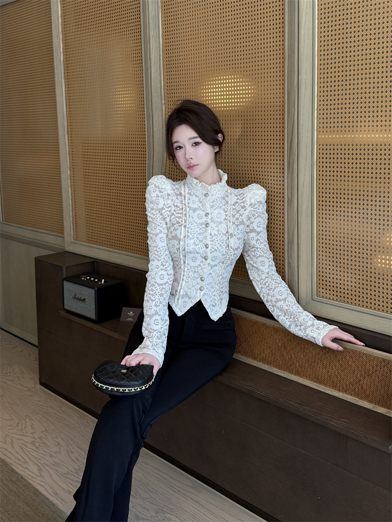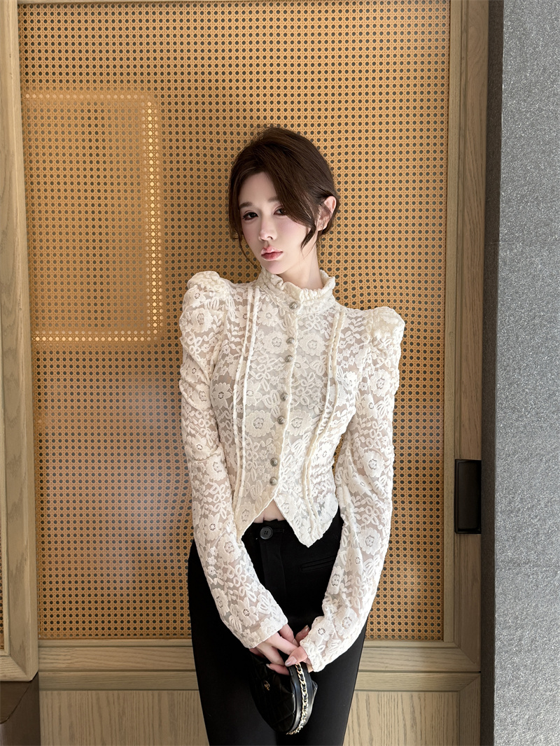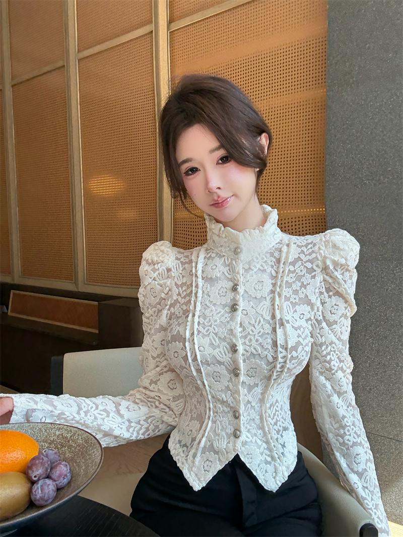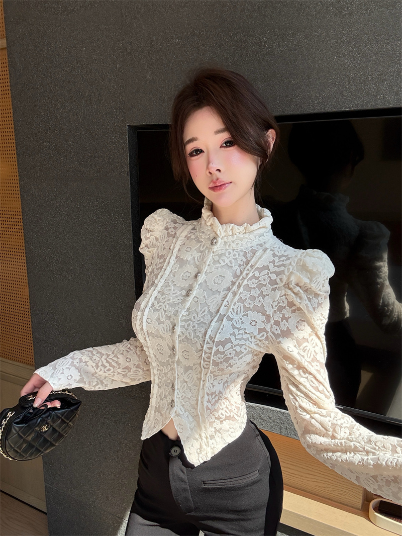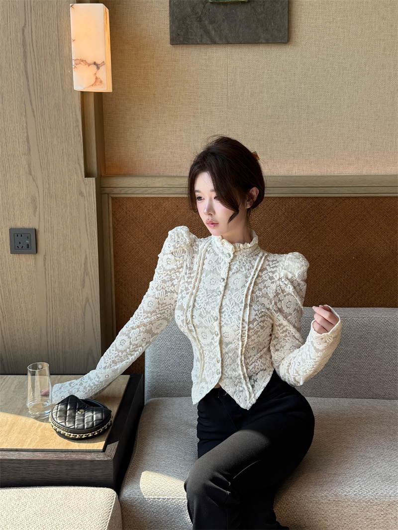 MY13846# 女裝貨源宫廷风蕾丝钩花泡泡袖衬衫女冬季加绒加厚打底法式小衫女裝貨源服裝批發服裝批發