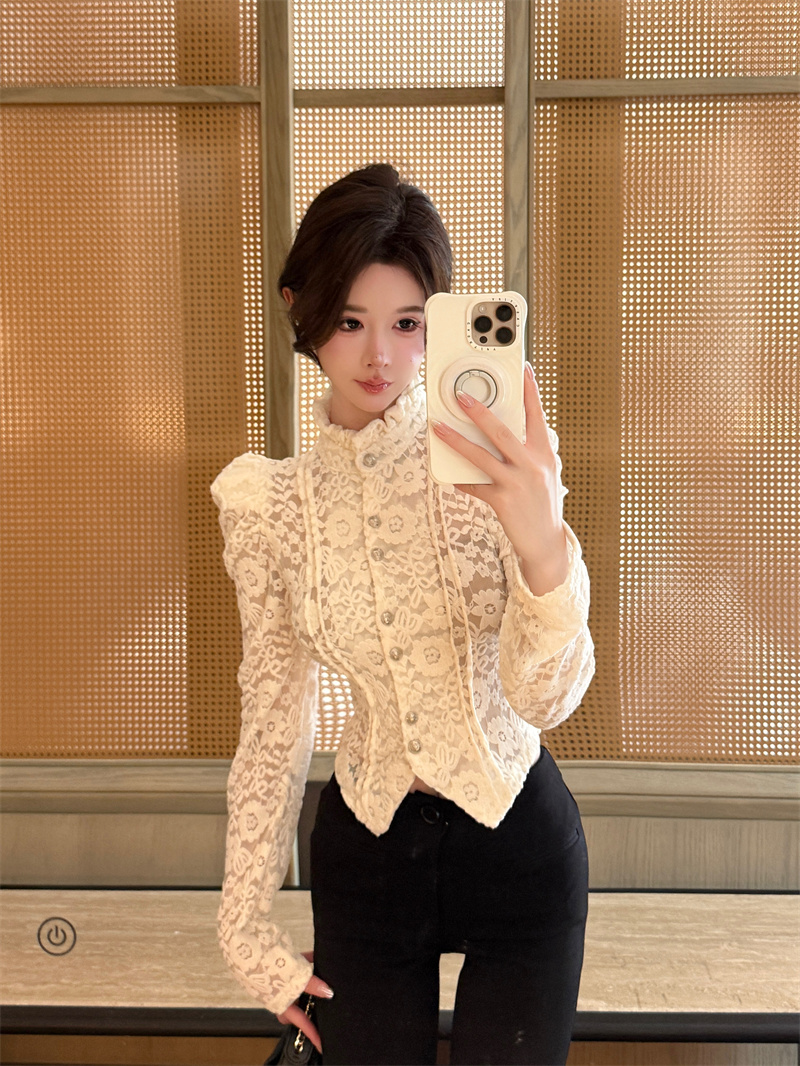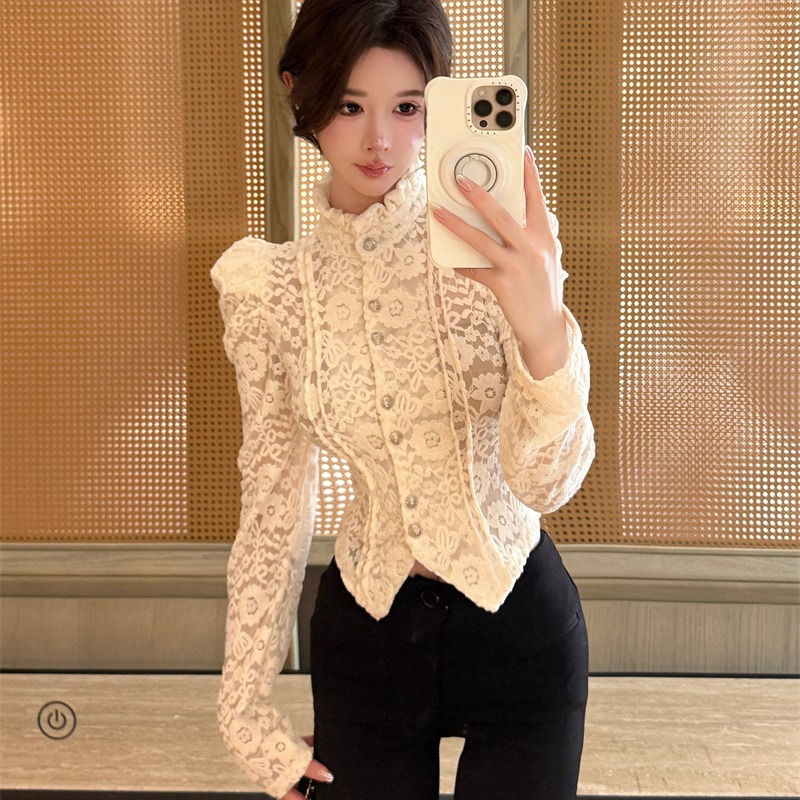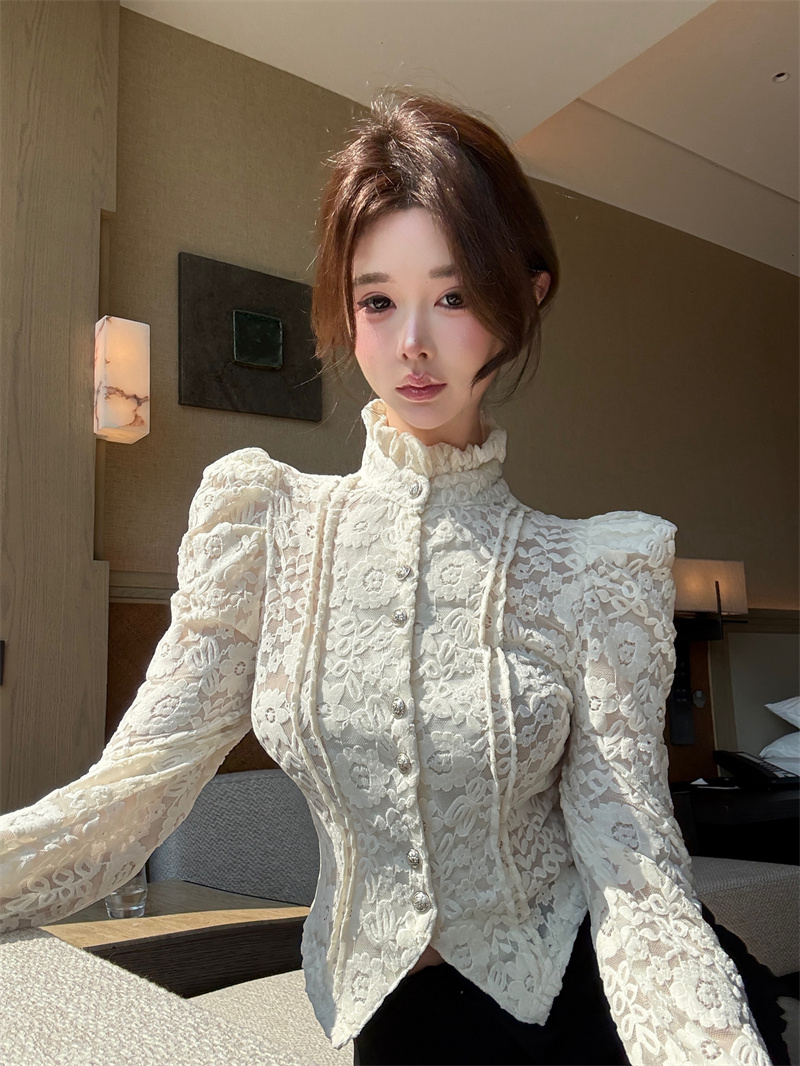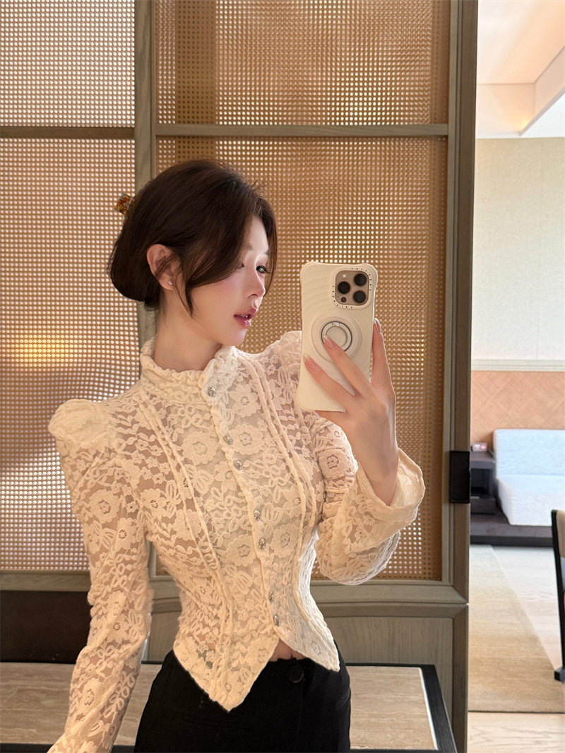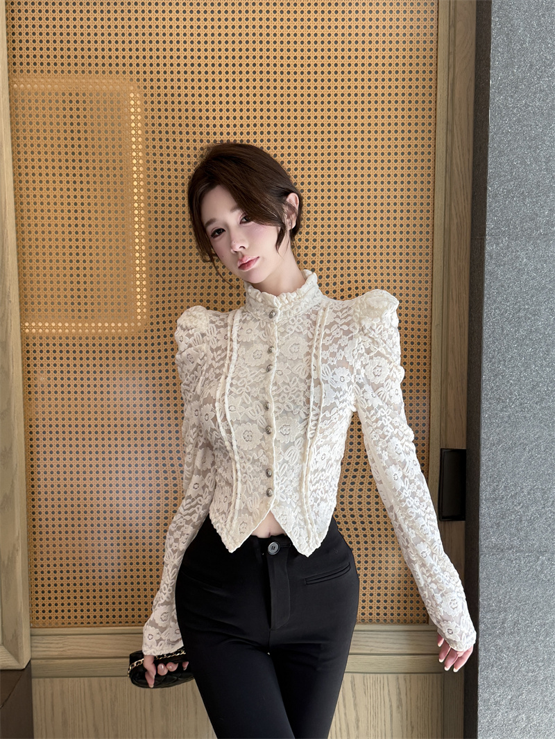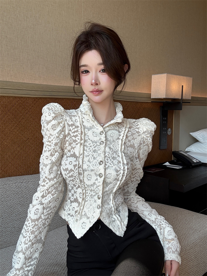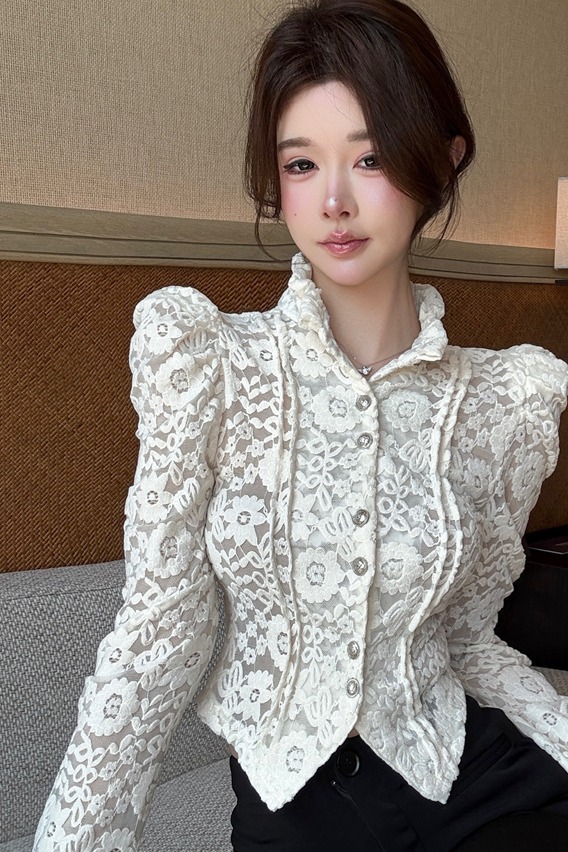 MY13846# 女裝貨源宫廷风蕾丝钩花泡泡袖衬衫女冬季加绒加厚打底法式小衫女裝貨源服裝批發服裝批發