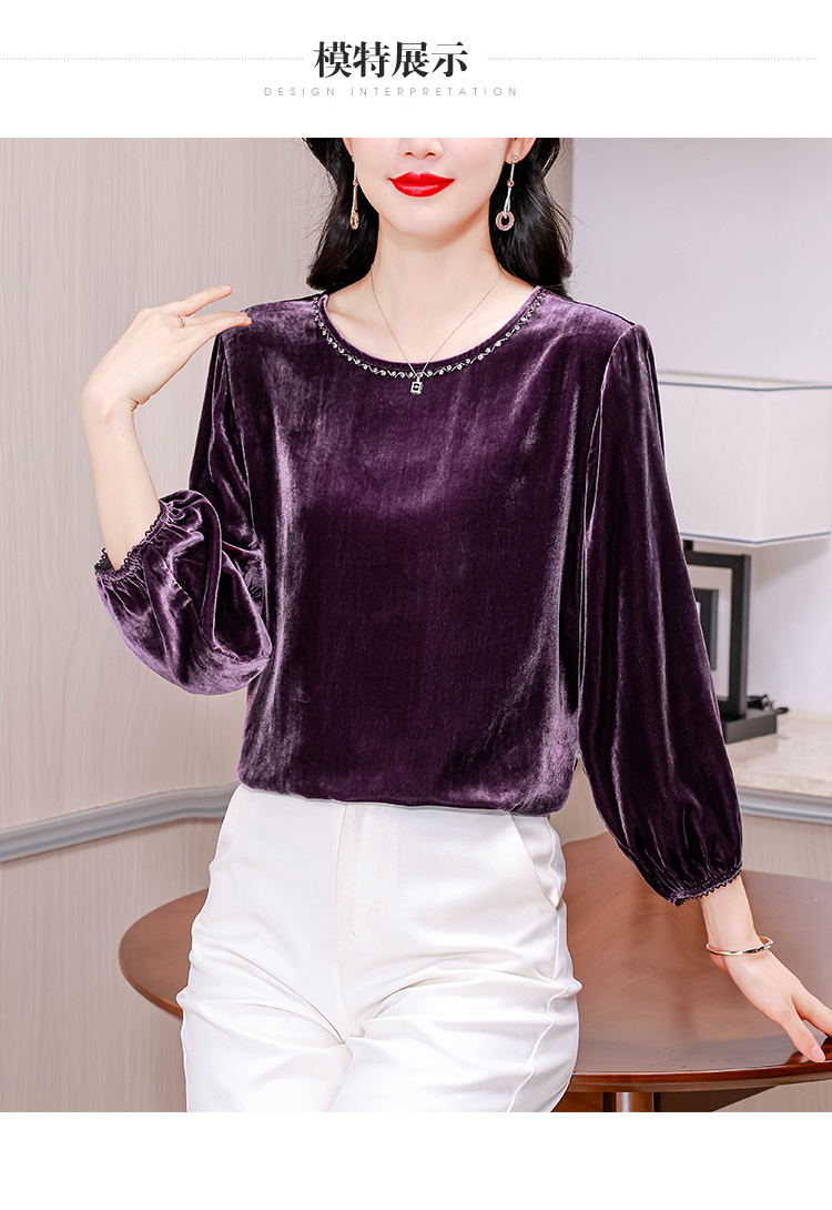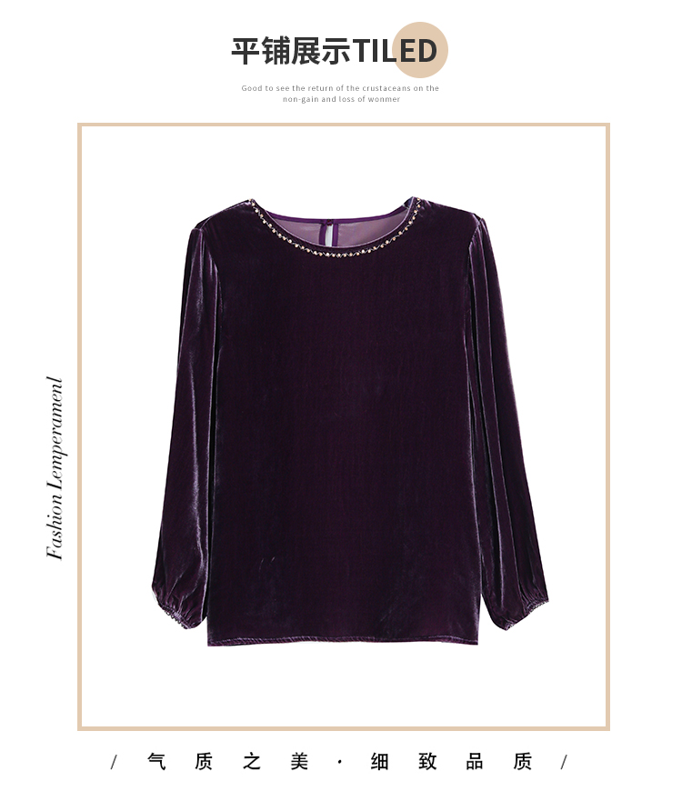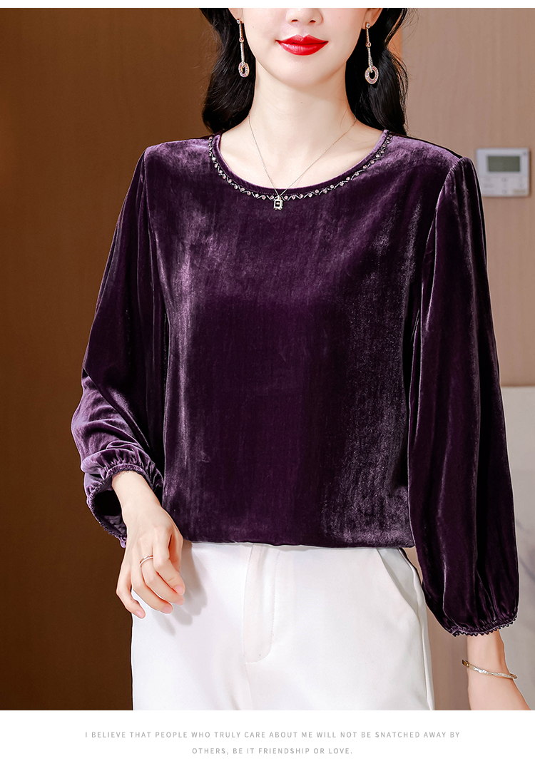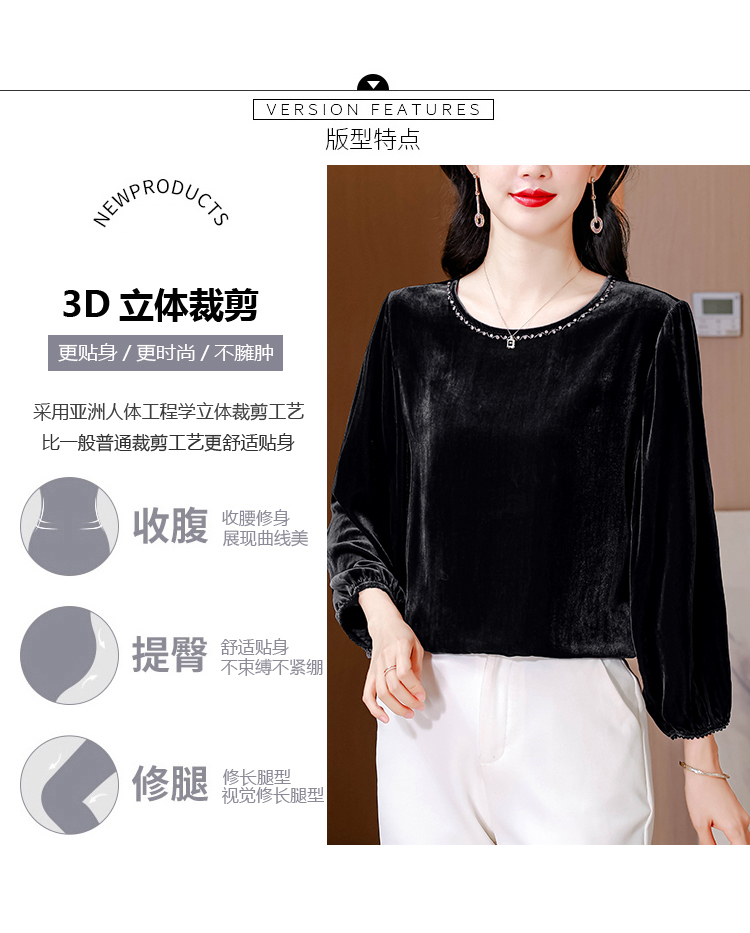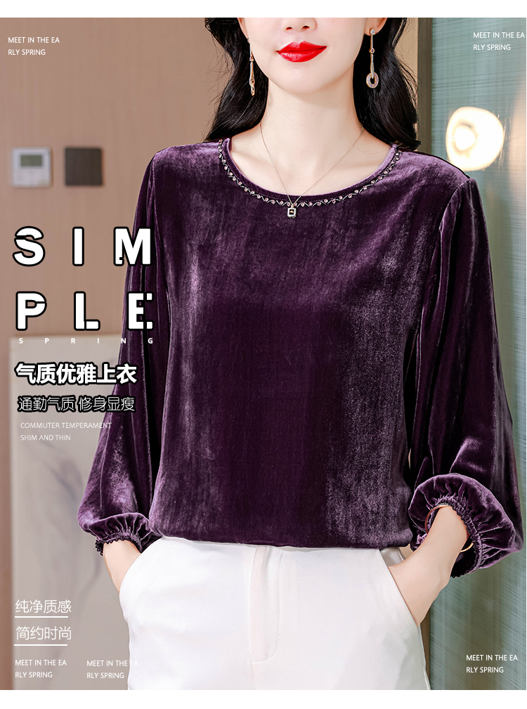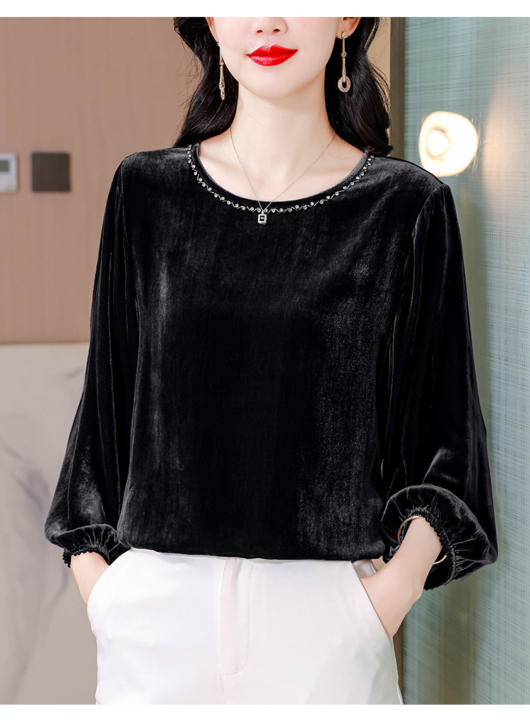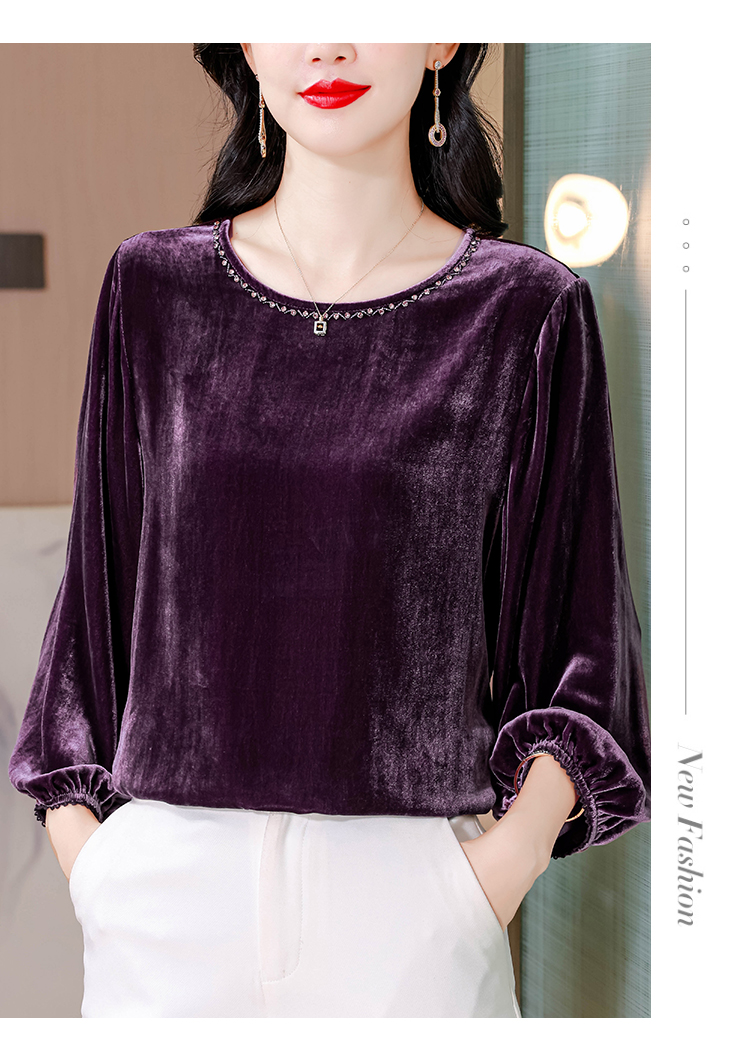 MY13872# 女裝貨源宽松大码显瘦灯笼袖领口钉钻真丝丝绒上衣女圆领女裝貨源服裝批發服裝批發