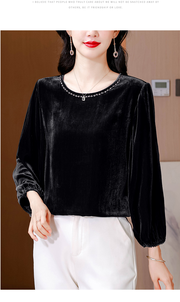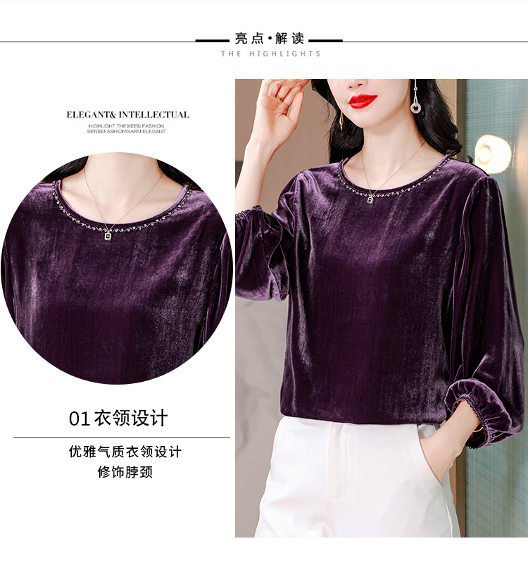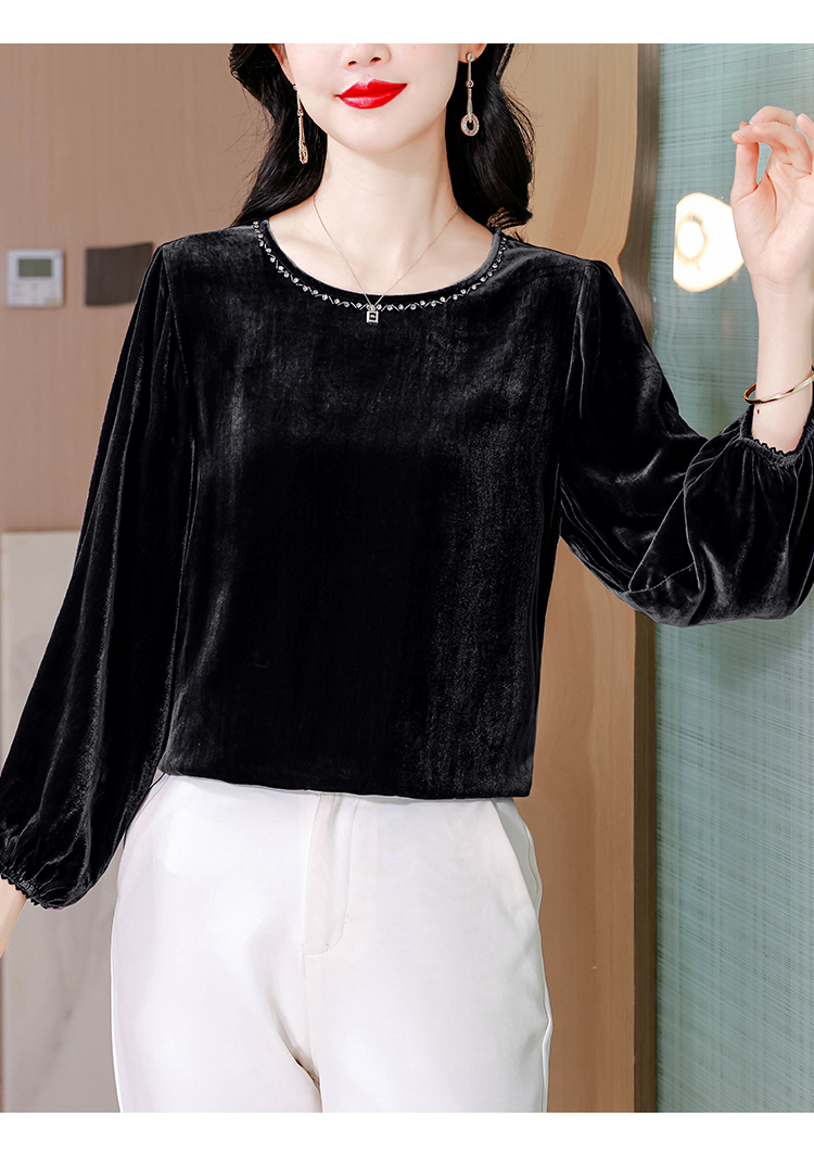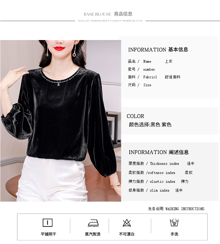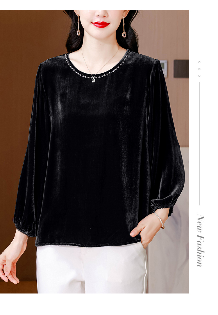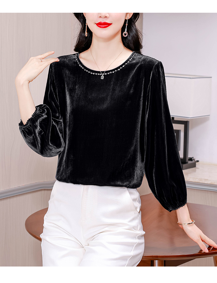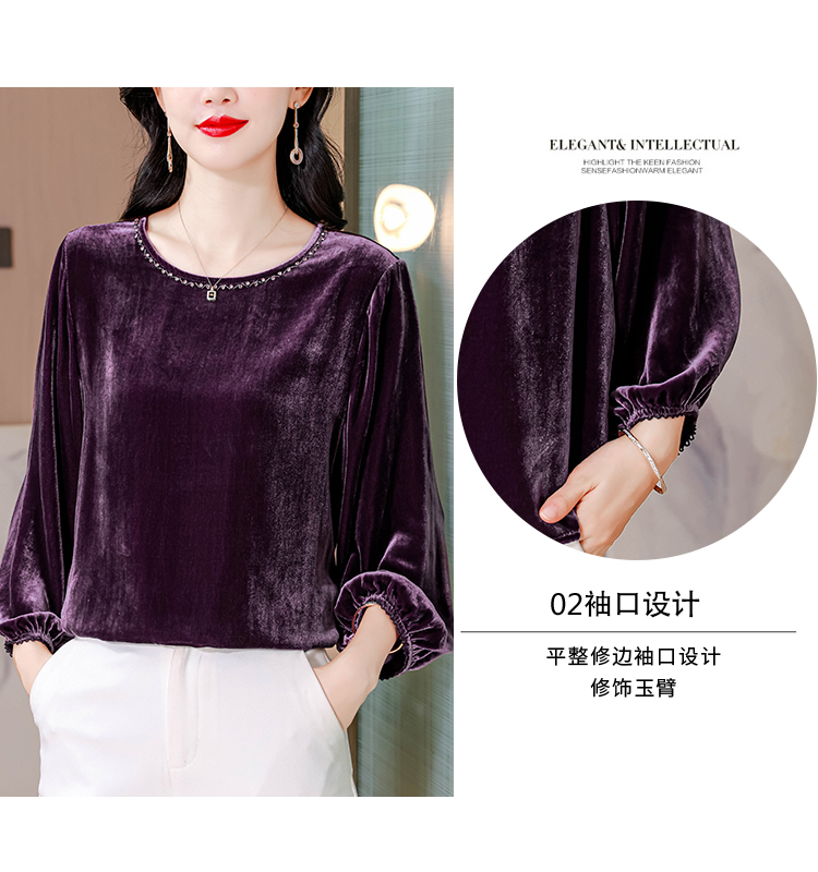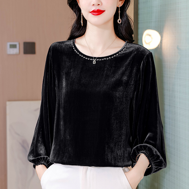 MY13872# 女裝貨源宽松大码显瘦灯笼袖领口钉钻真丝丝绒上衣女圆领女裝貨源服裝批發服裝批發