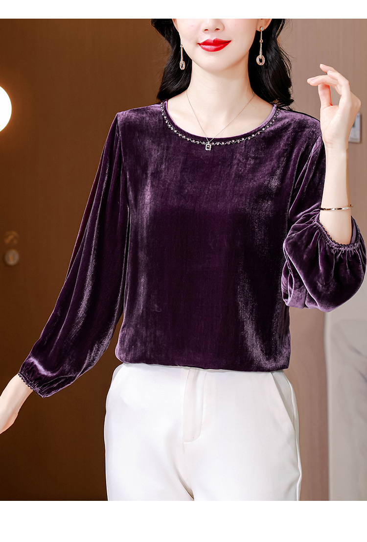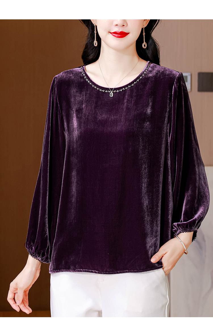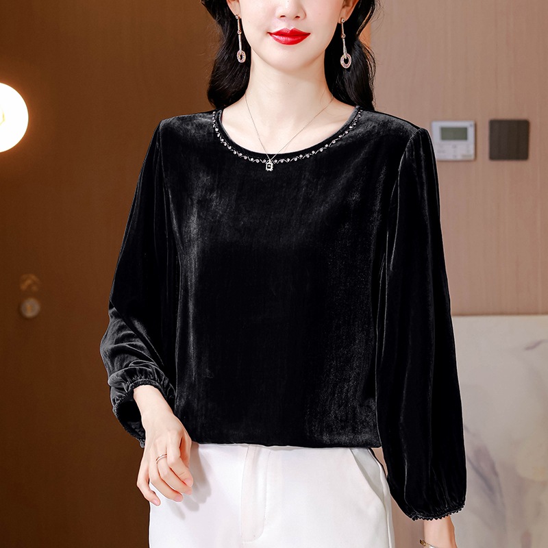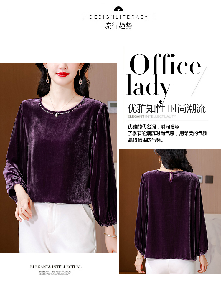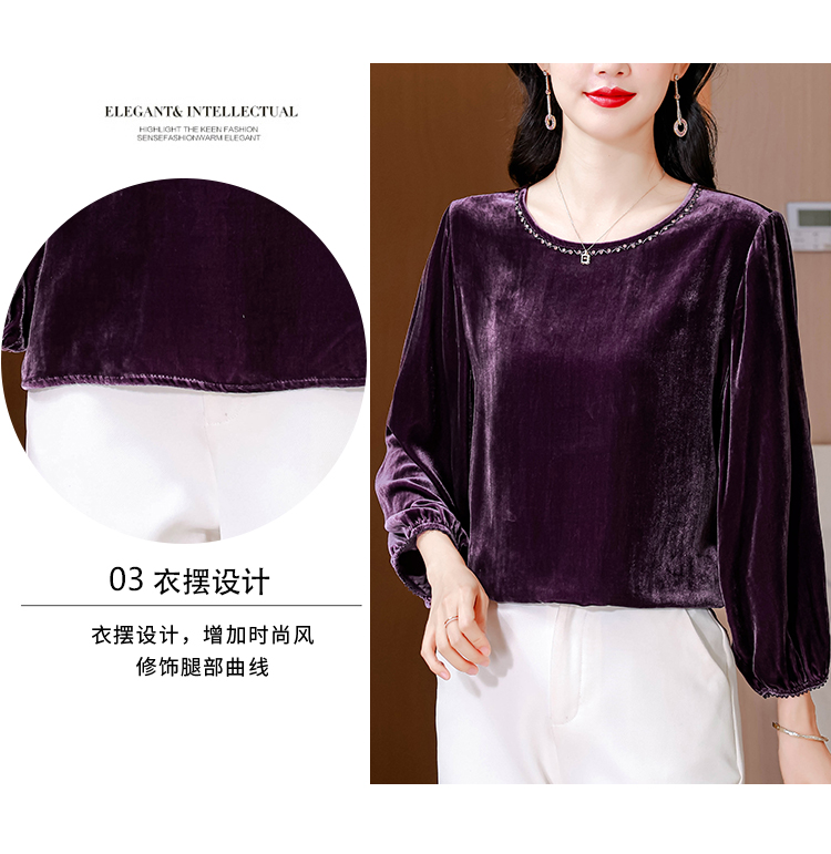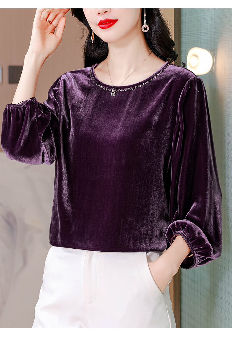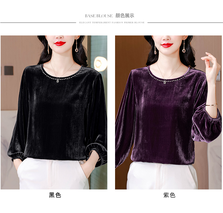 MY13872# 女裝貨源宽松大码显瘦灯笼袖领口钉钻真丝丝绒上衣女圆领女裝貨源服裝批發服裝批發