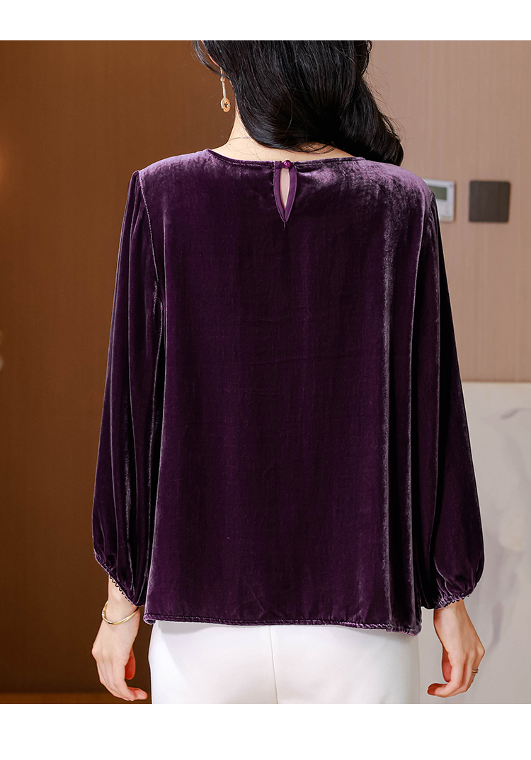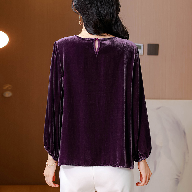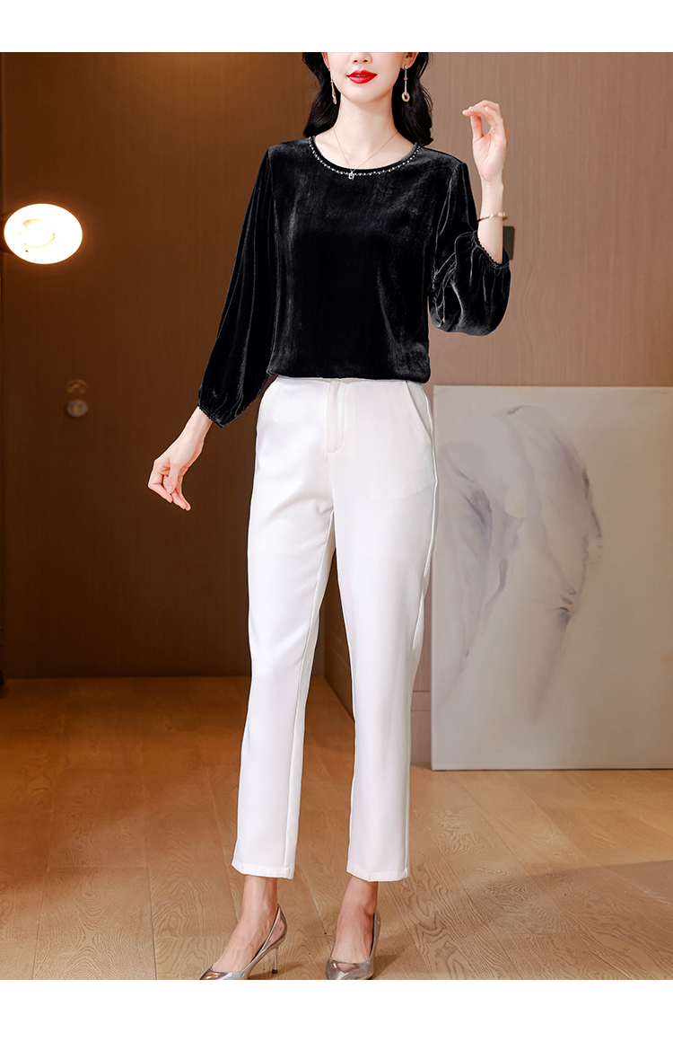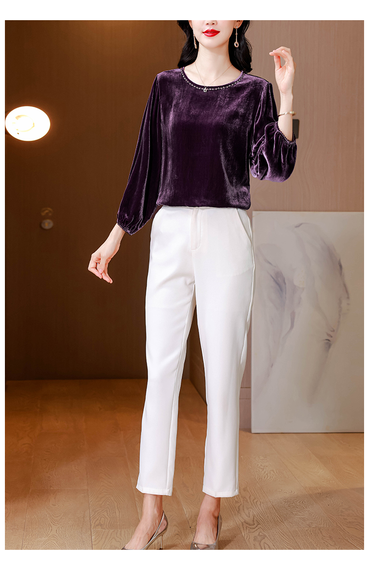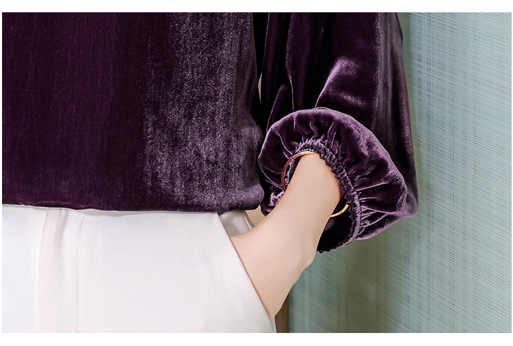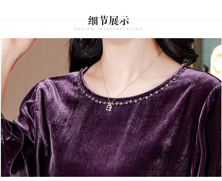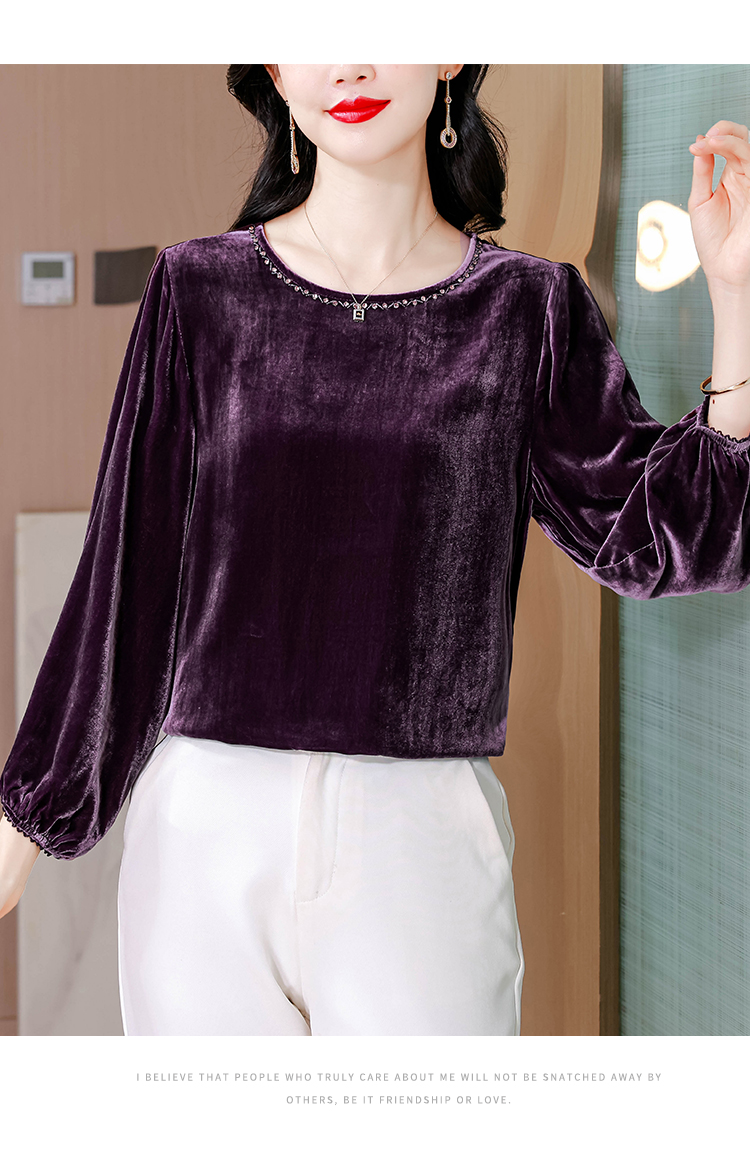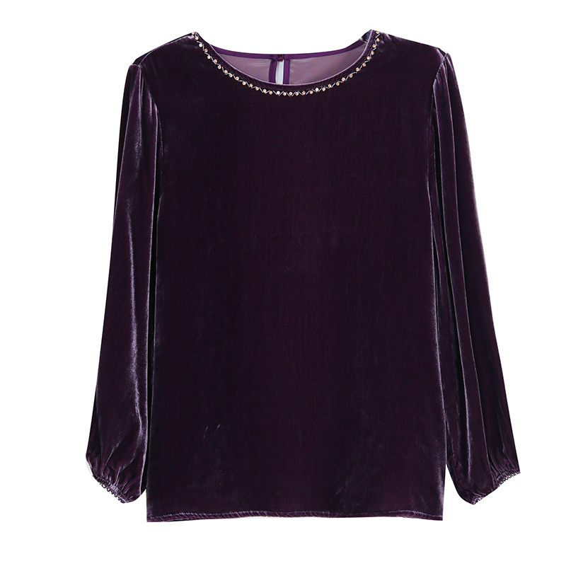 MY13872# 女裝貨源宽松大码显瘦灯笼袖领口钉钻真丝丝绒上衣女圆领女裝貨源服裝批發服裝批發