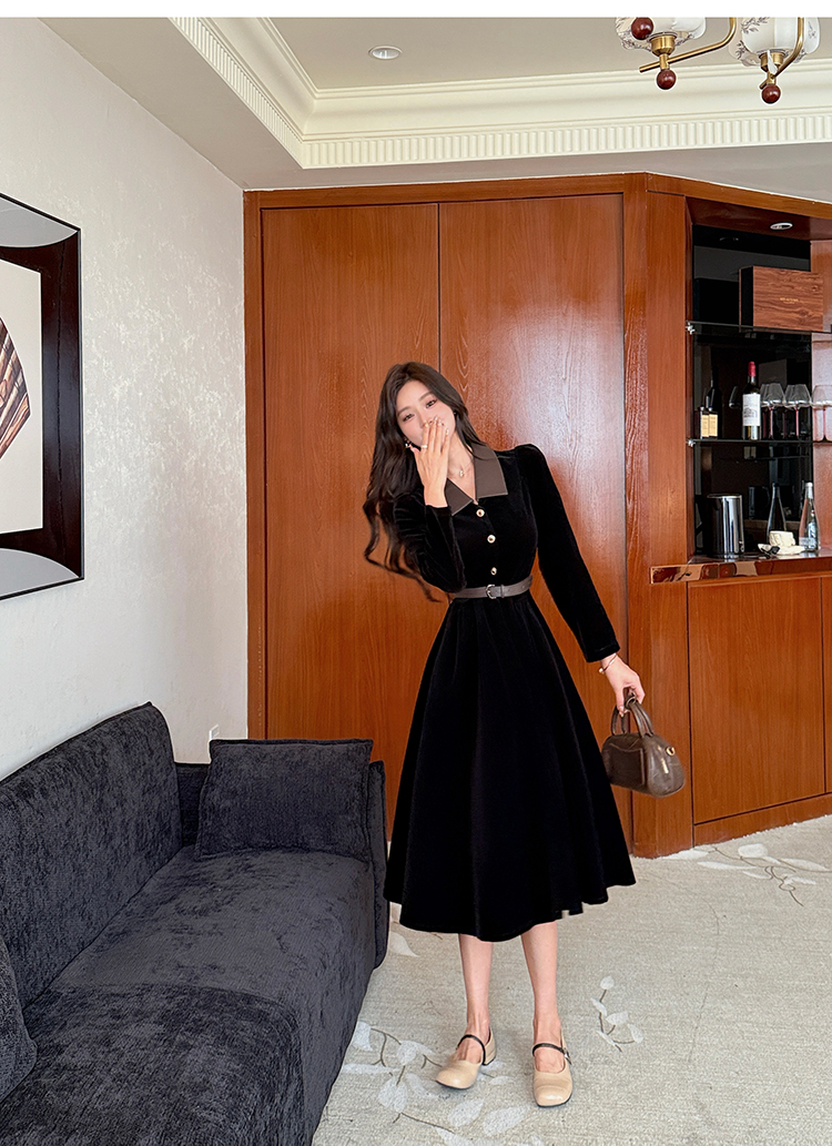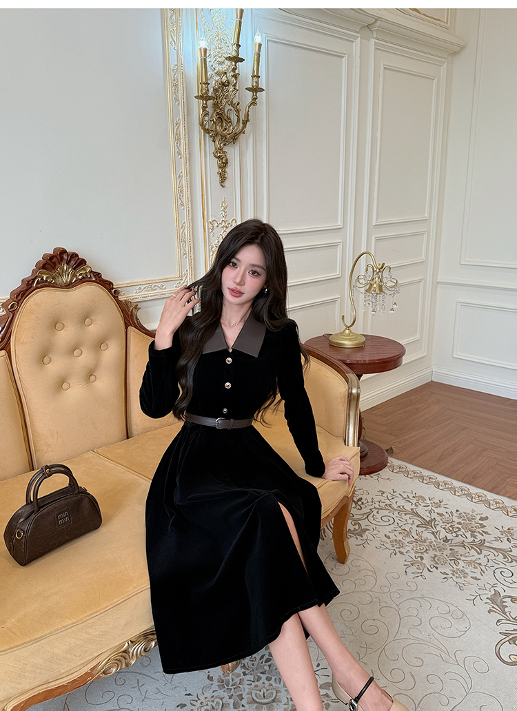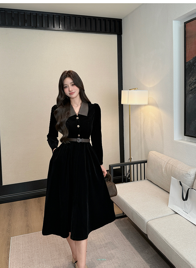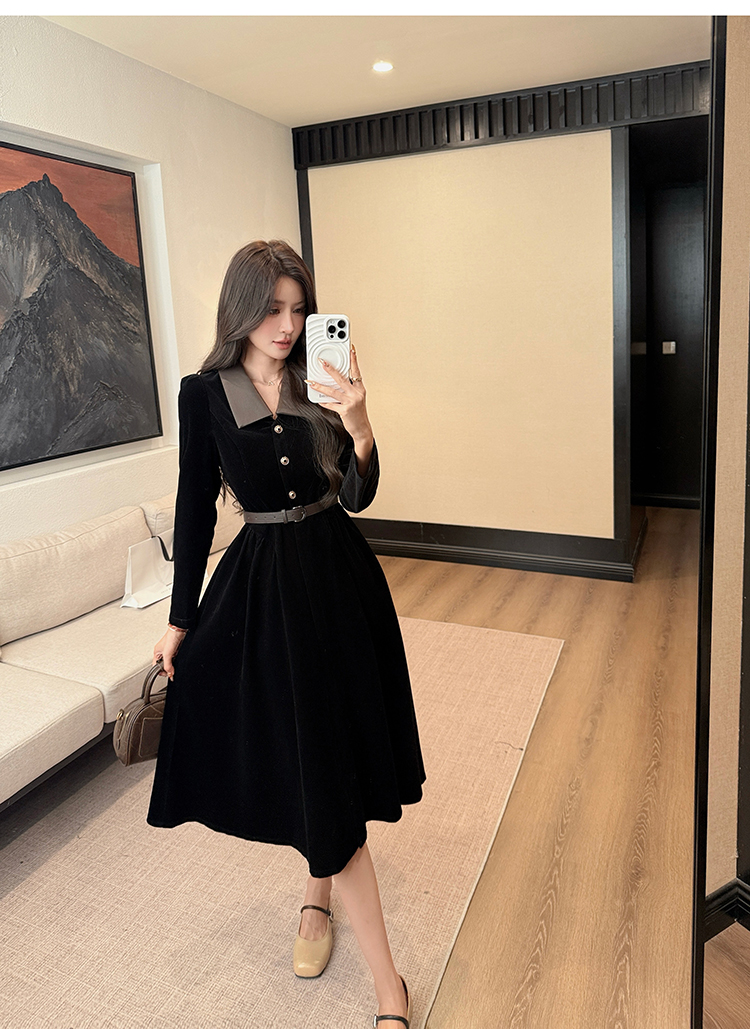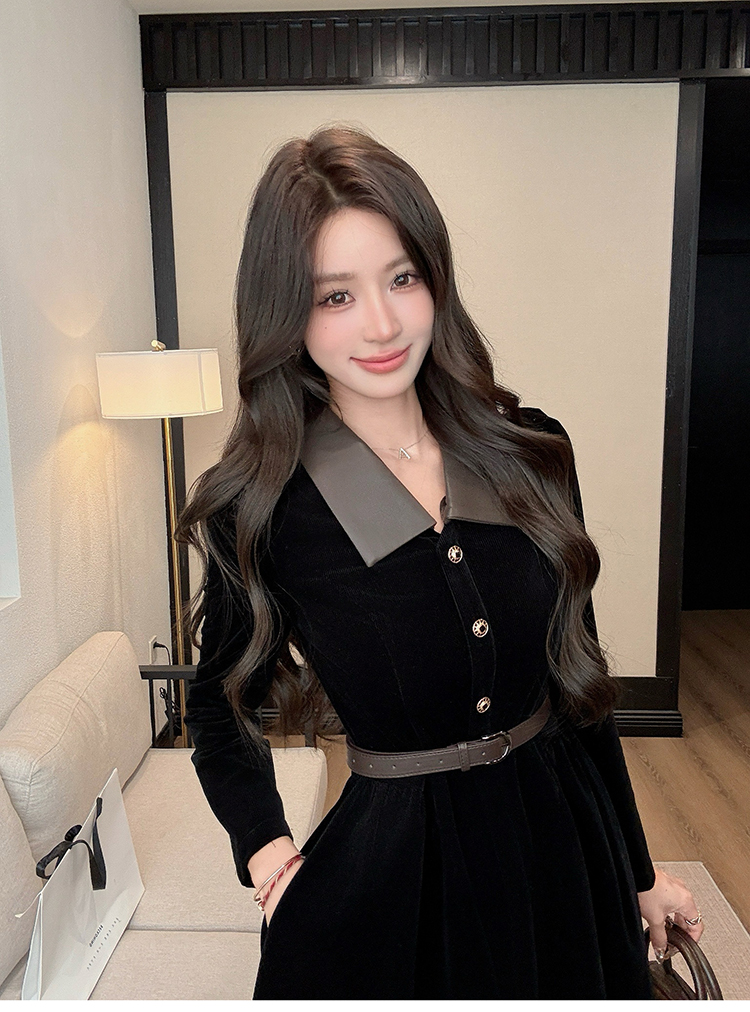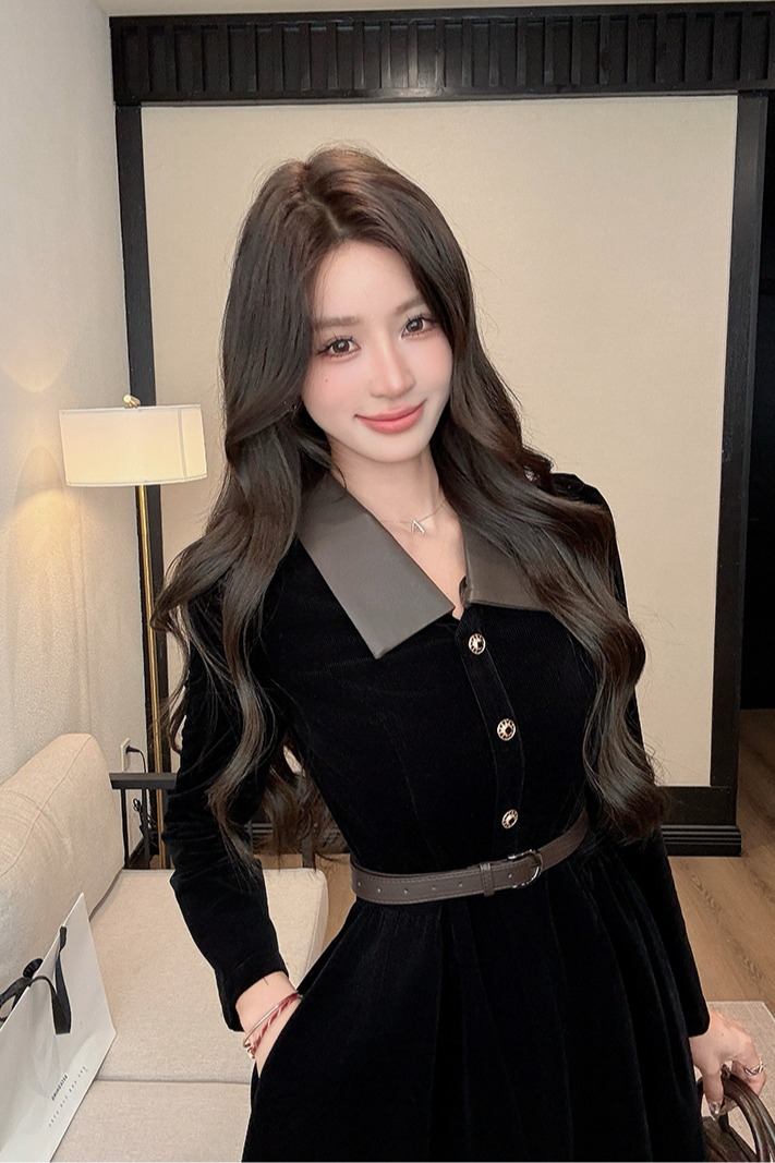 MY14049# 秋田谷黑色长袖连衣裙修身气质灯芯绒法式长裙女女裝貨源服裝批發