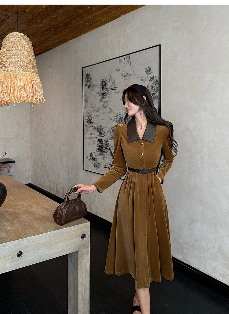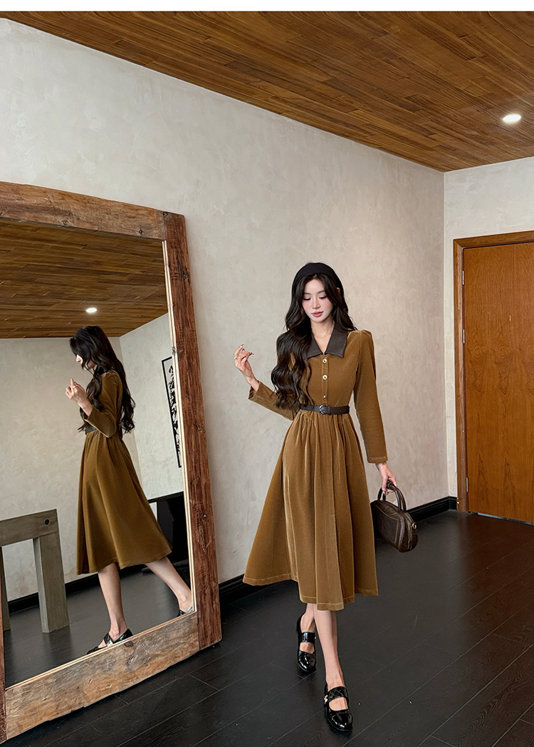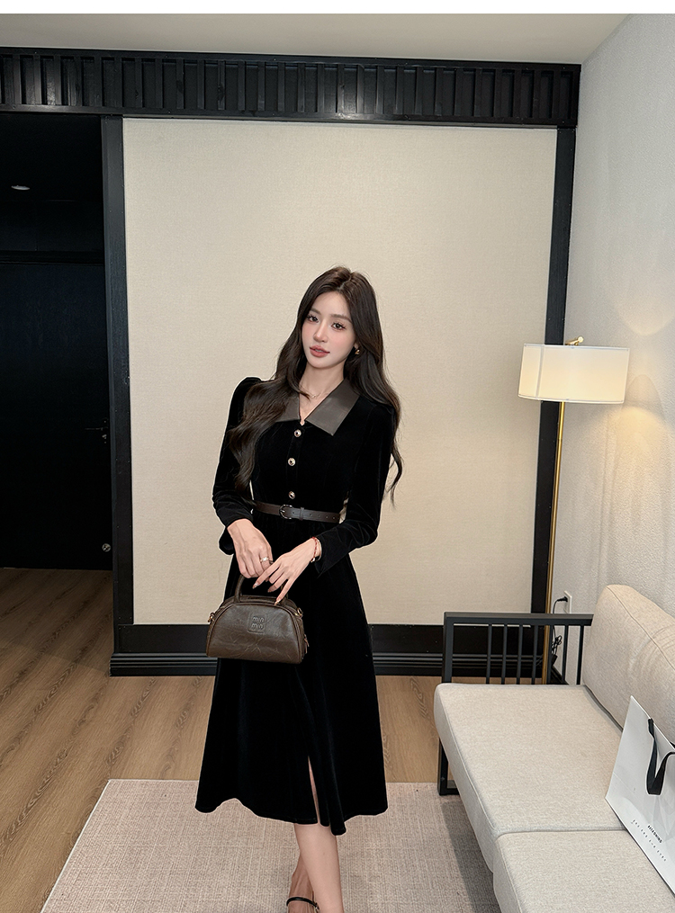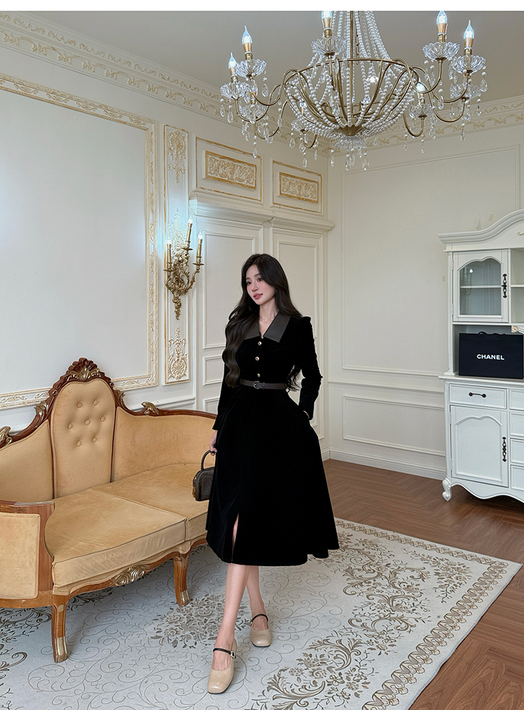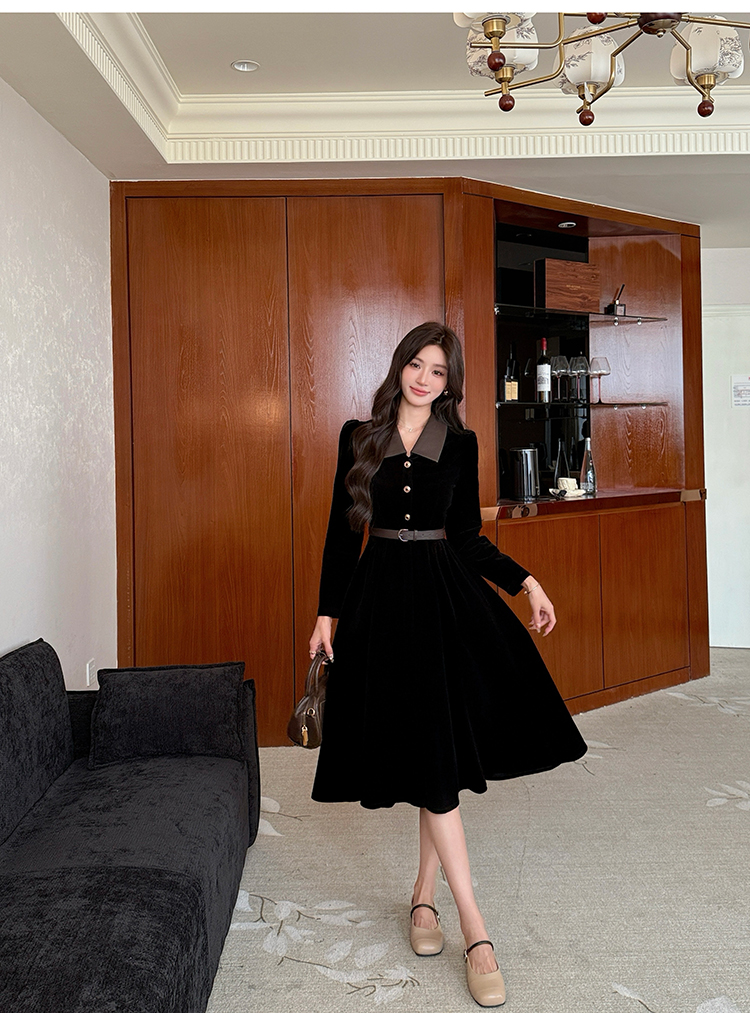 MY14049# 秋田谷黑色长袖连衣裙修身气质灯芯绒法式长裙女女裝貨源服裝批發