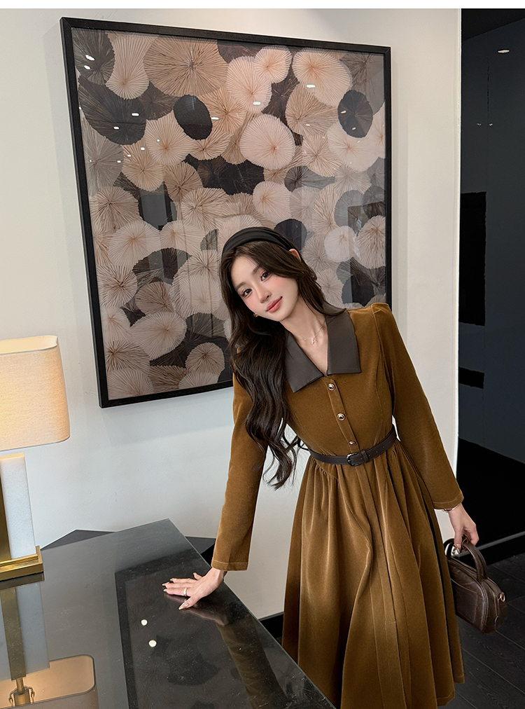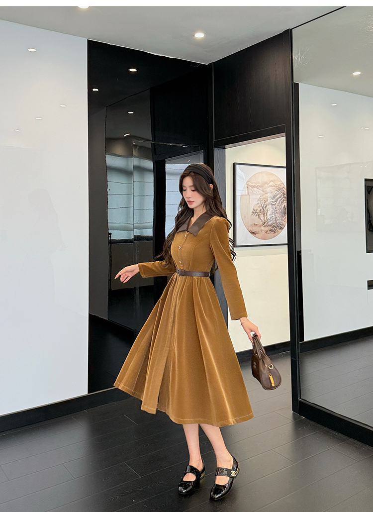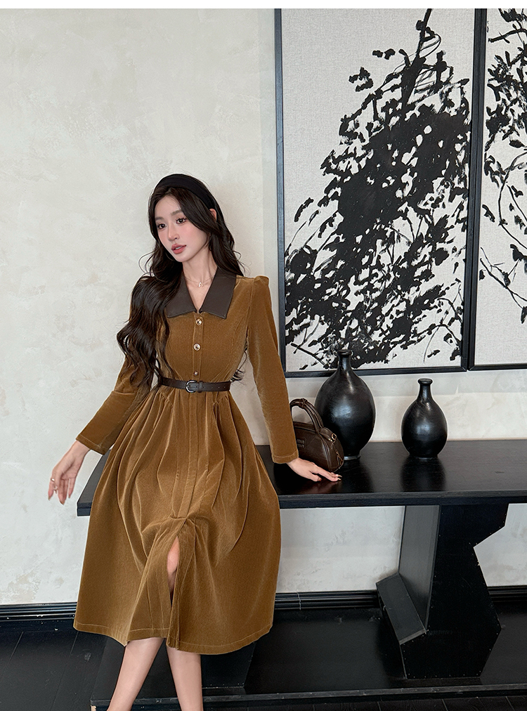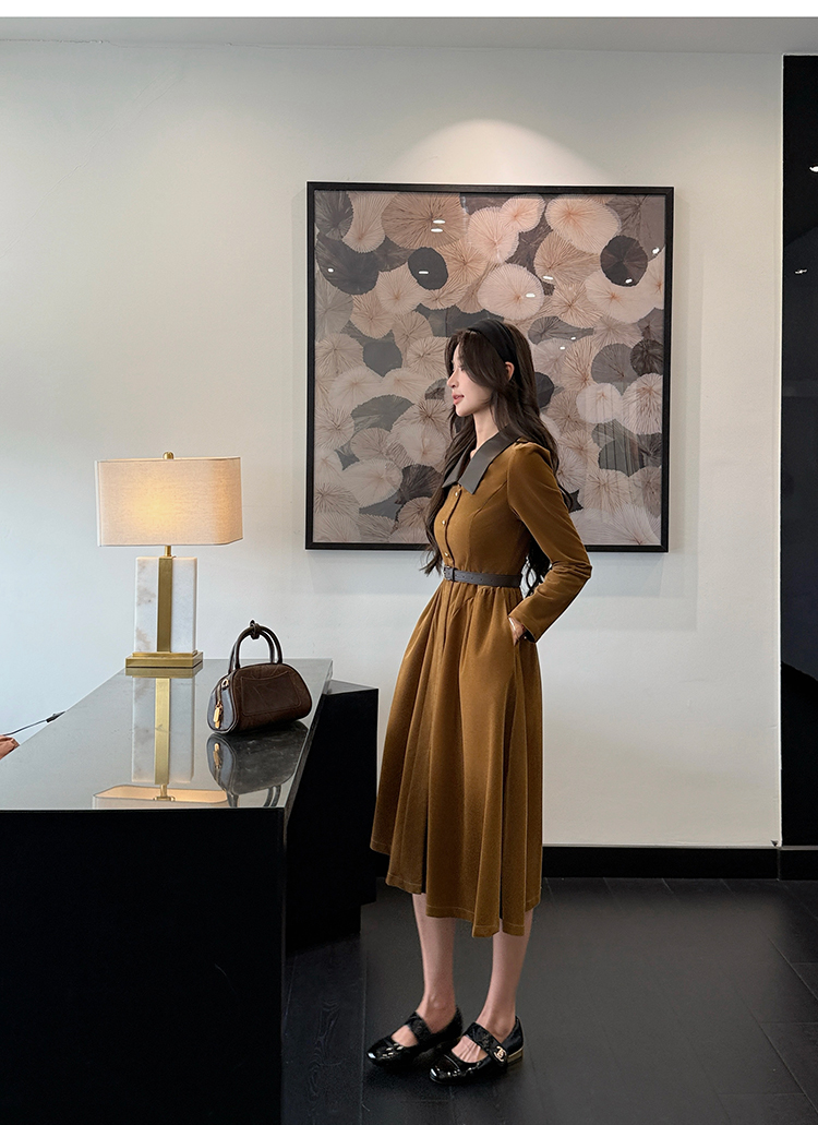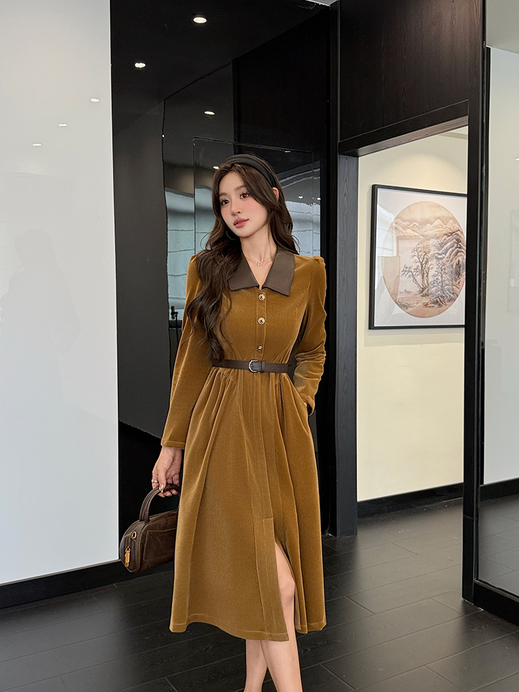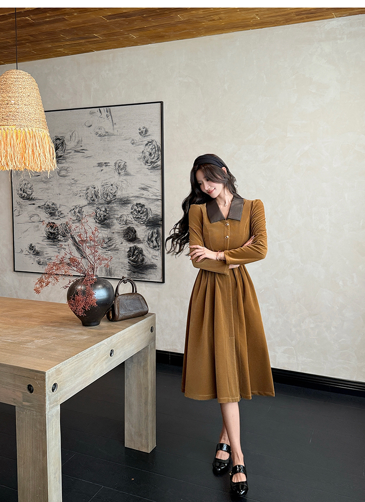 MY14049# 秋田谷黑色长袖连衣裙修身气质灯芯绒法式长裙女女裝貨源服裝批發