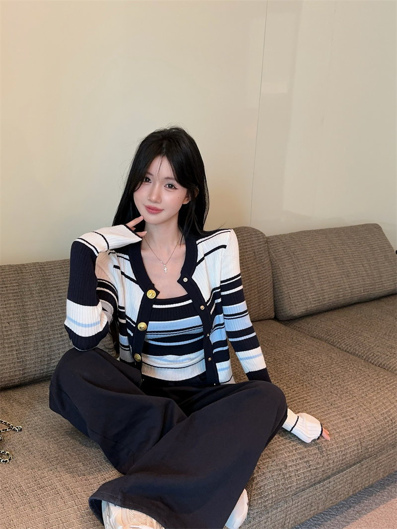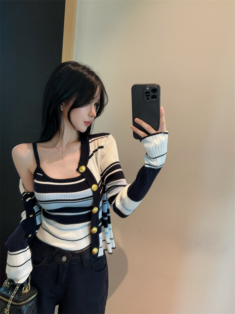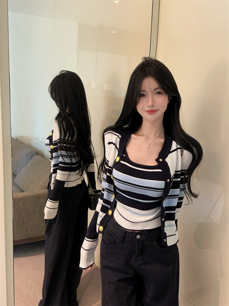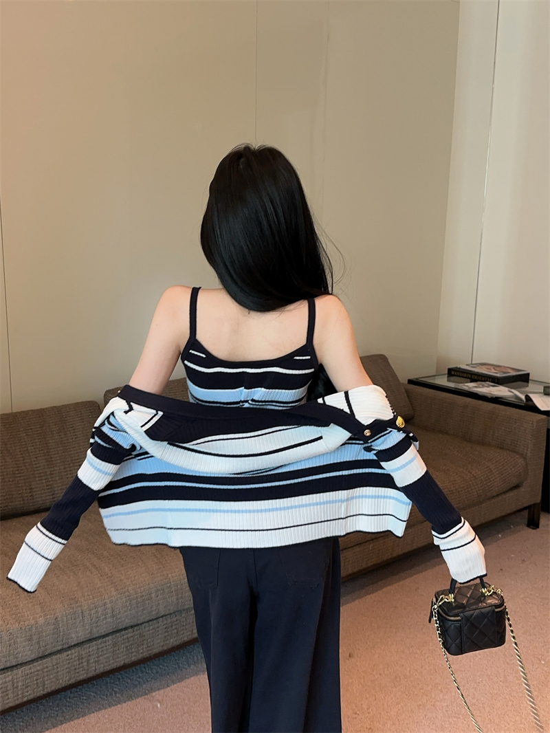 MY14231# 条纹修身内搭吊带 + 松弛感外搭开衫套装女裝貨源服裝批發