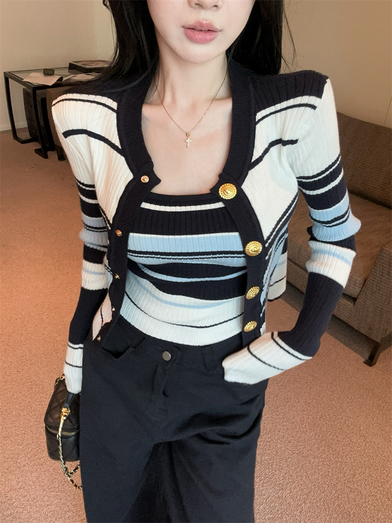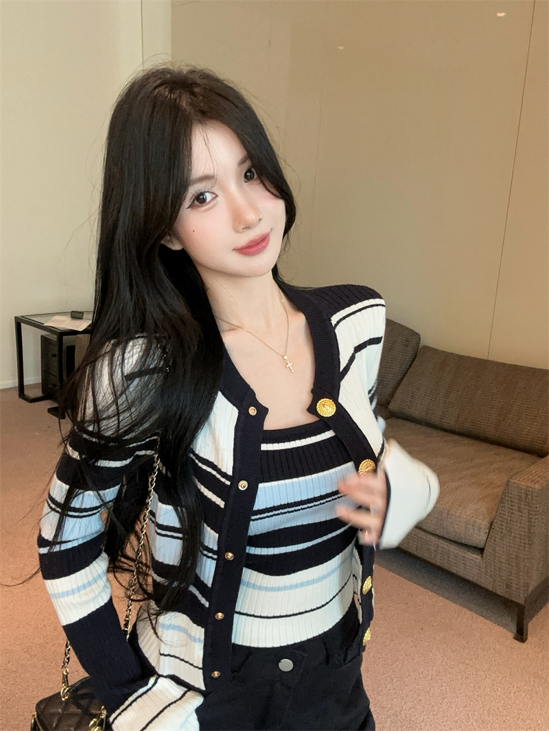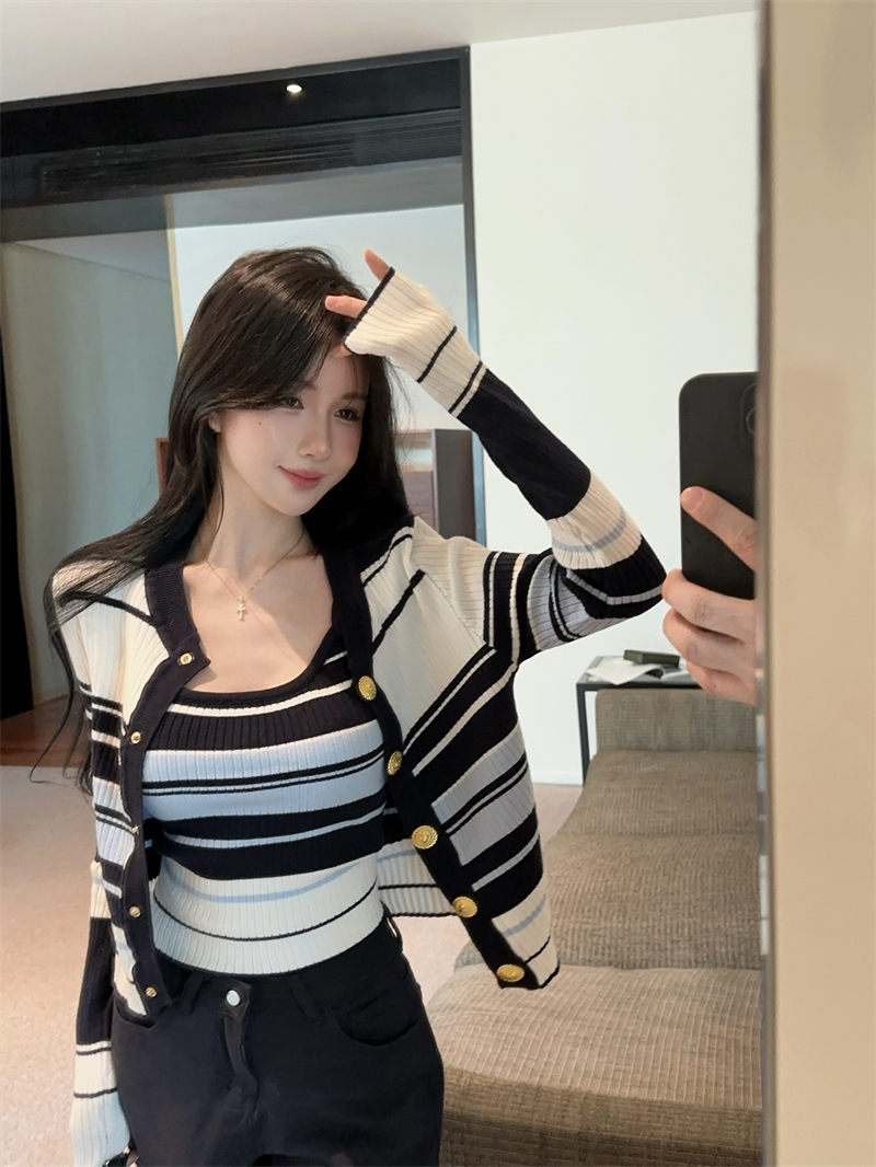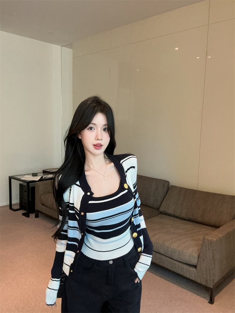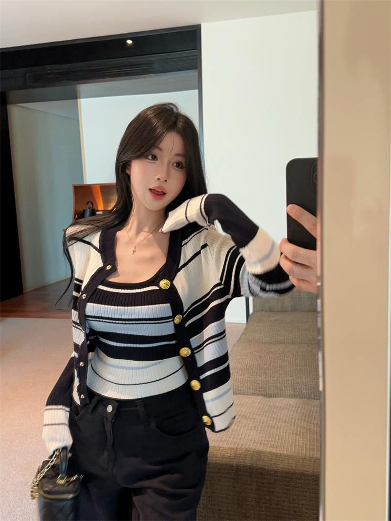 MY14231# 条纹修身内搭吊带 + 松弛感外搭开衫套装女裝貨源服裝批發