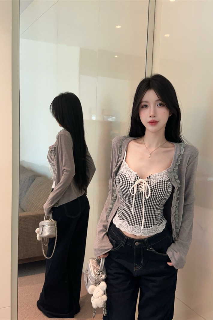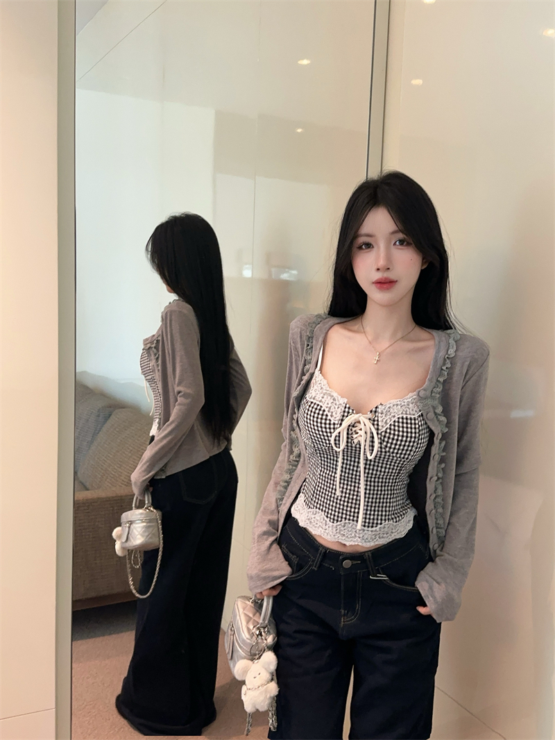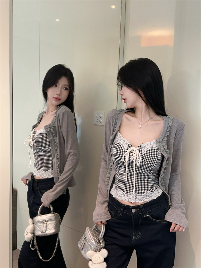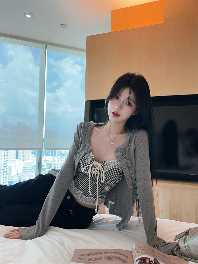 MY14232# 纯欲蕾丝绑带吊带背心+针织拼接花边外套上衣两件套女裝貨源服裝批發