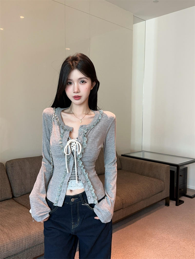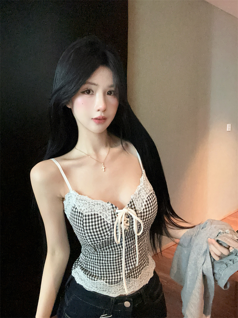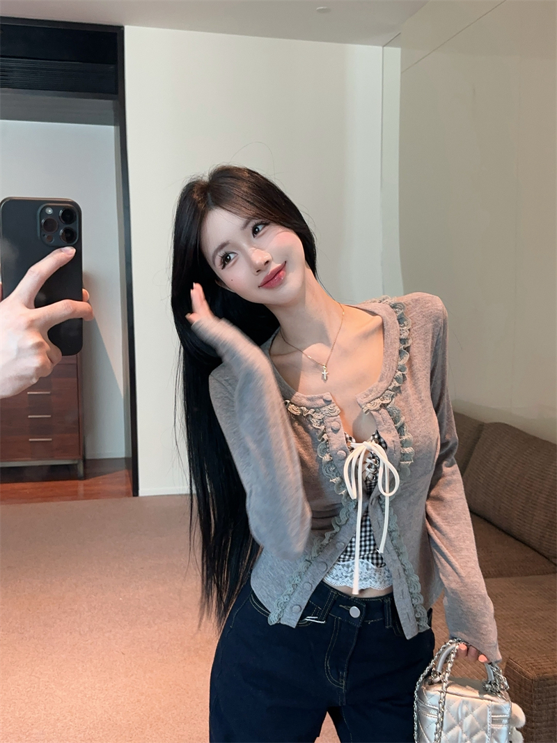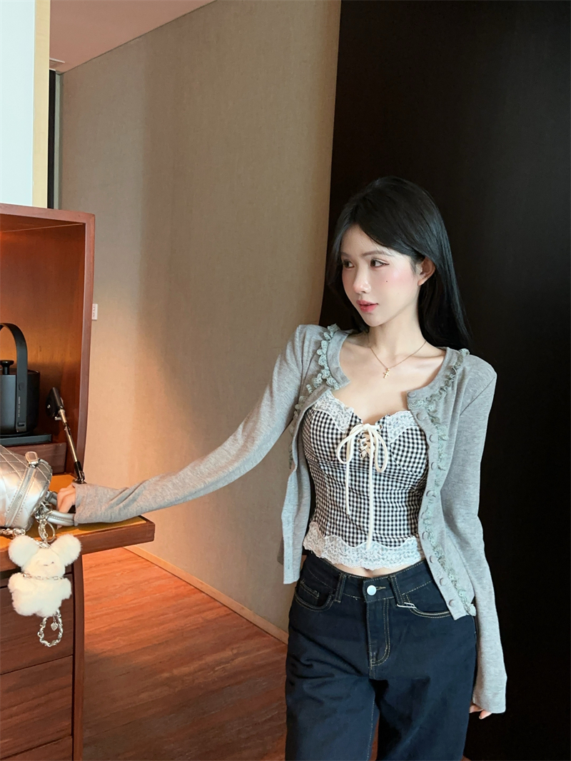 MY14232# 纯欲蕾丝绑带吊带背心+针织拼接花边外套上衣两件套女裝貨源服裝批發