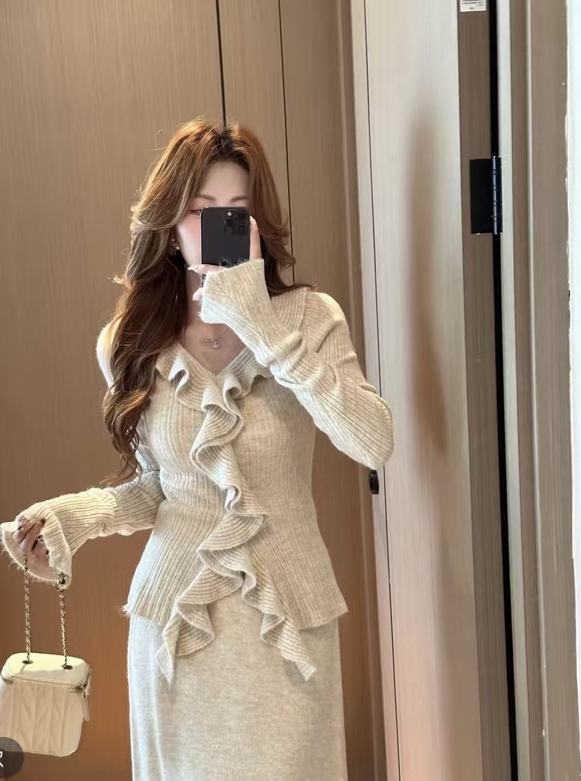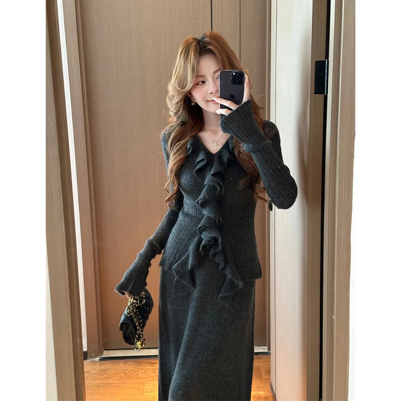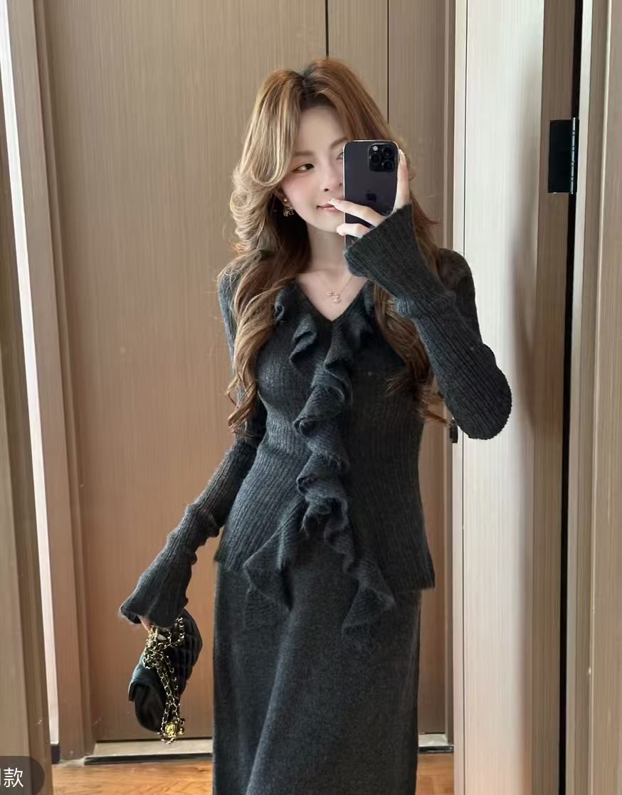 MY14233# V领毛衣洋气设计感荷叶边上衣半身裙两件套秋秋新款温柔针织套装女裝貨源服裝批發