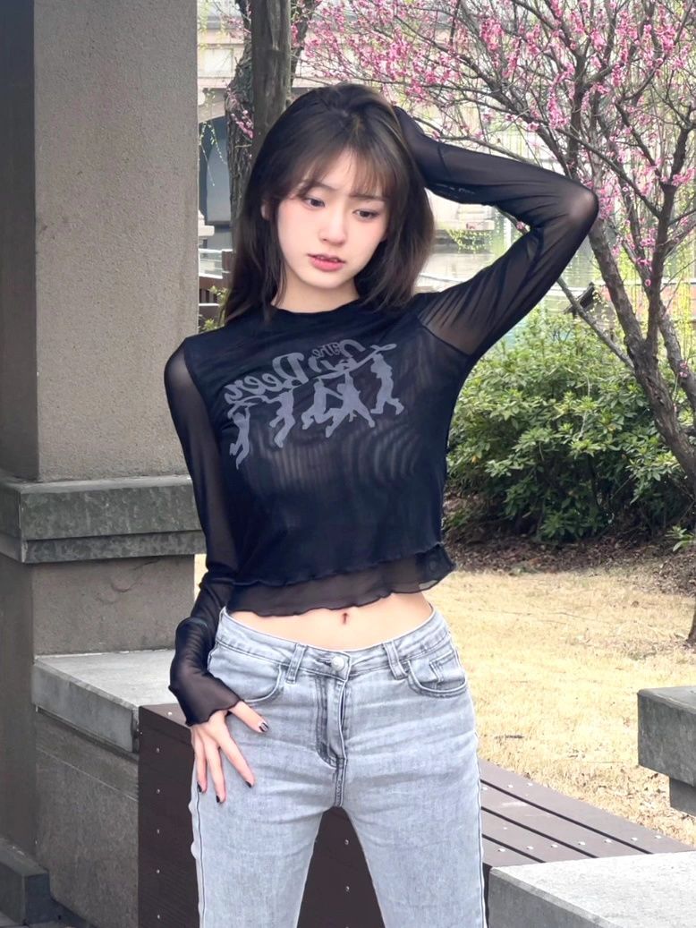 MY14235# 甜酷辣复古波边网纱T恤女短款春夏半透视长袖打底衫美式辣妹上衣女裝貨源服裝批發