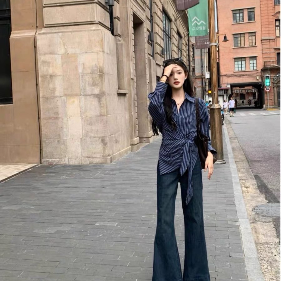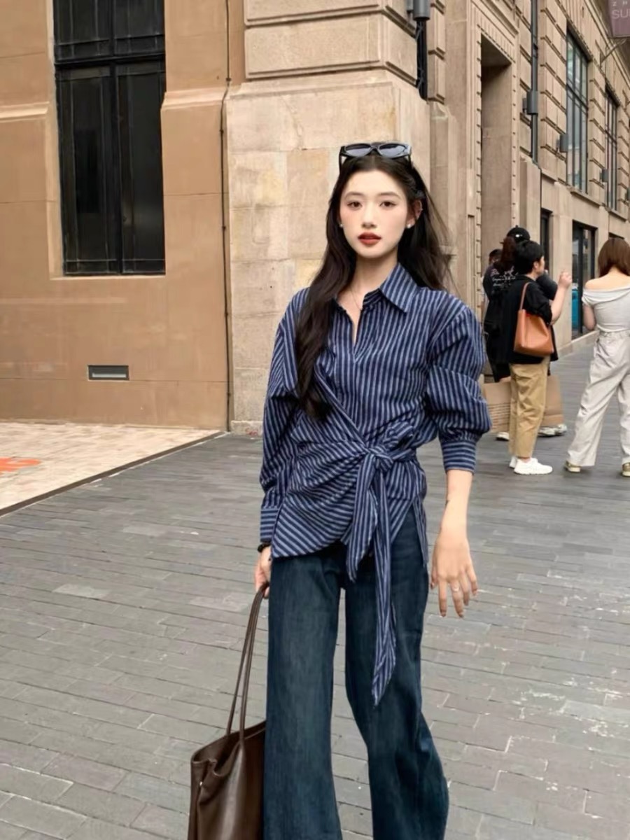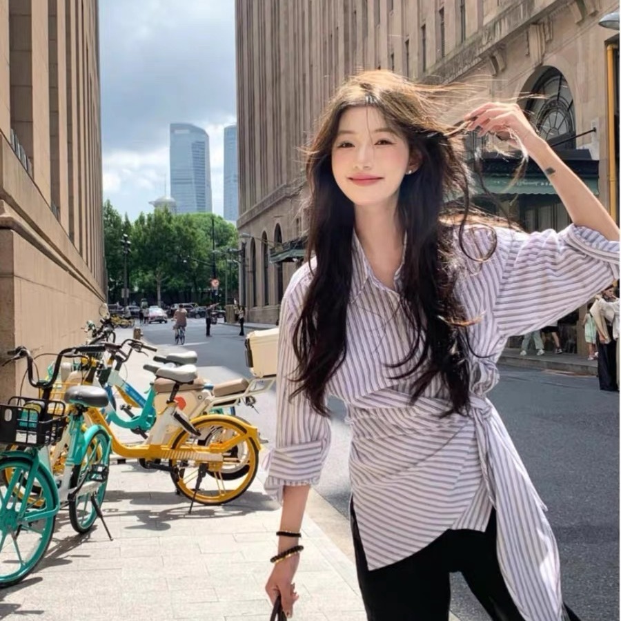 MY14236# 设计感不规则绑带开叉条纹衬衫女春季新款高级感长袖衬衣女裝貨源服裝批發