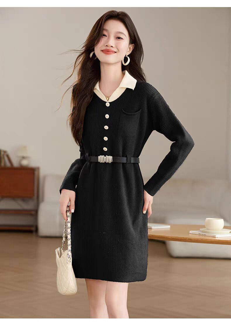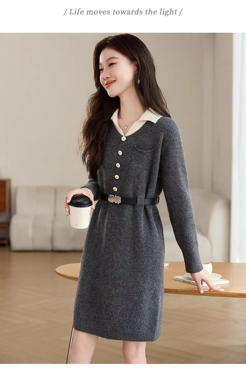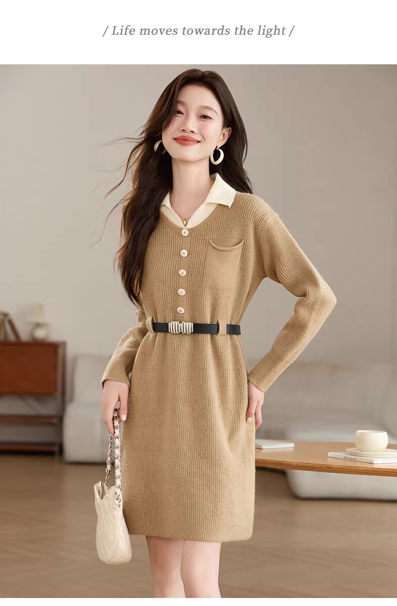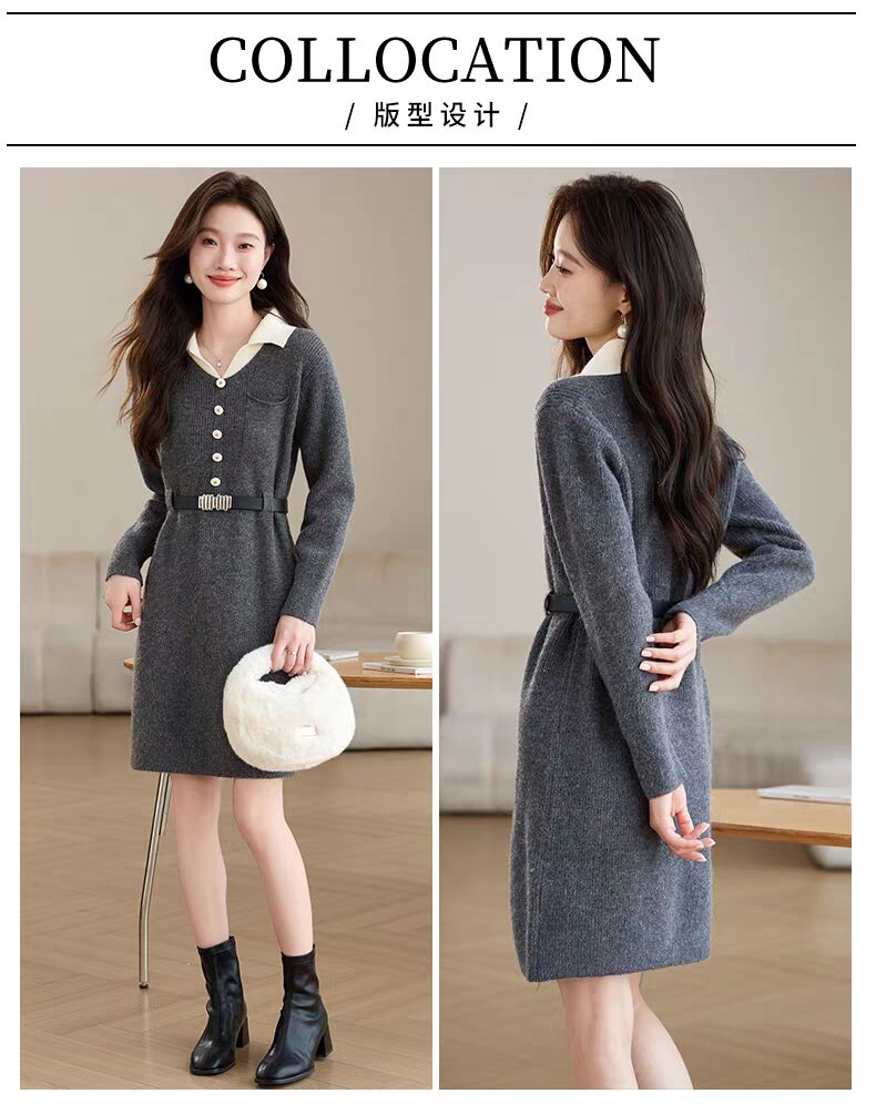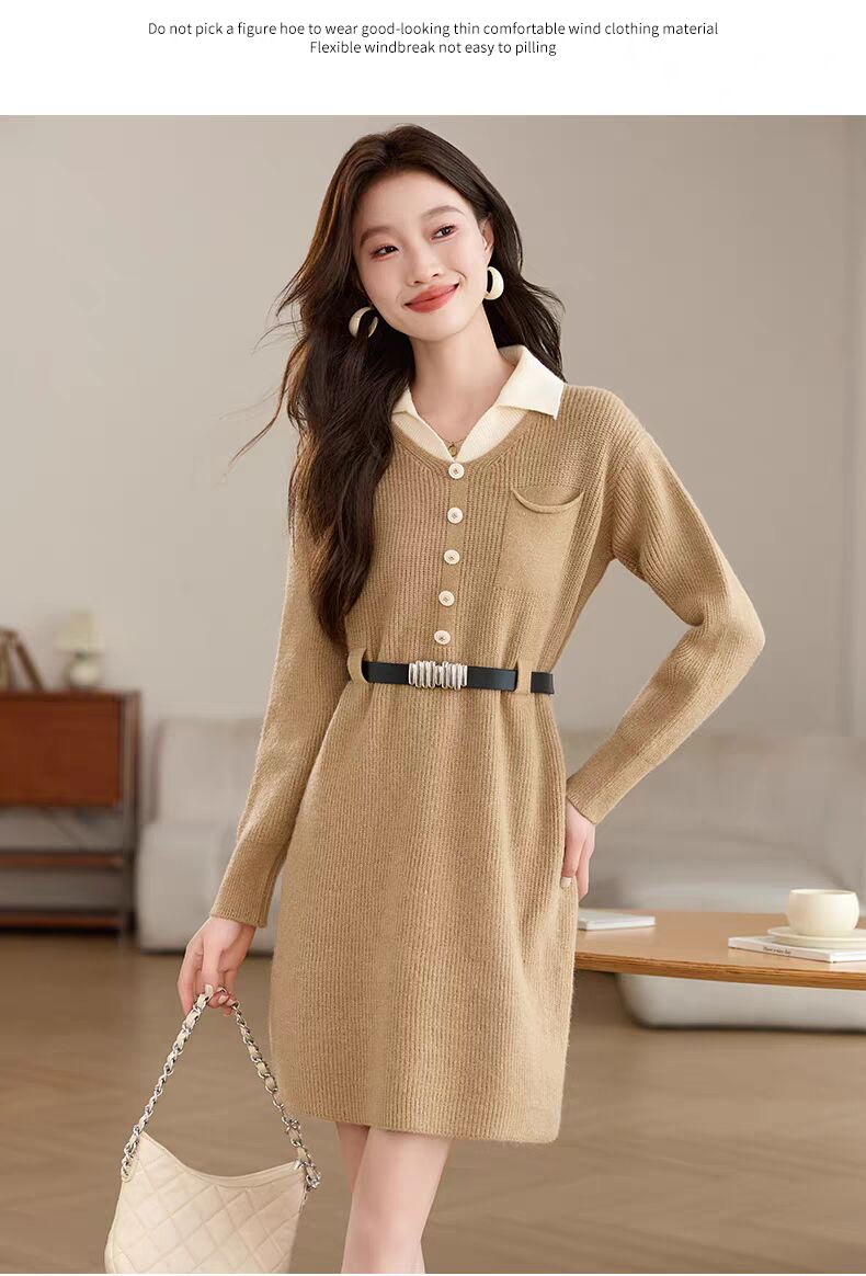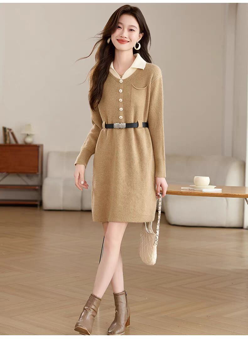MY14241# 设计感假两件翻领针织连衣裙新款女秋冬小个子显瘦打底毛衣裙女裝貨源服裝批發