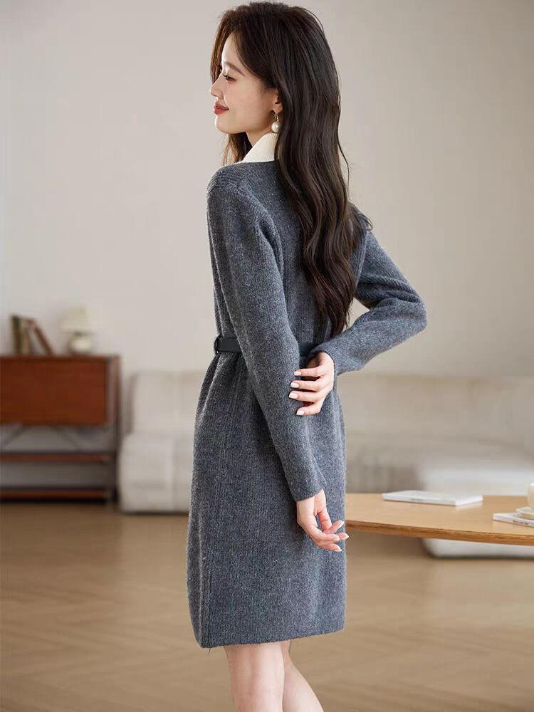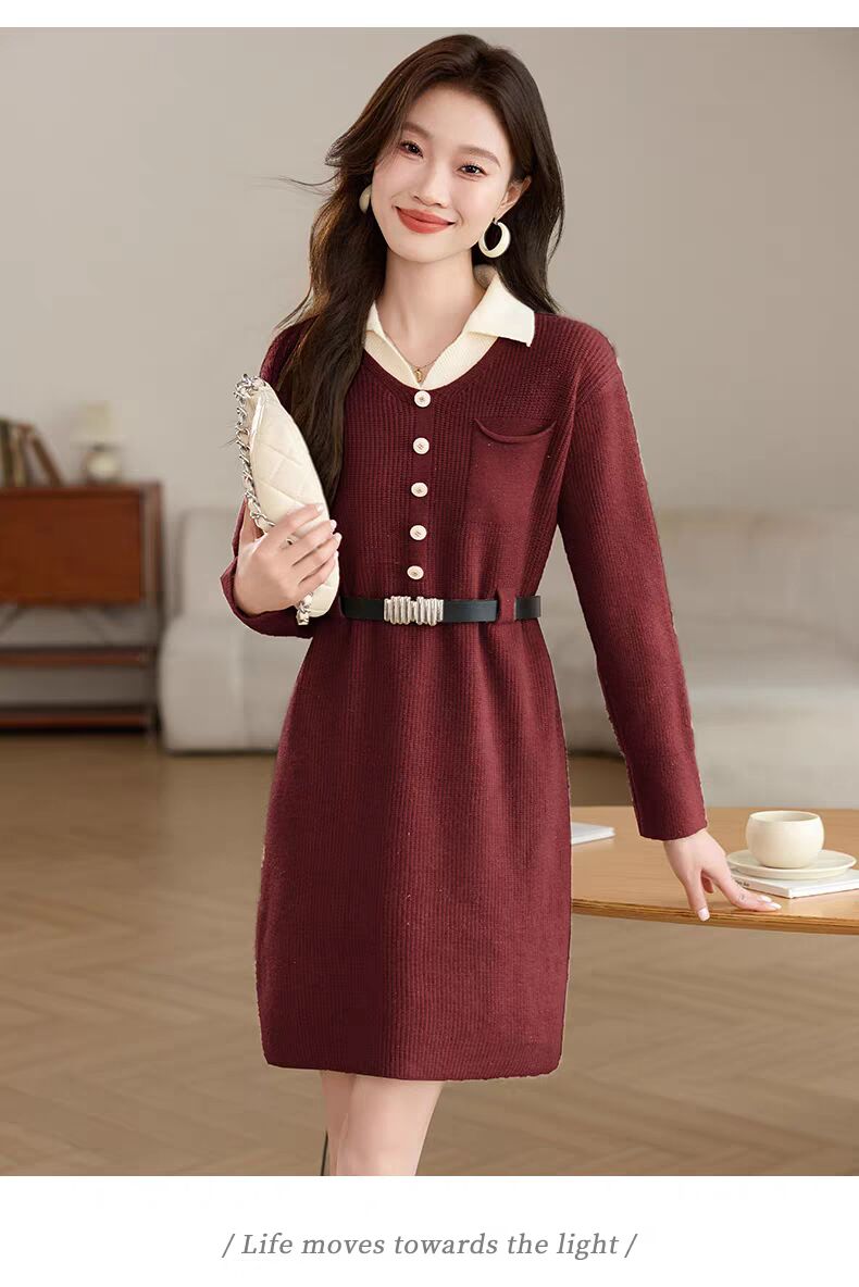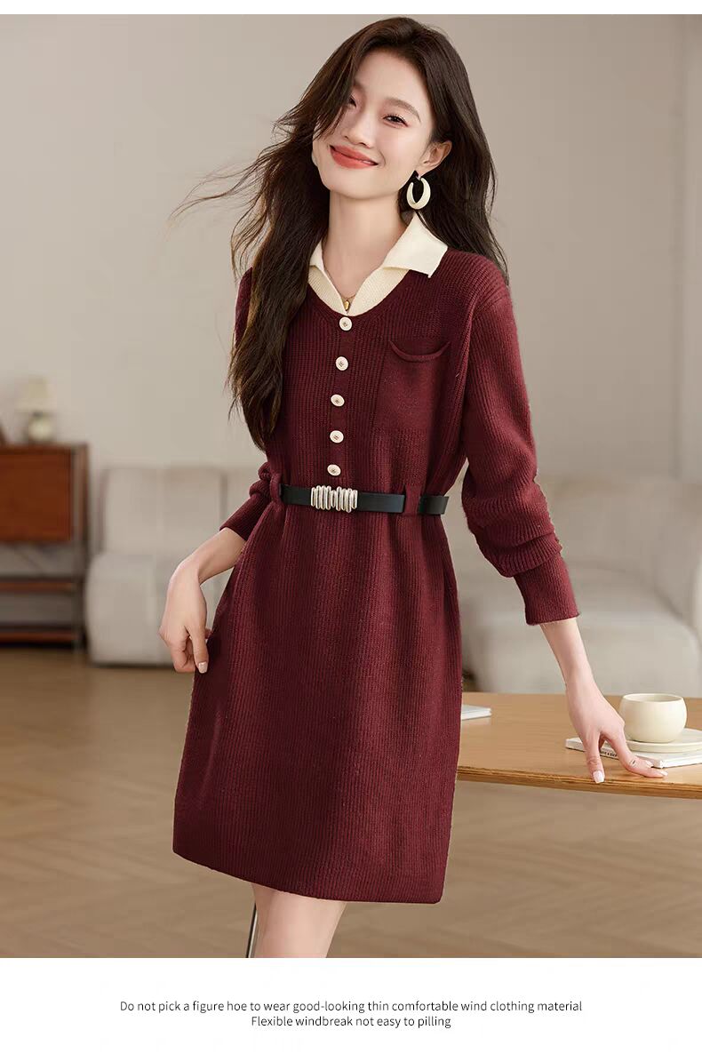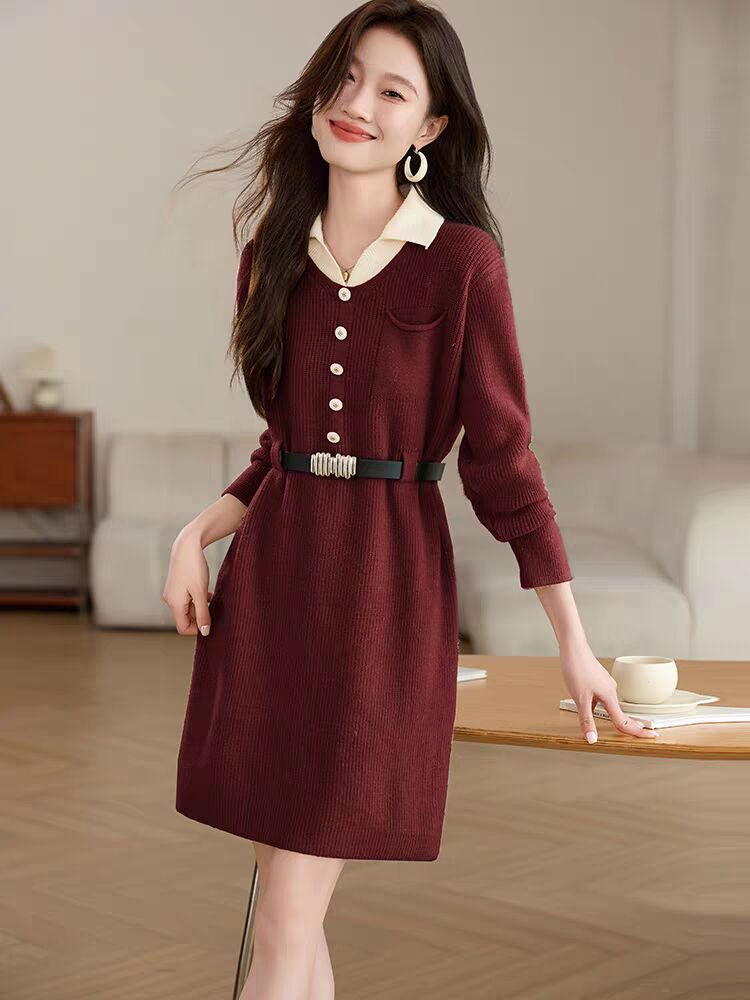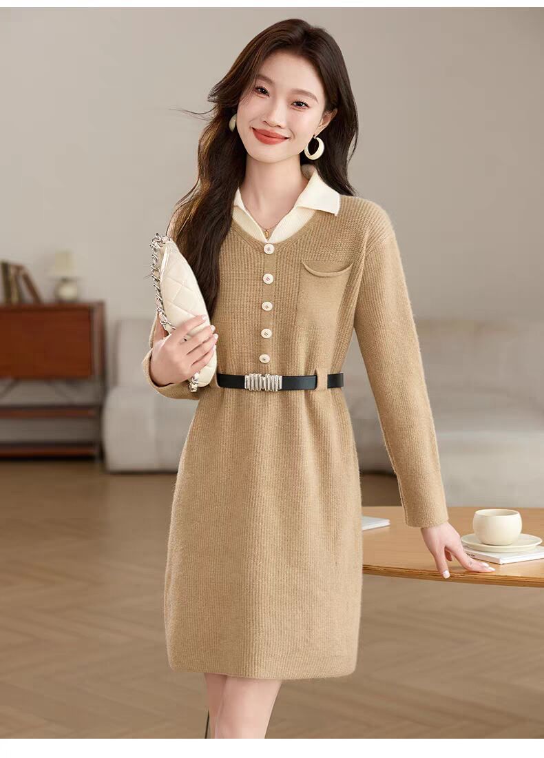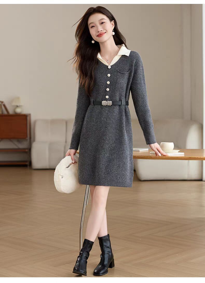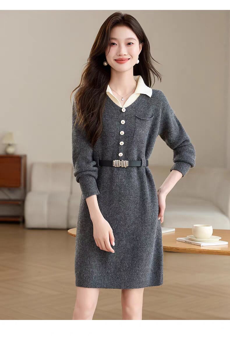 MY14241# 设计感假两件翻领针织连衣裙新款女秋冬小个子显瘦打底毛衣裙女裝貨源服裝批發