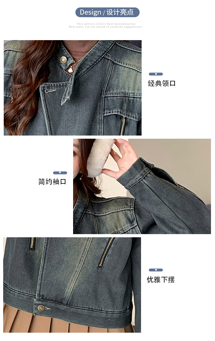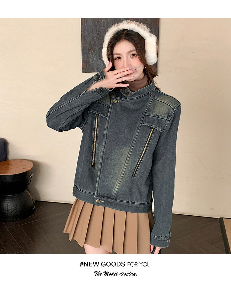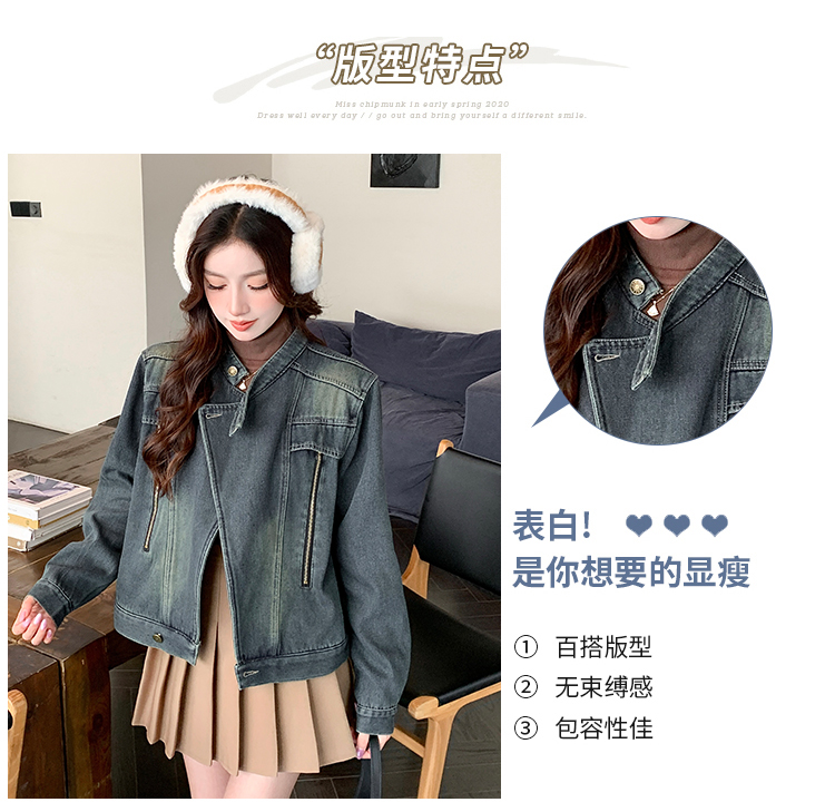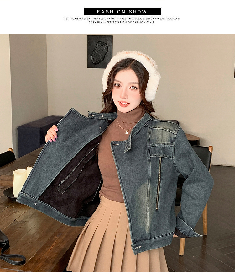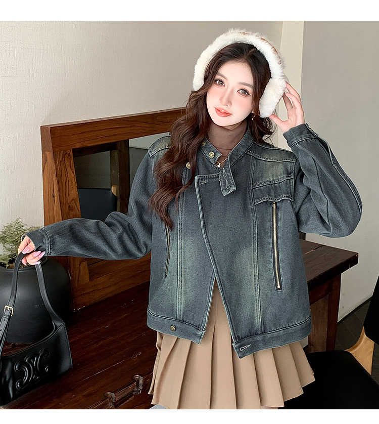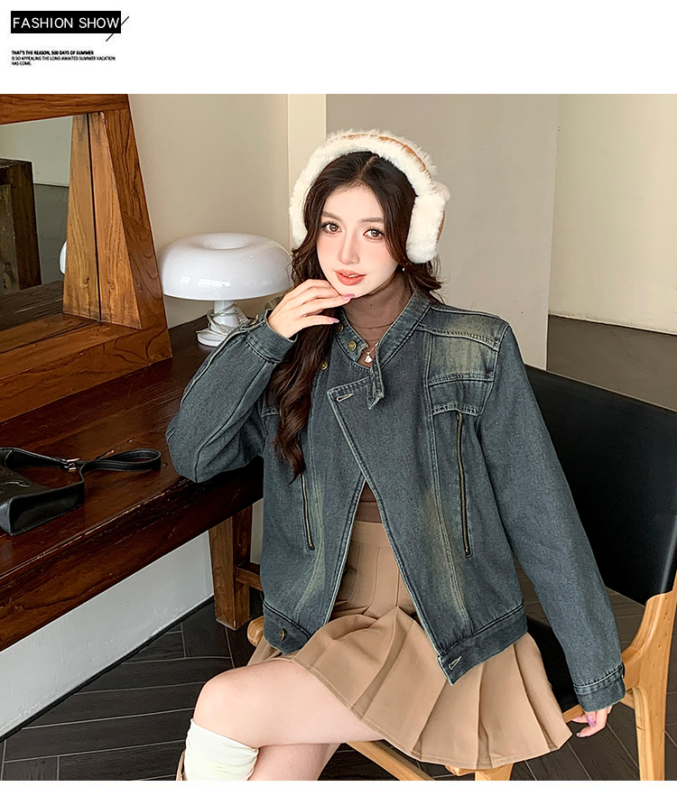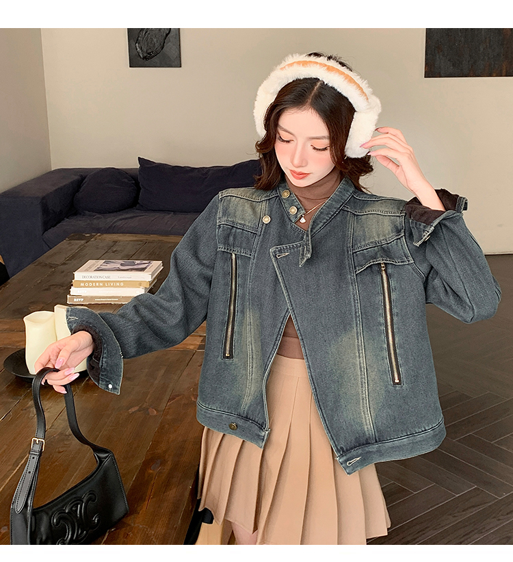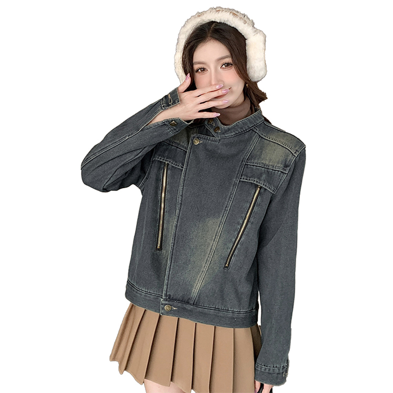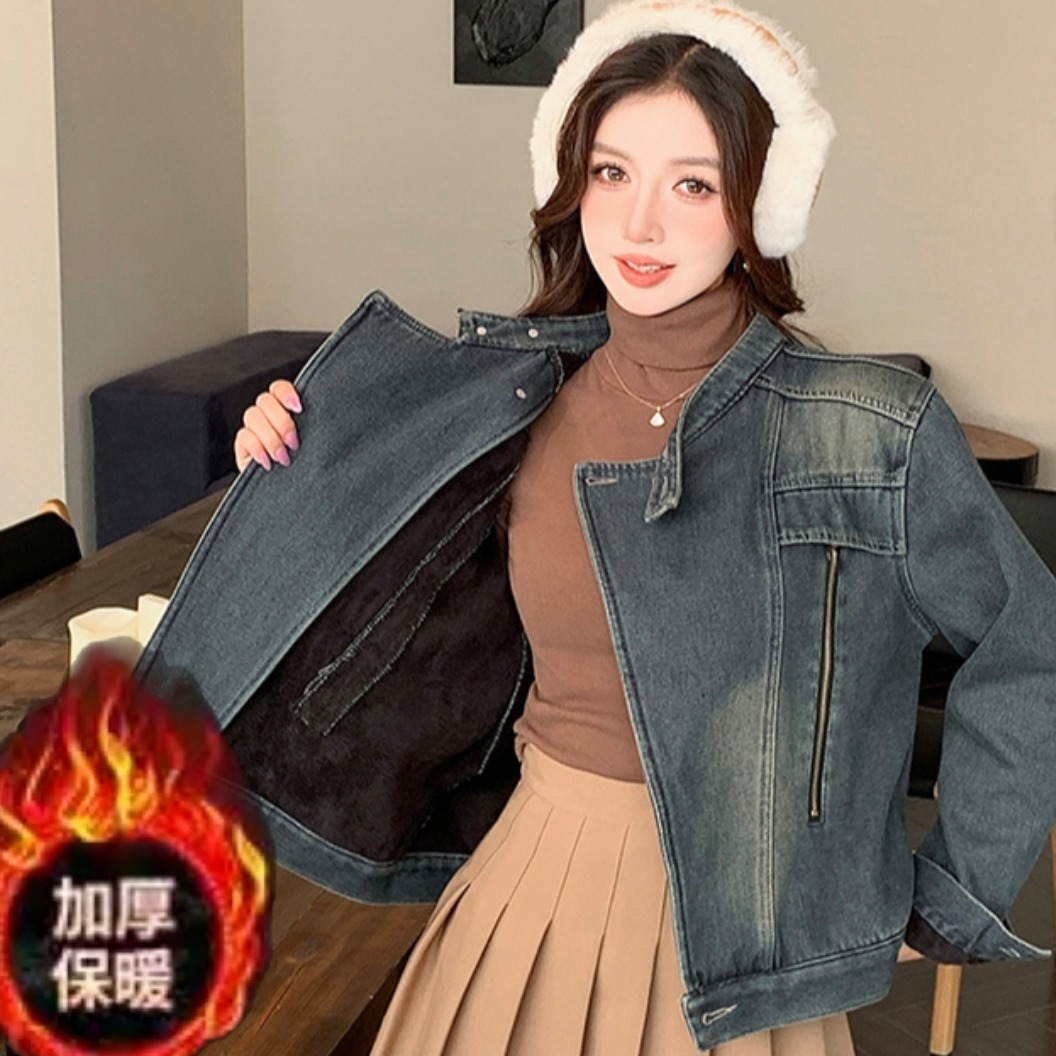 MY14257# 新款立领韩版加绒加厚保暖设计感百搭叠穿牛仔外套女裝貨源服裝批發
