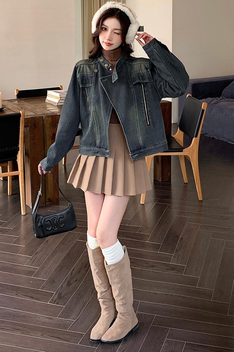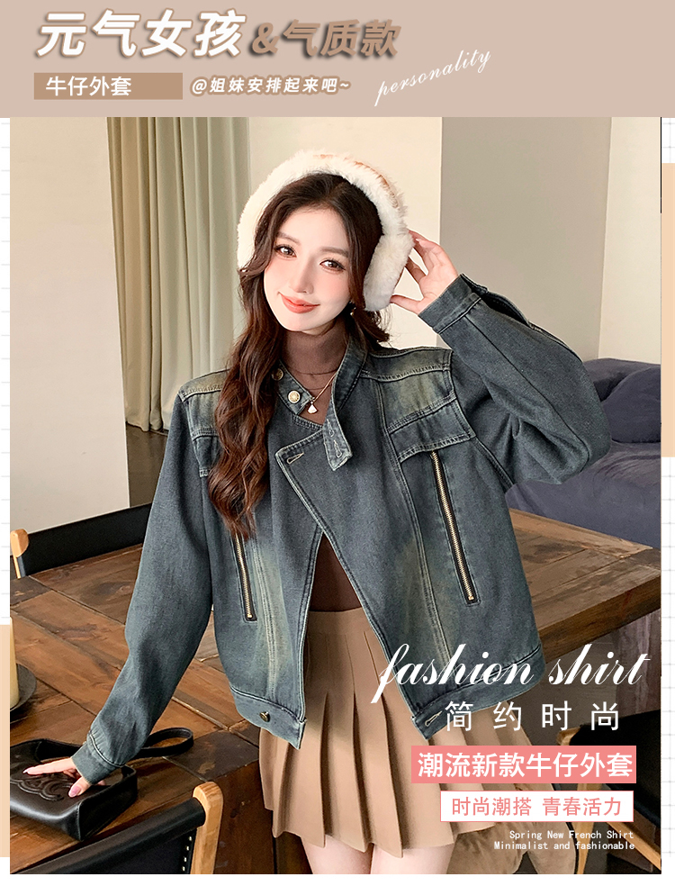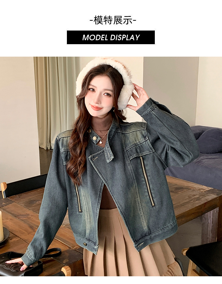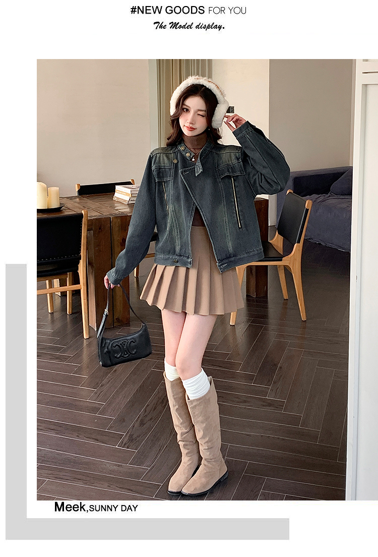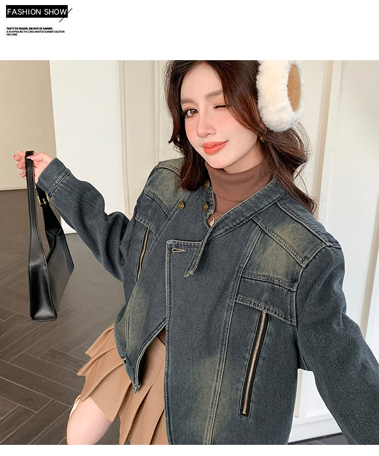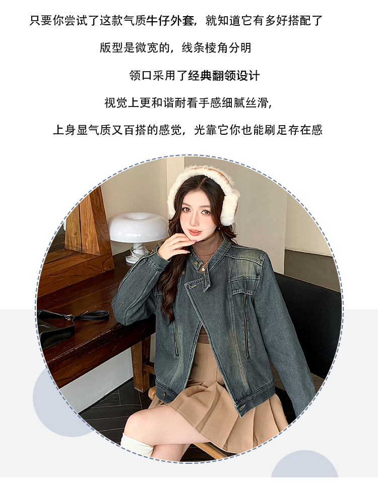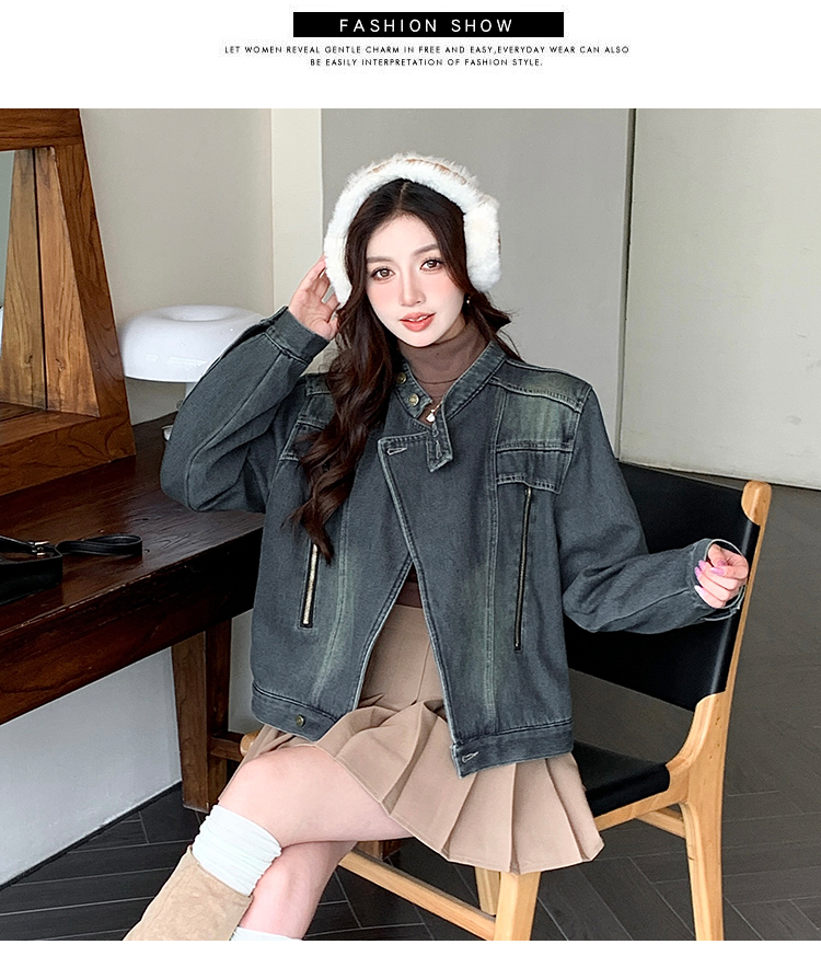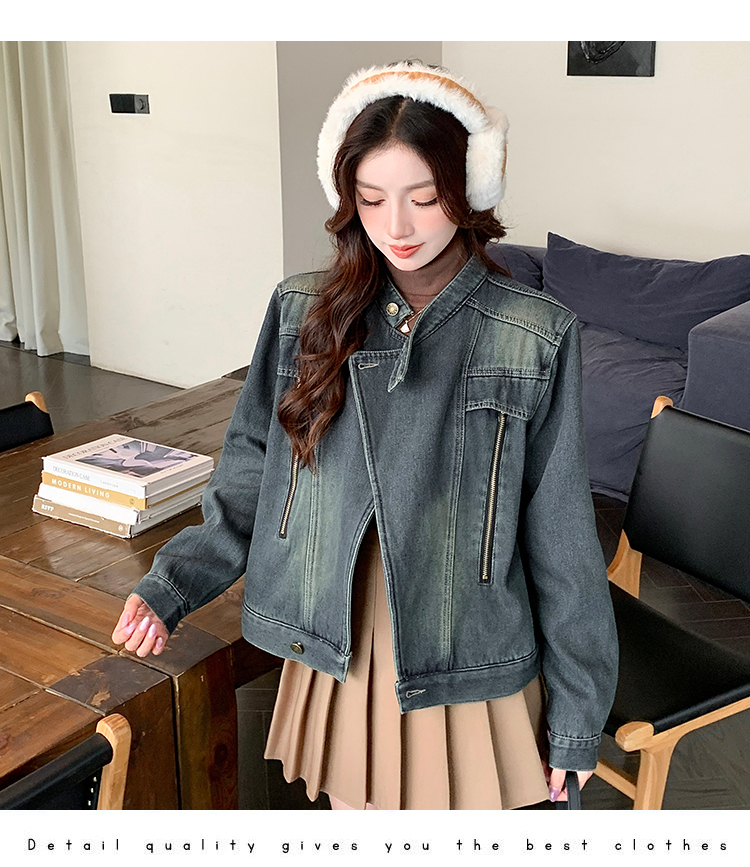 MY14257# 新款立领韩版加绒加厚保暖设计感百搭叠穿牛仔外套女裝貨源服裝批發