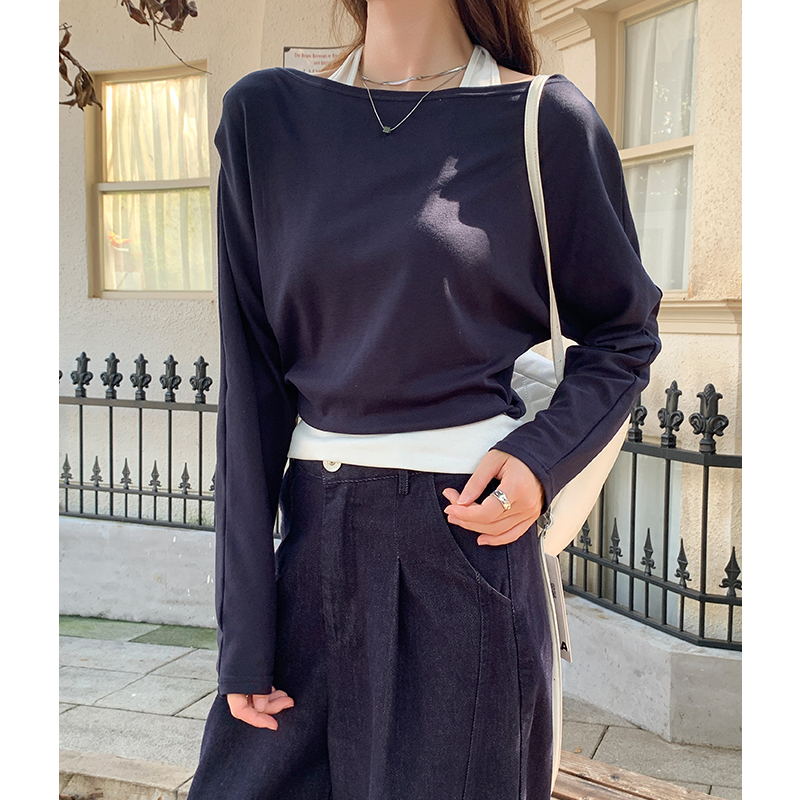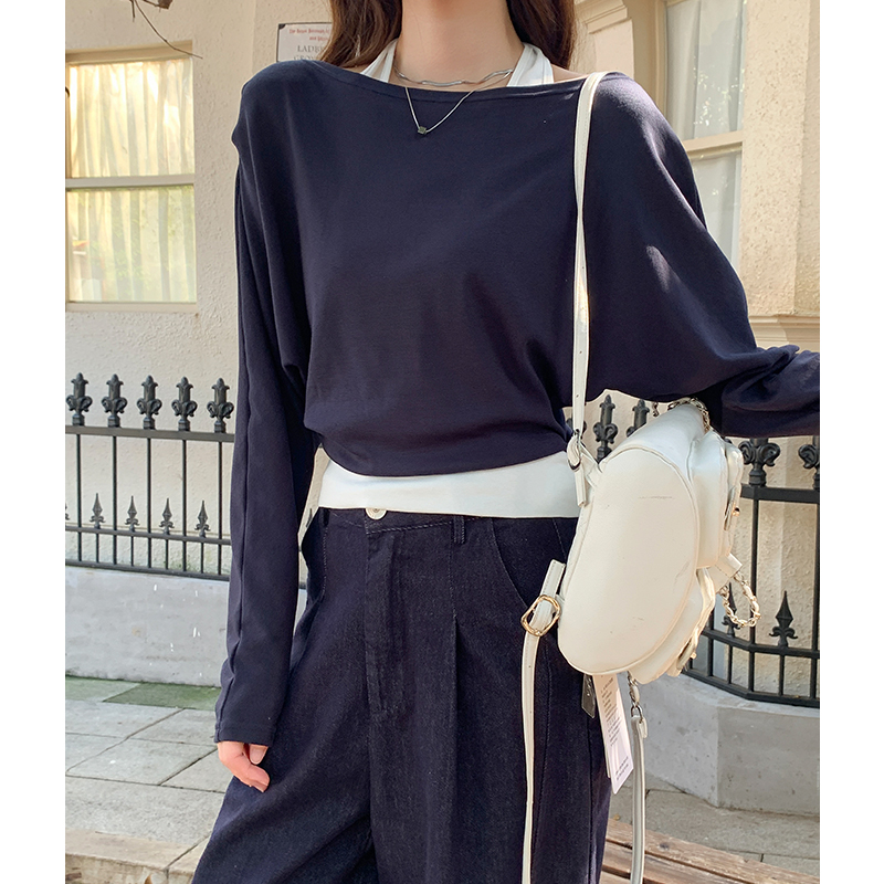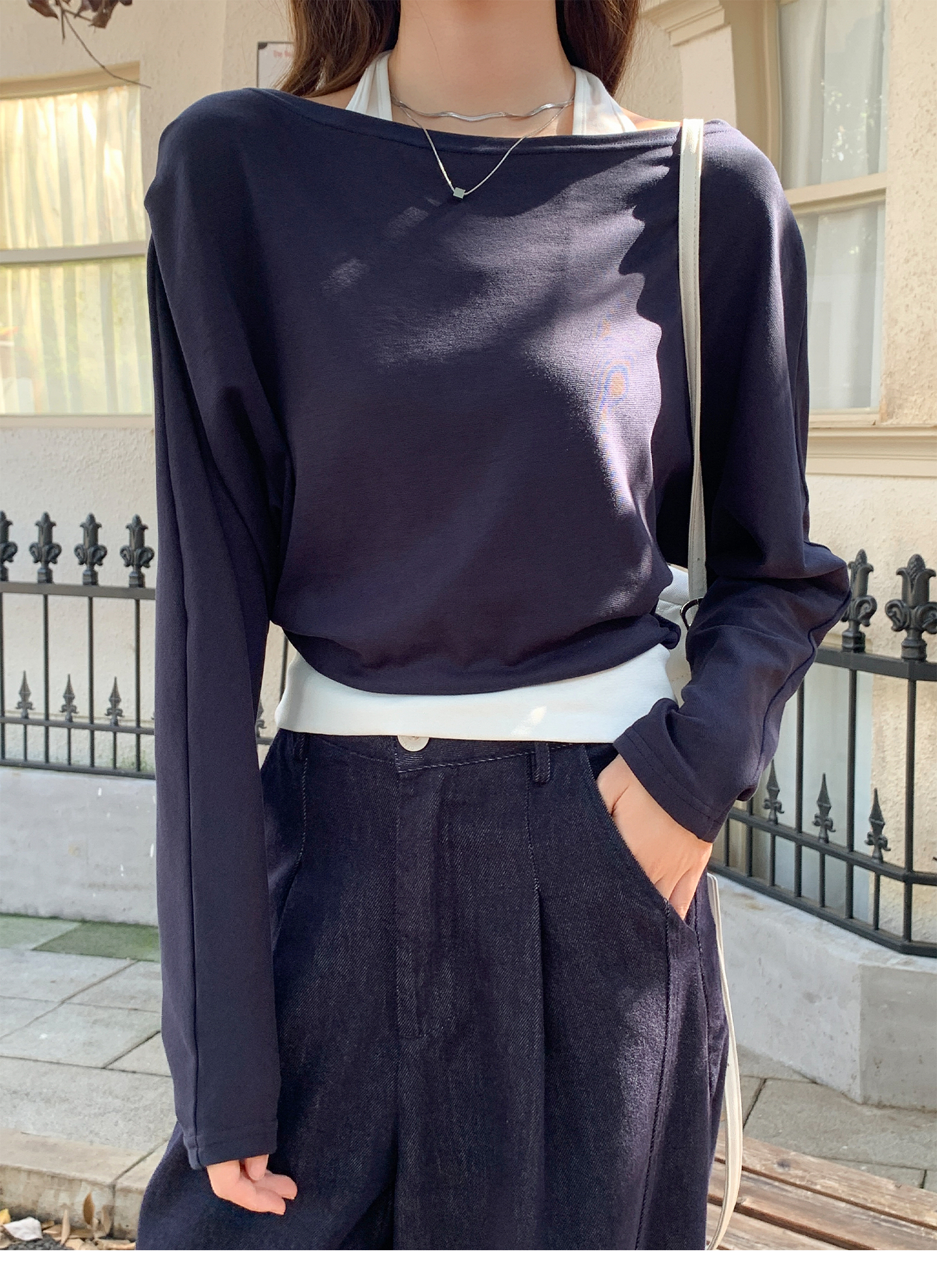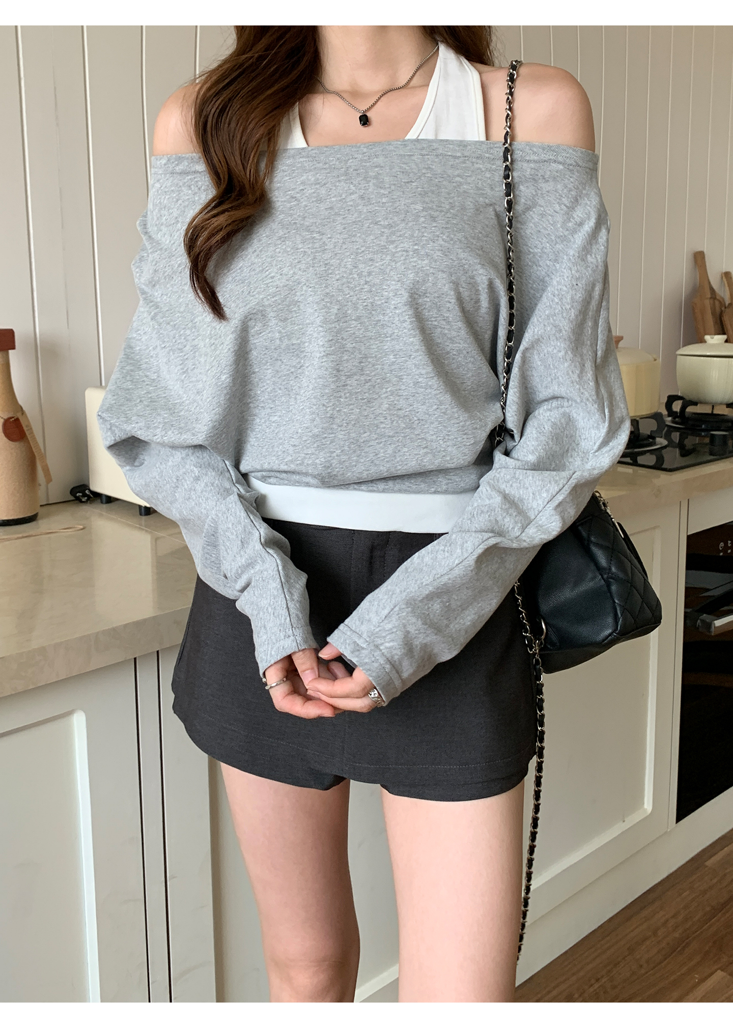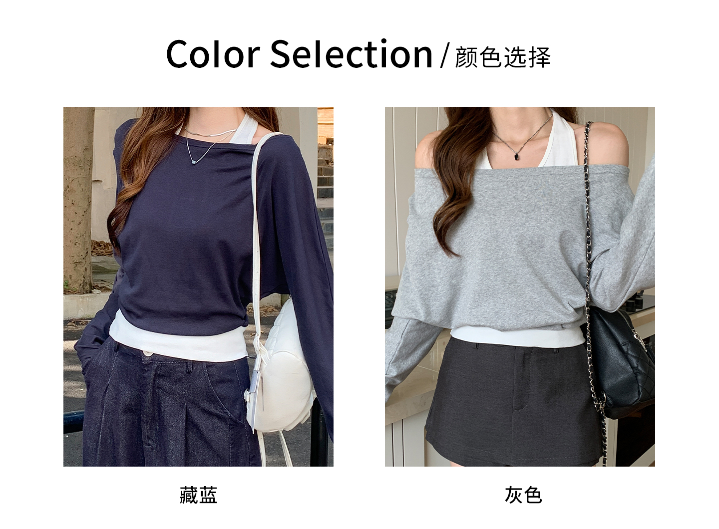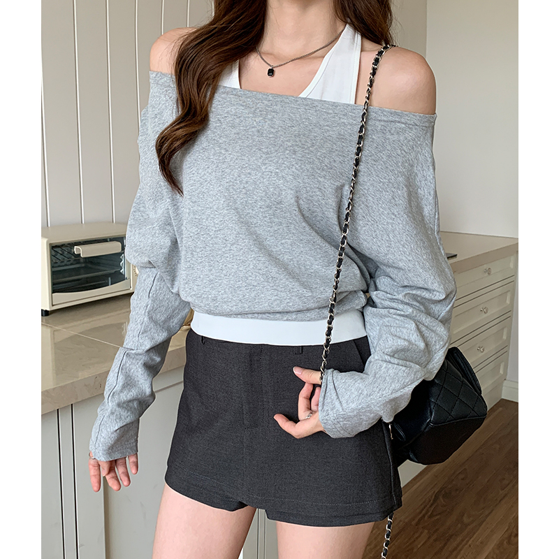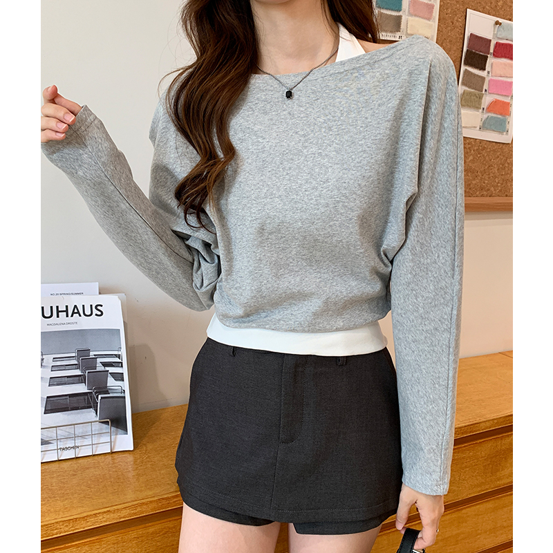 MY14261# 灰色斜肩挂脖假两件长袖t恤女秋季露肩宽松内搭打底衫女裝貨源服裝批發