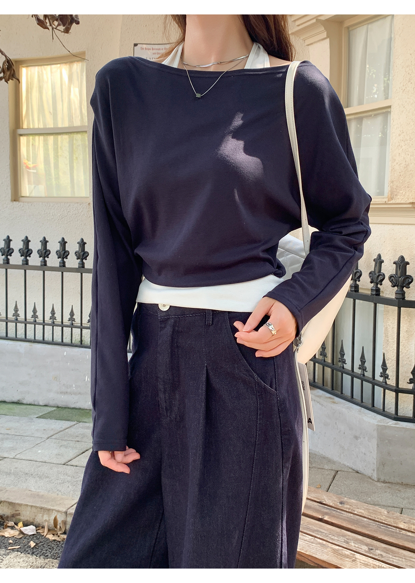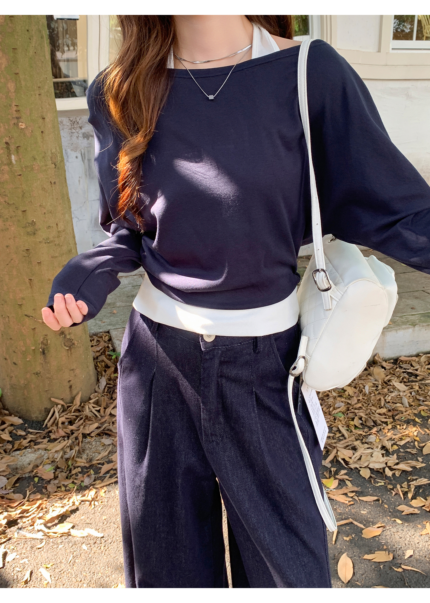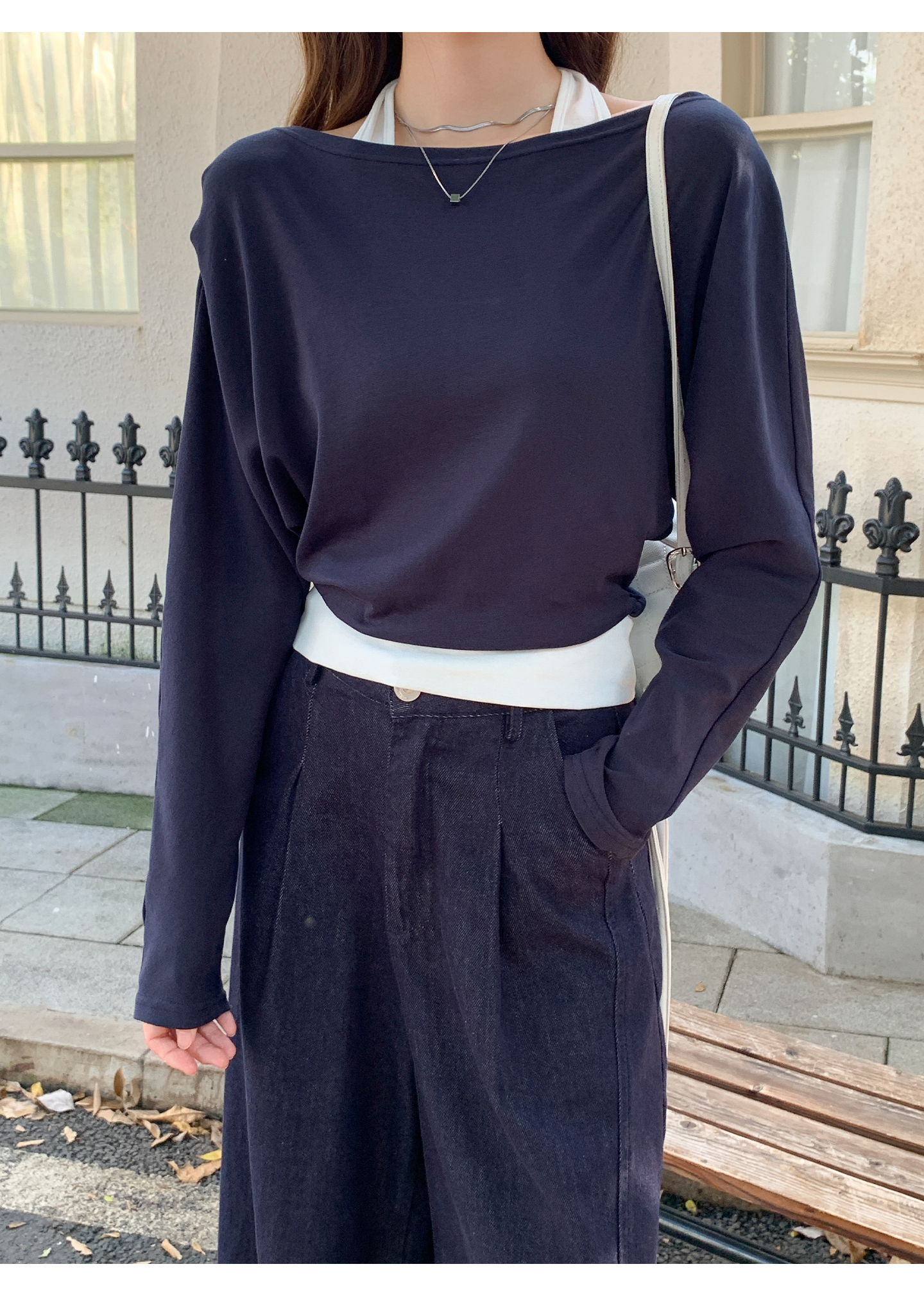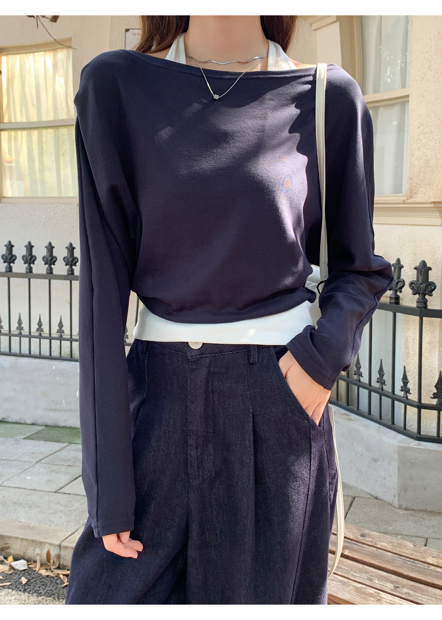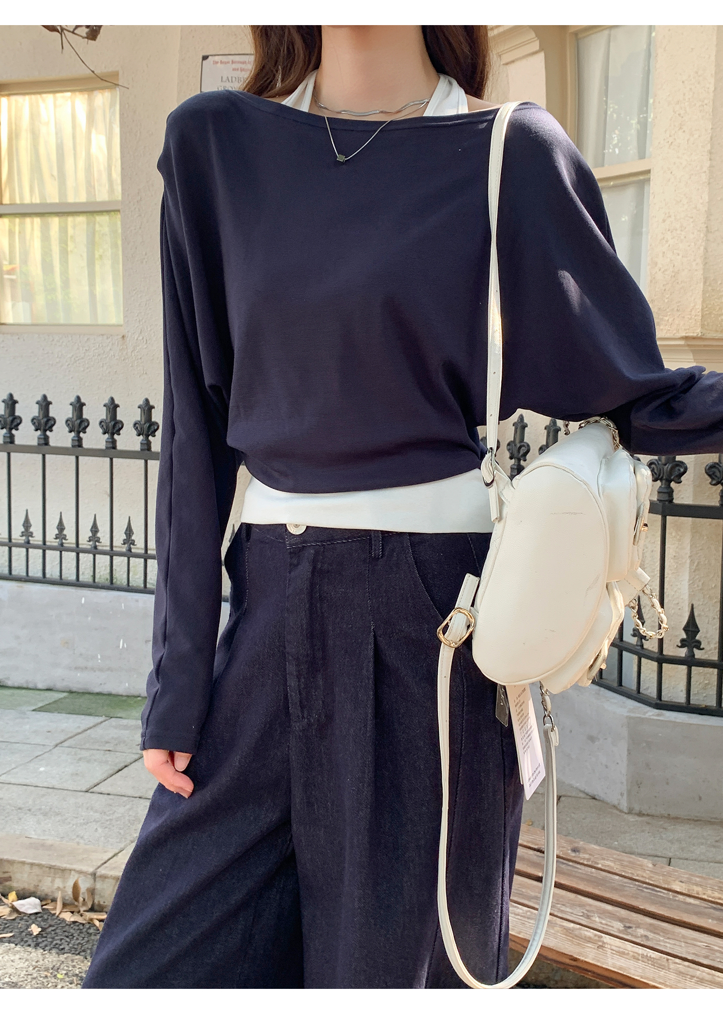 MY14261# 灰色斜肩挂脖假两件长袖t恤女秋季露肩宽松内搭打底衫女裝貨源服裝批發
