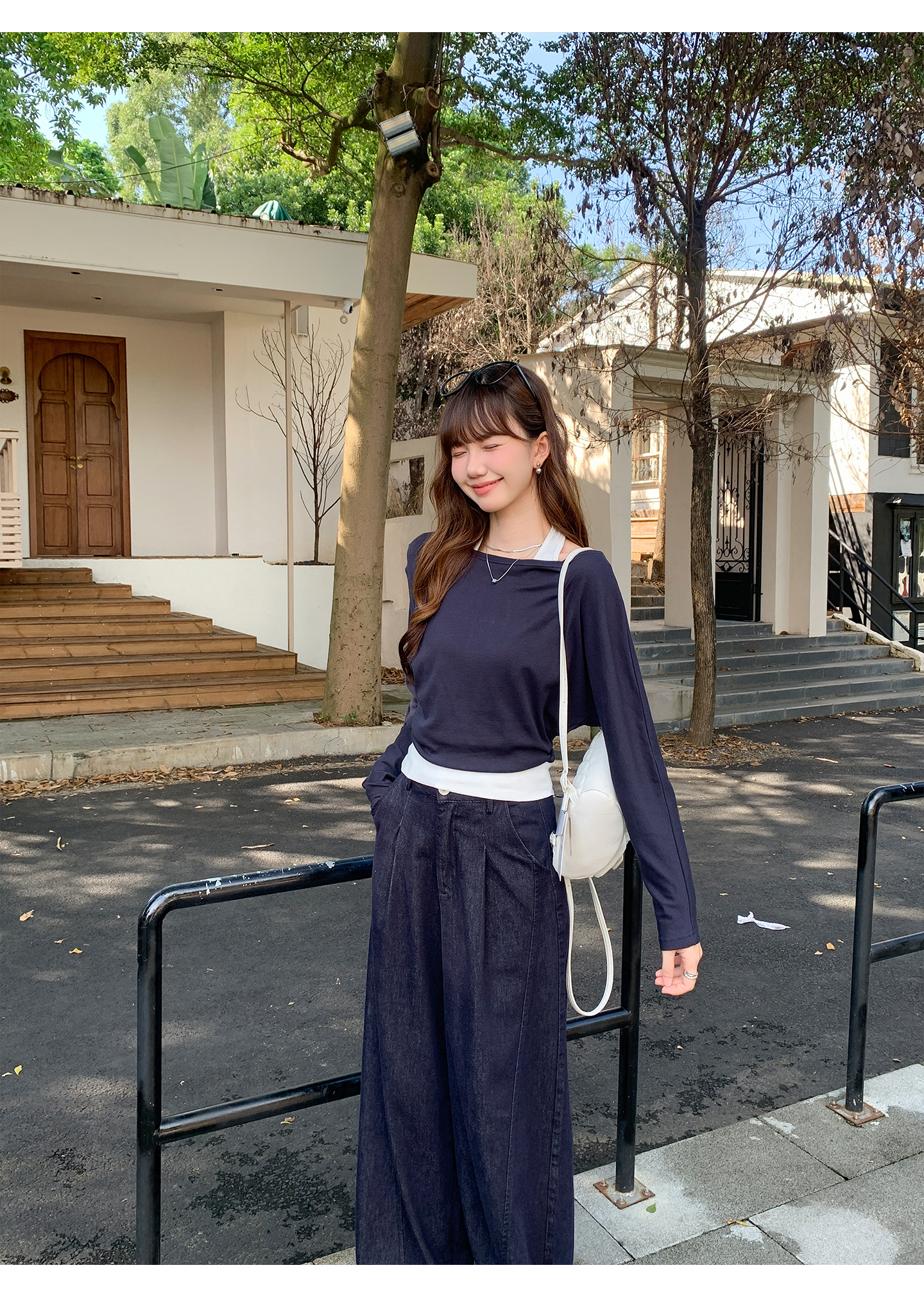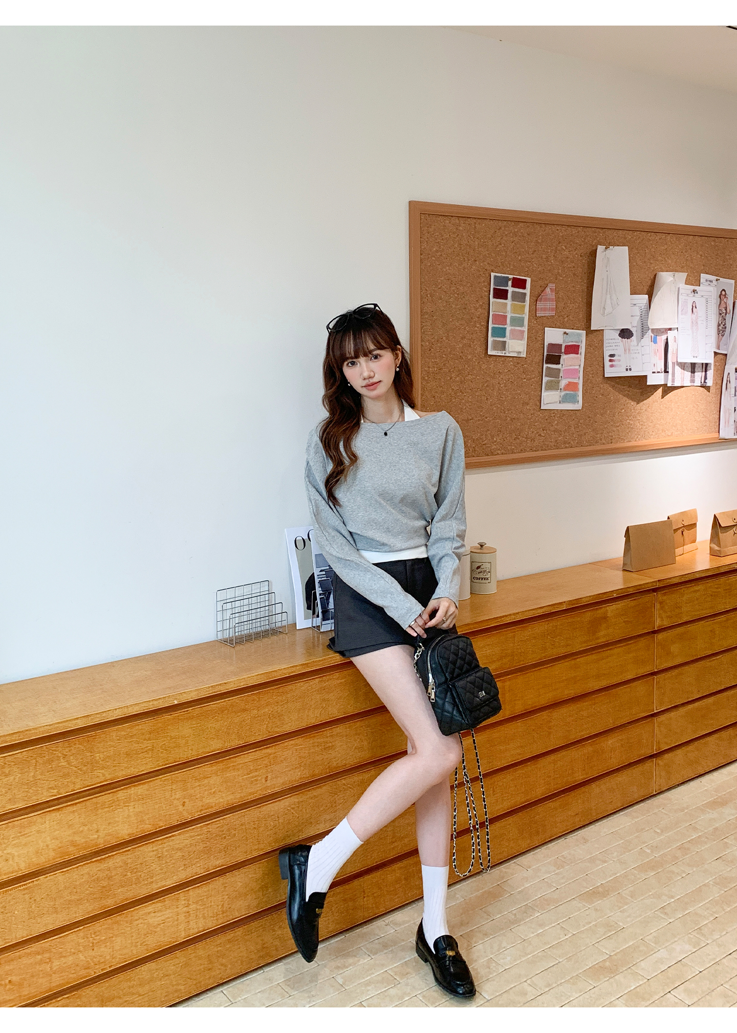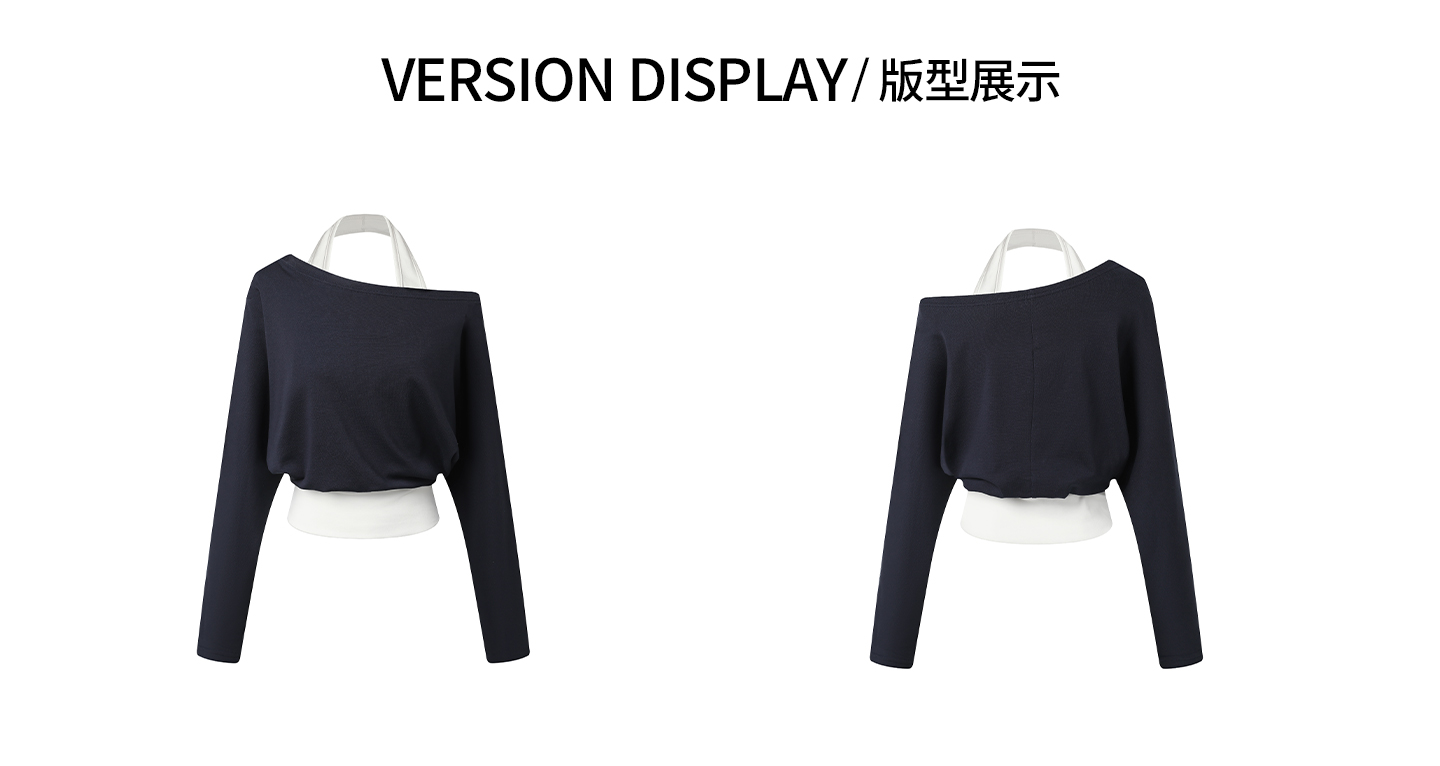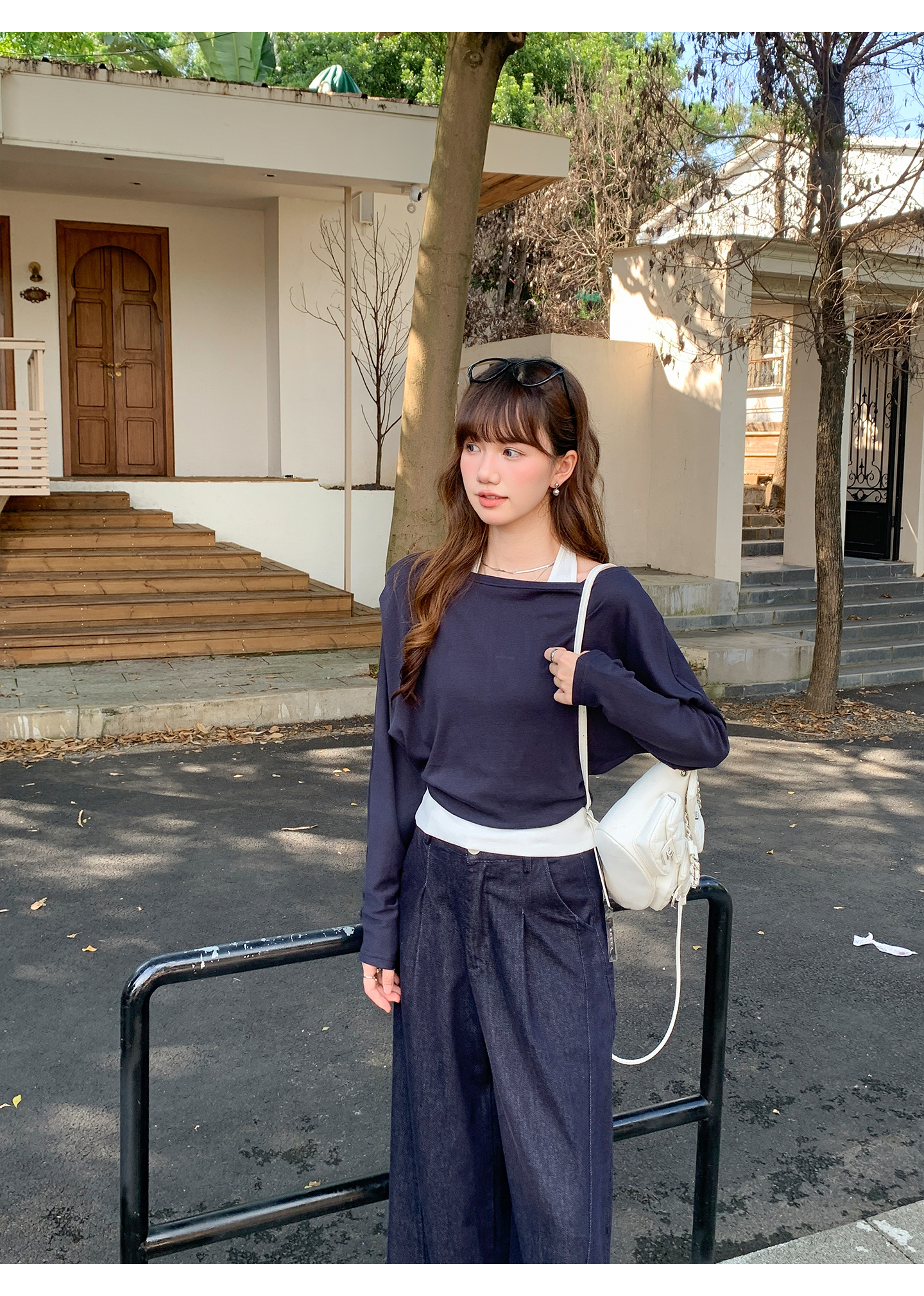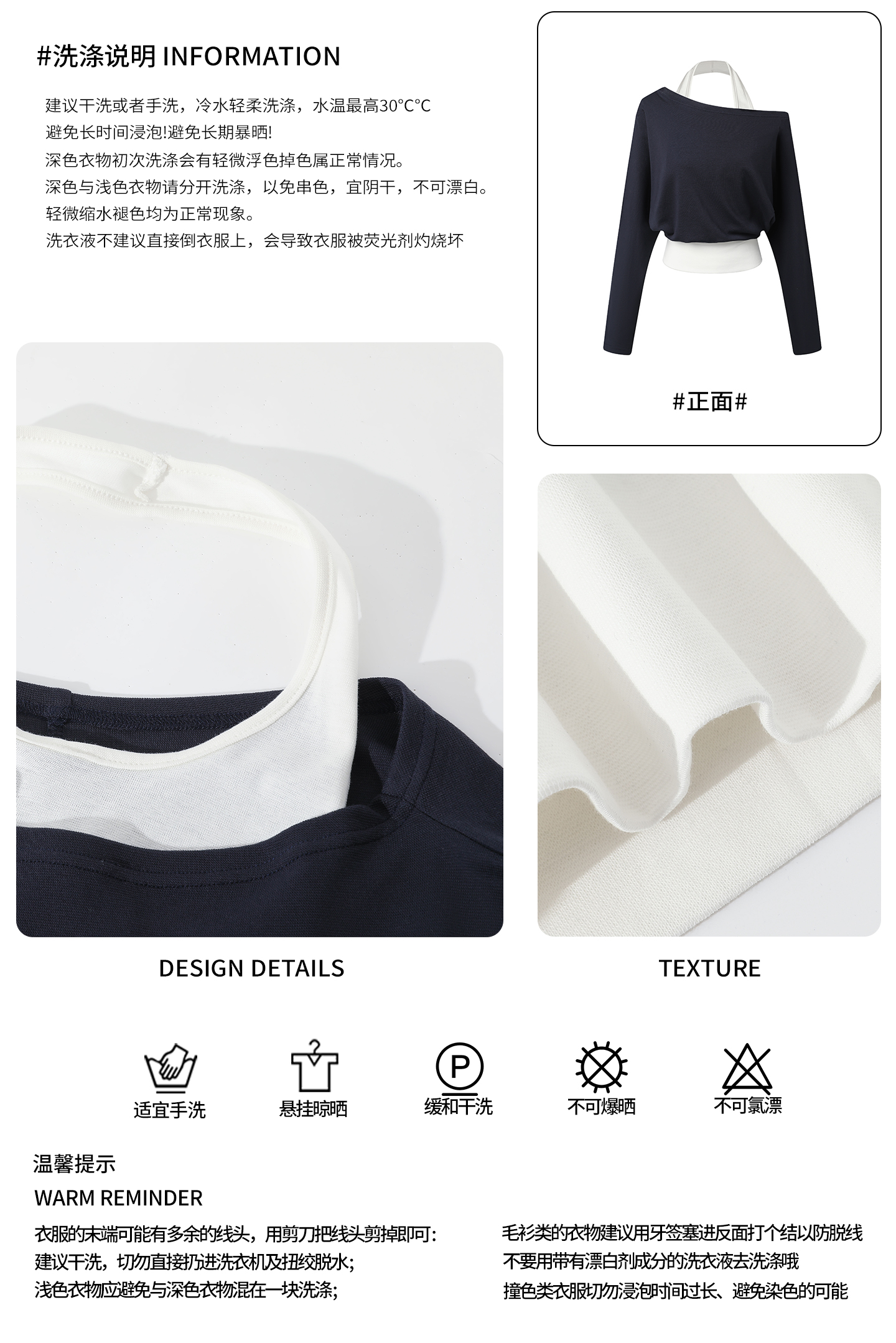 MY14261# 灰色斜肩挂脖假两件长袖t恤女秋季露肩宽松内搭打底衫女裝貨源服裝批發