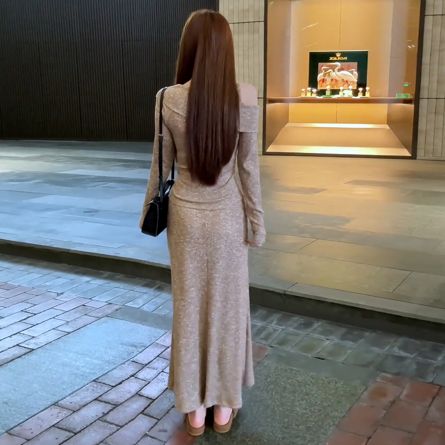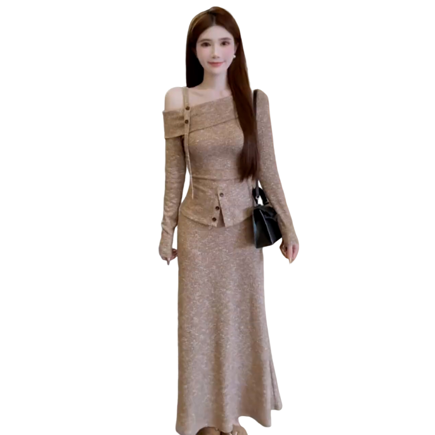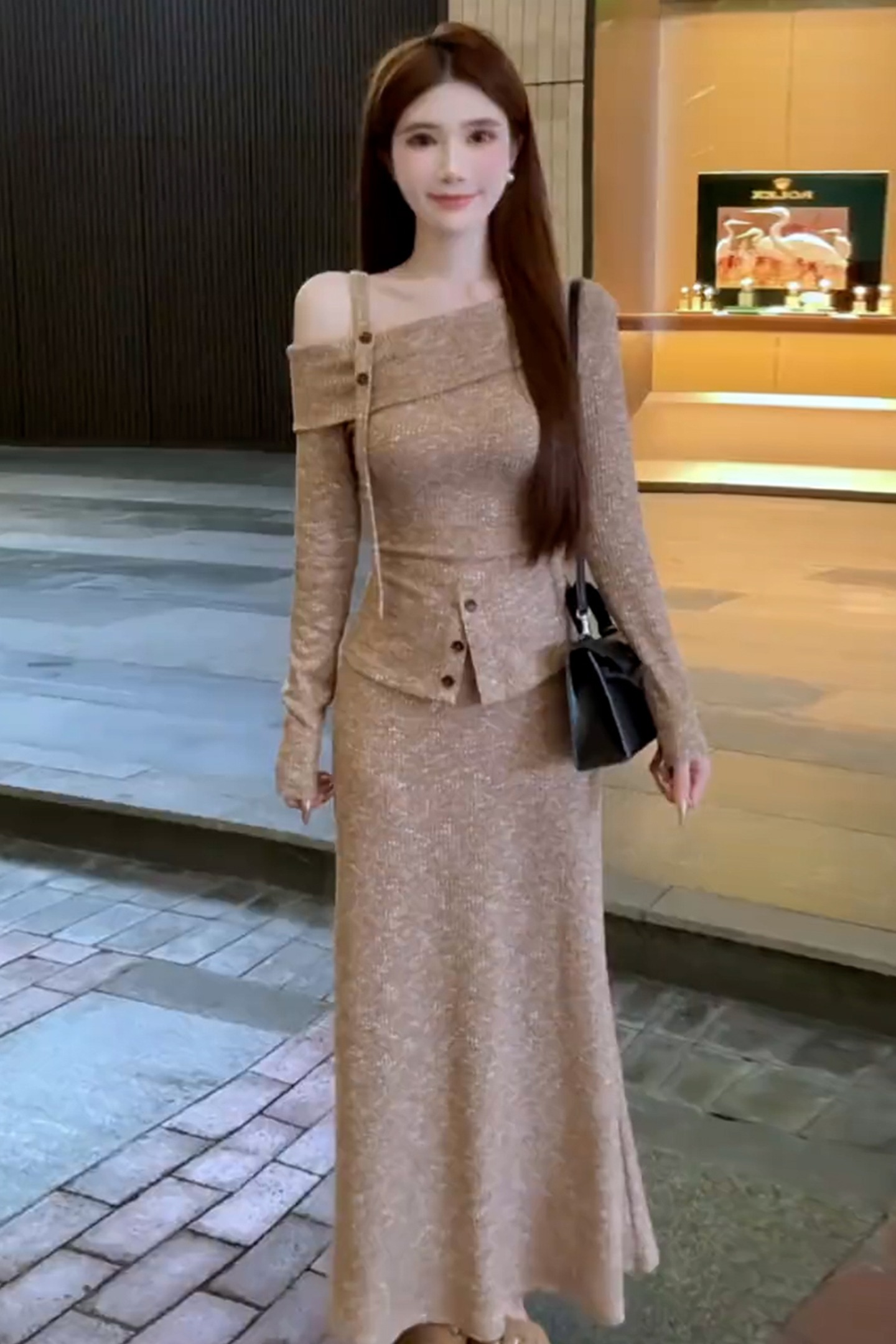 MY14267# 法式长袖针织连衣裙子女装氛围感穿搭一整套长裙套装女裝貨源服裝批發