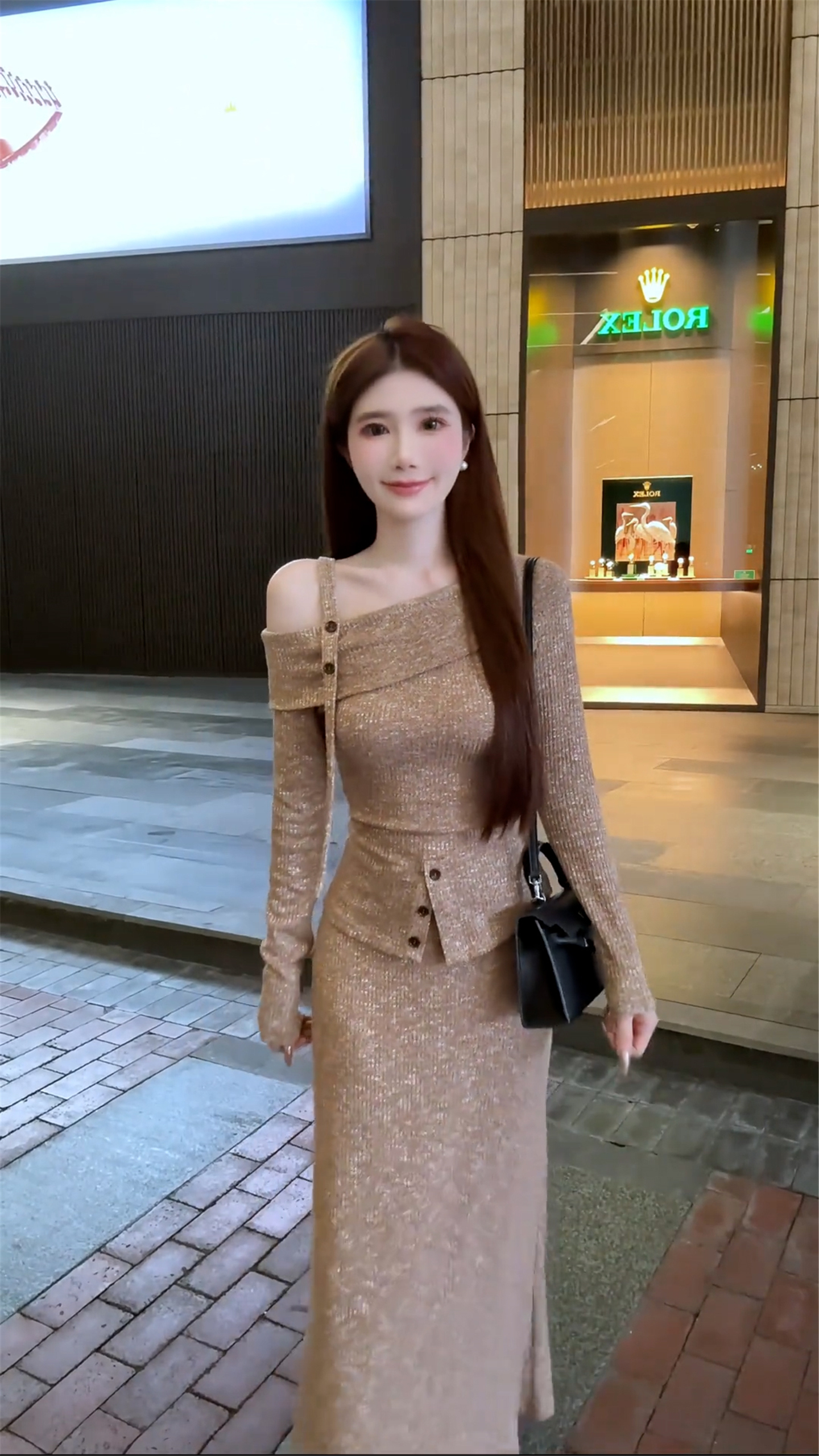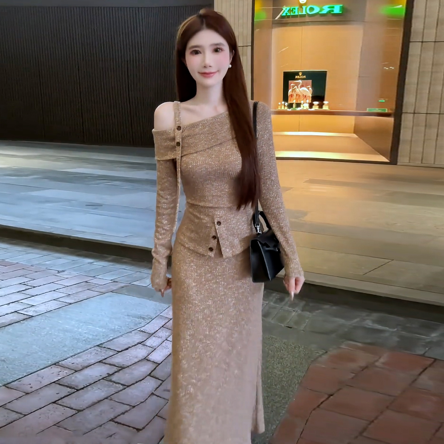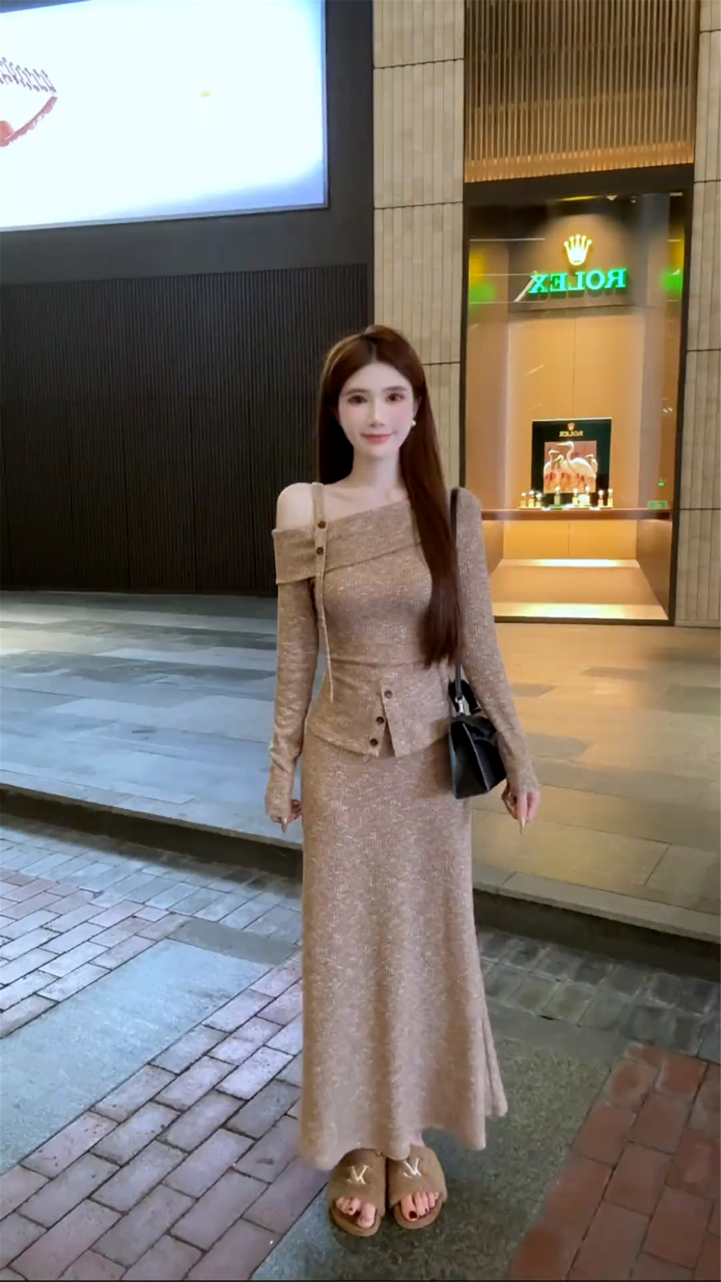 MY14267# 法式长袖针织连衣裙子女装氛围感穿搭一整套长裙套装女裝貨源服裝批發