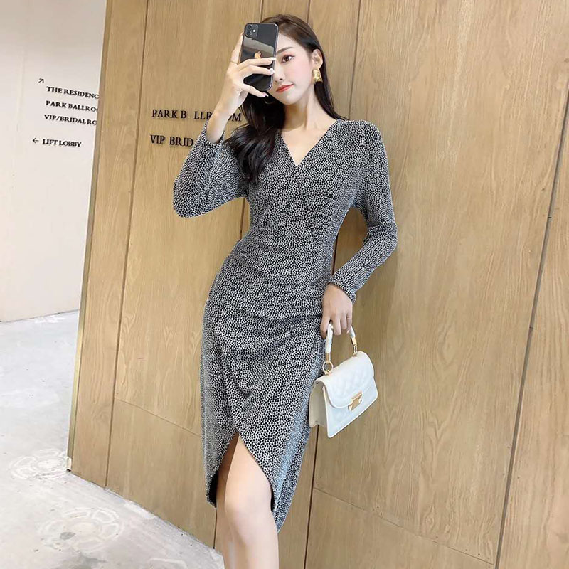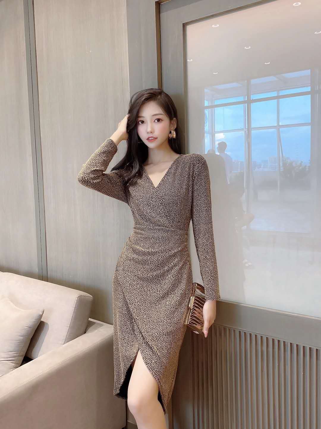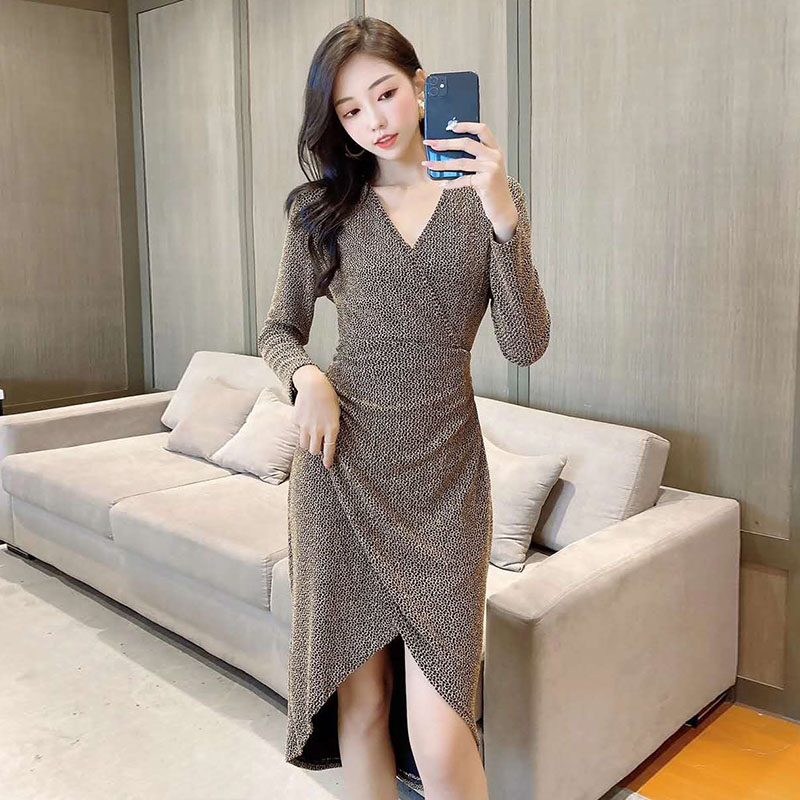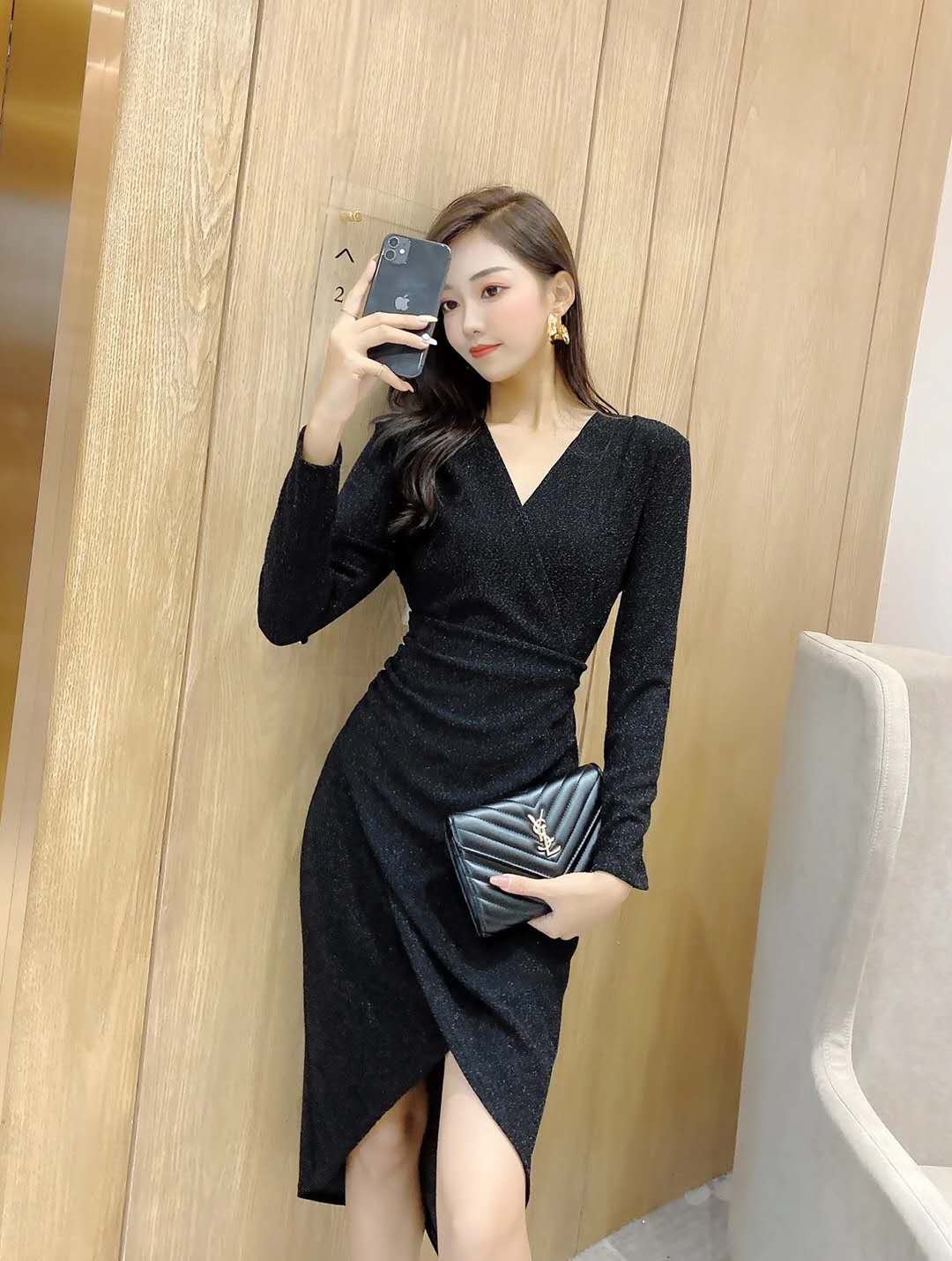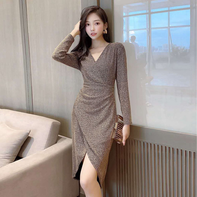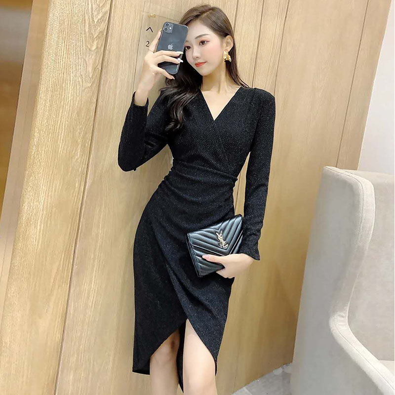 MY14269# 新款V领收腰显瘦连衣裙长袖亮丝开叉包臀气质宴会小礼裙女裝貨源服裝批發