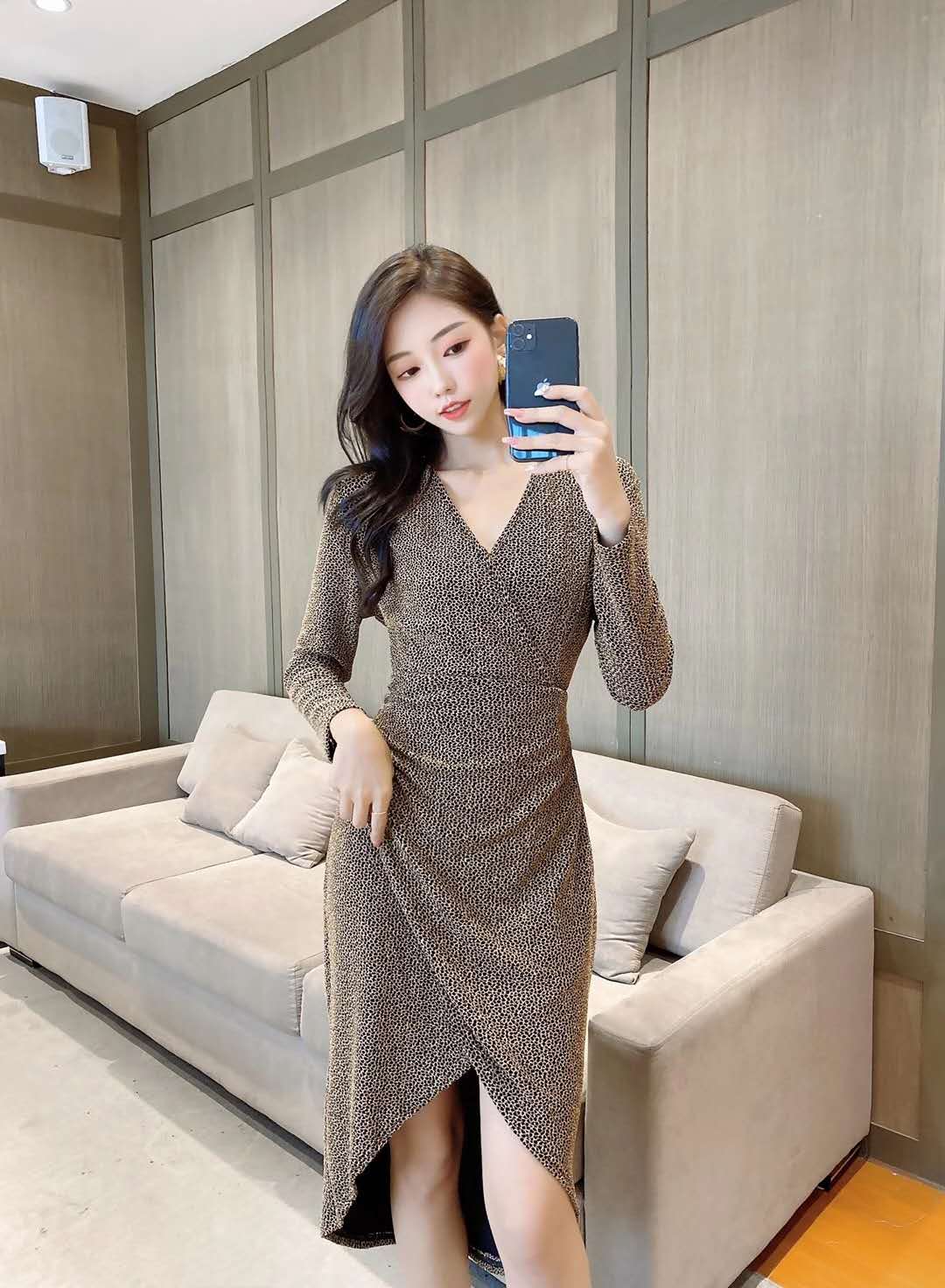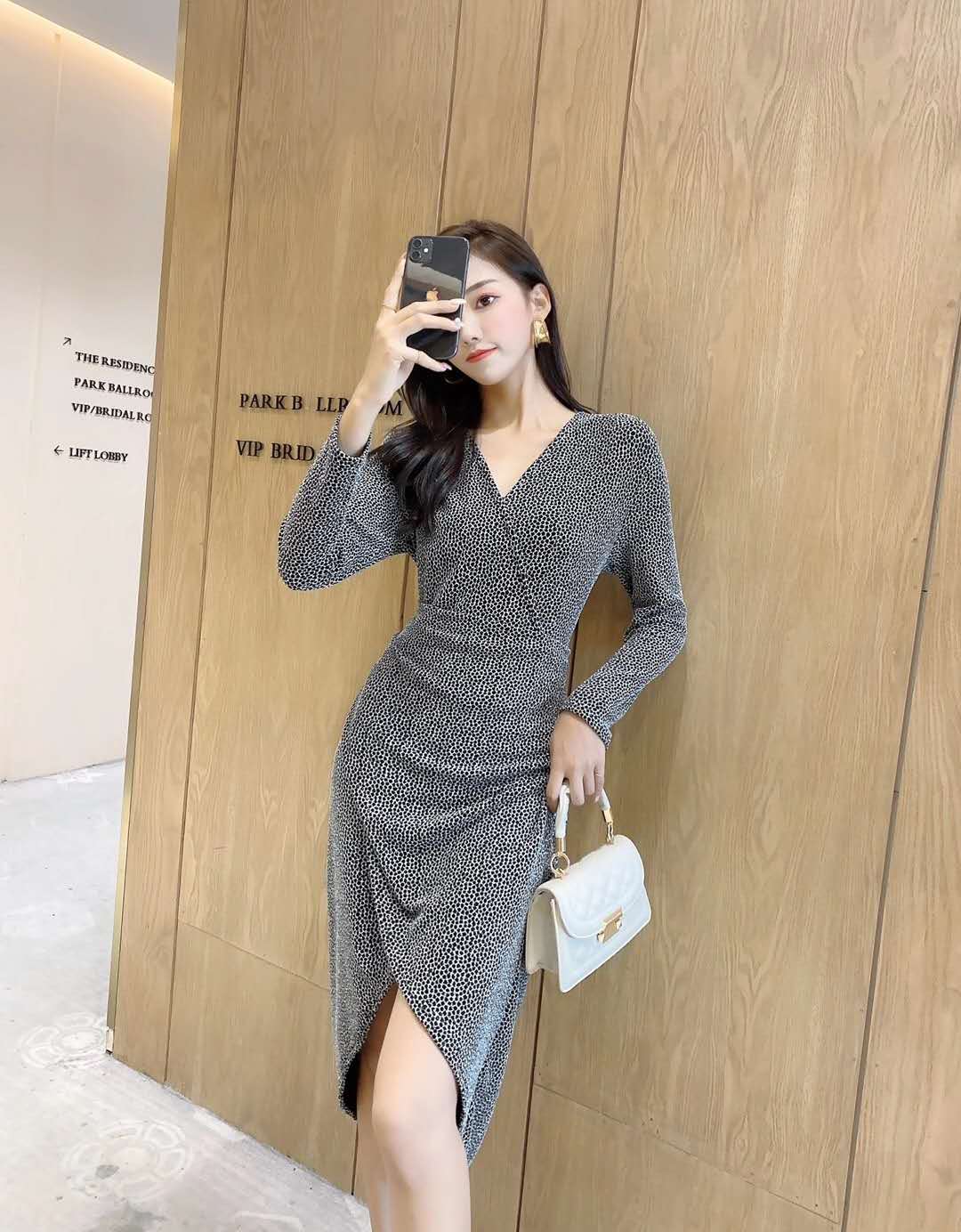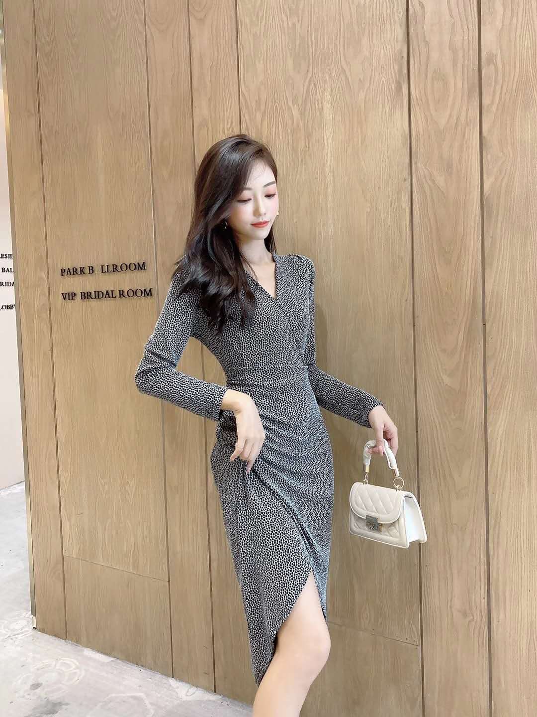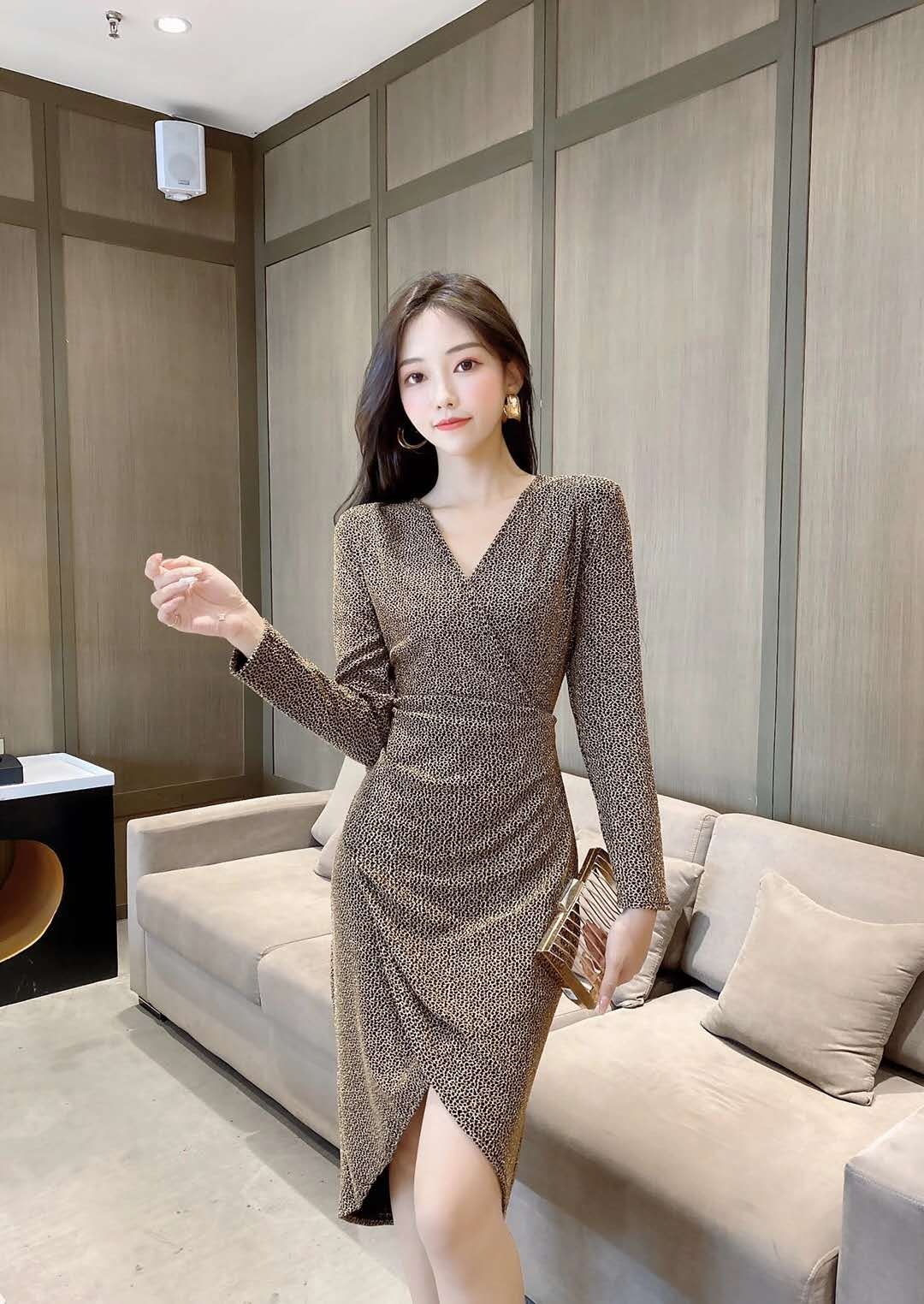 MY14269# 新款V领收腰显瘦连衣裙长袖亮丝开叉包臀气质宴会小礼裙女裝貨源服裝批發