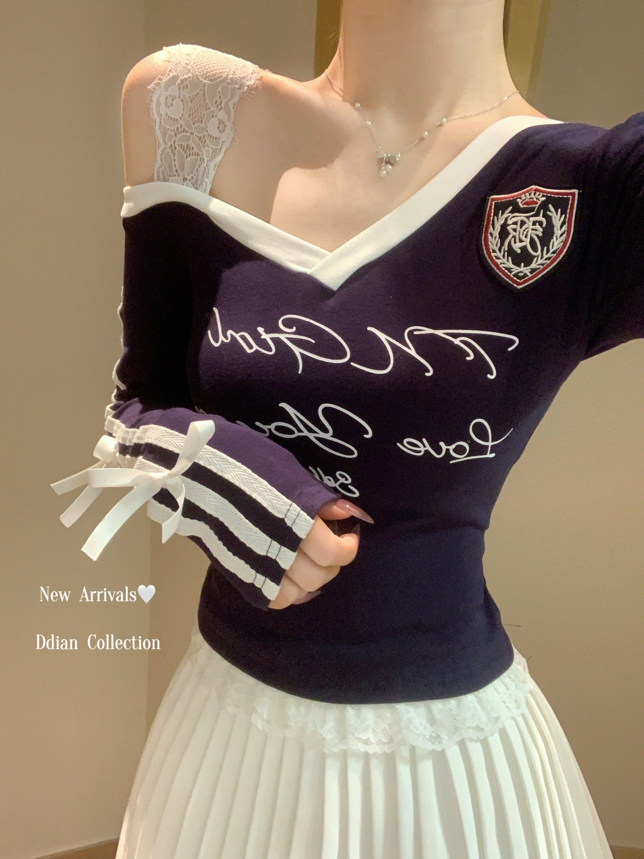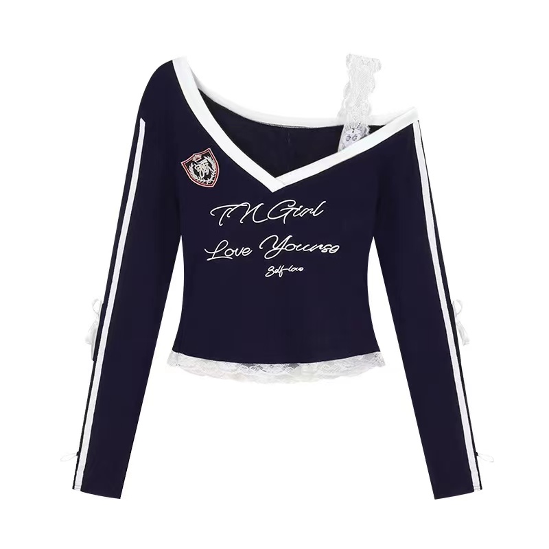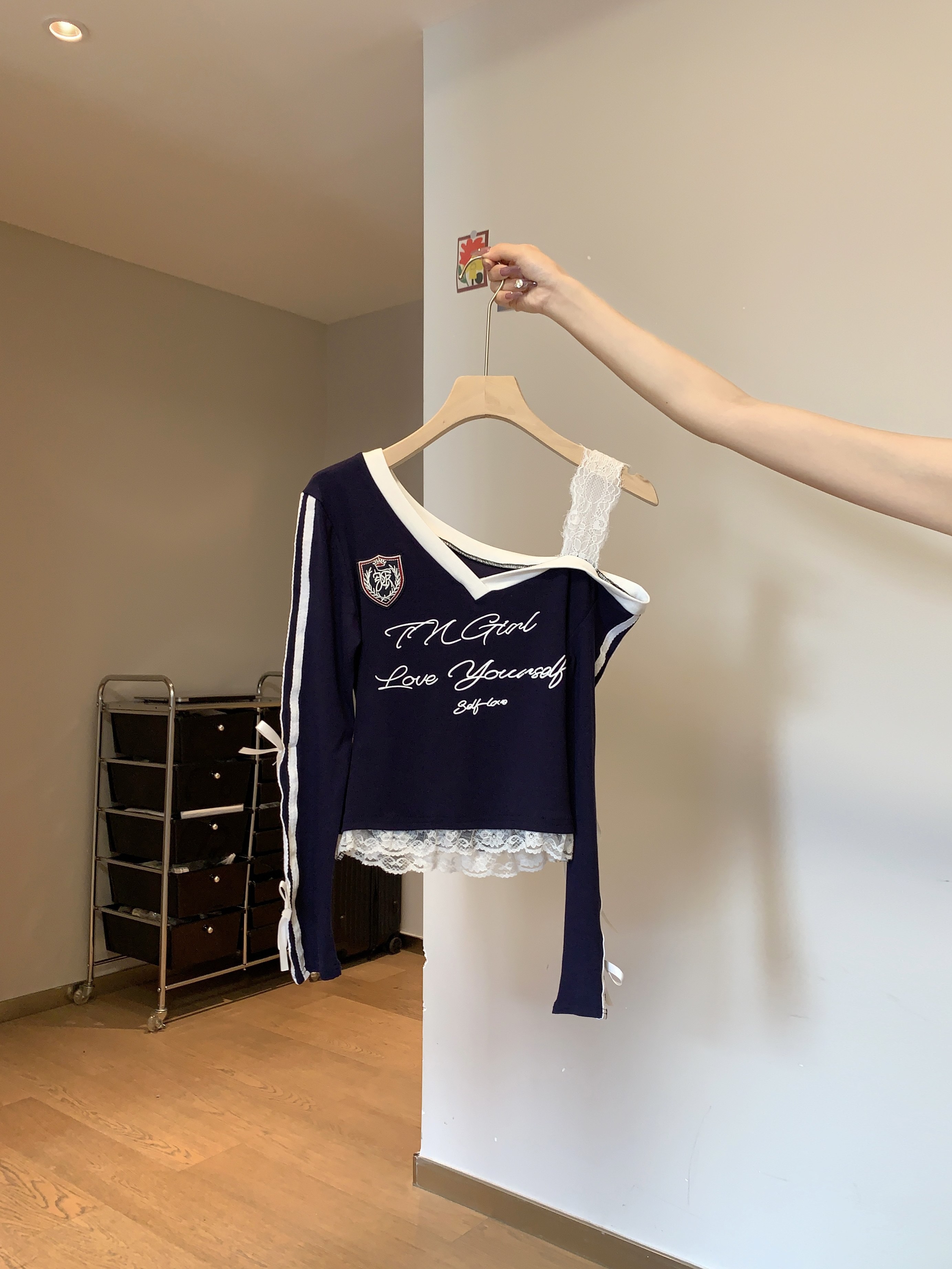 MY14288# 美式复古V领蕾丝拼接露肩长袖T恤女新款显瘦收腰打底衫上衣女裝貨源服裝批發