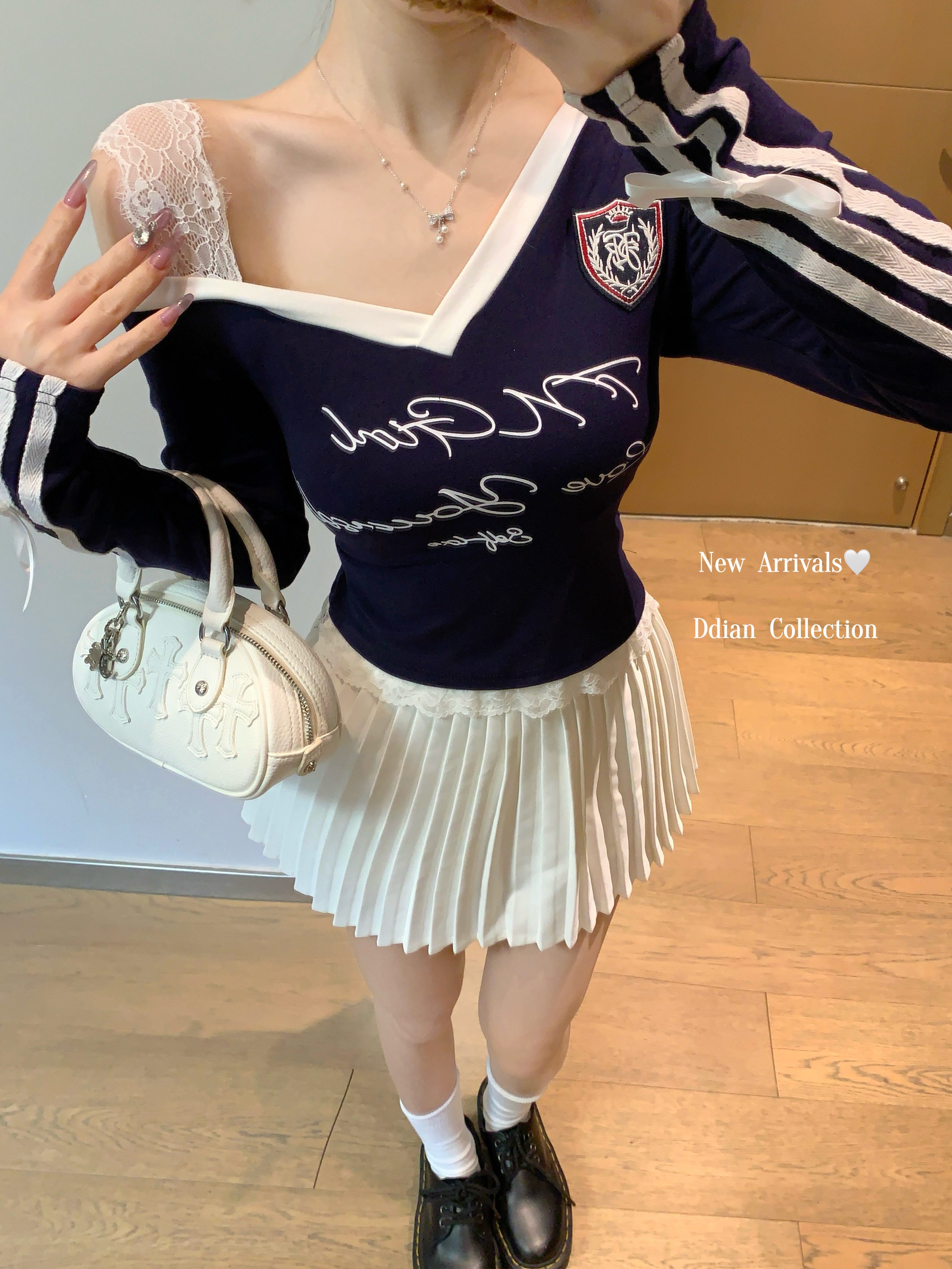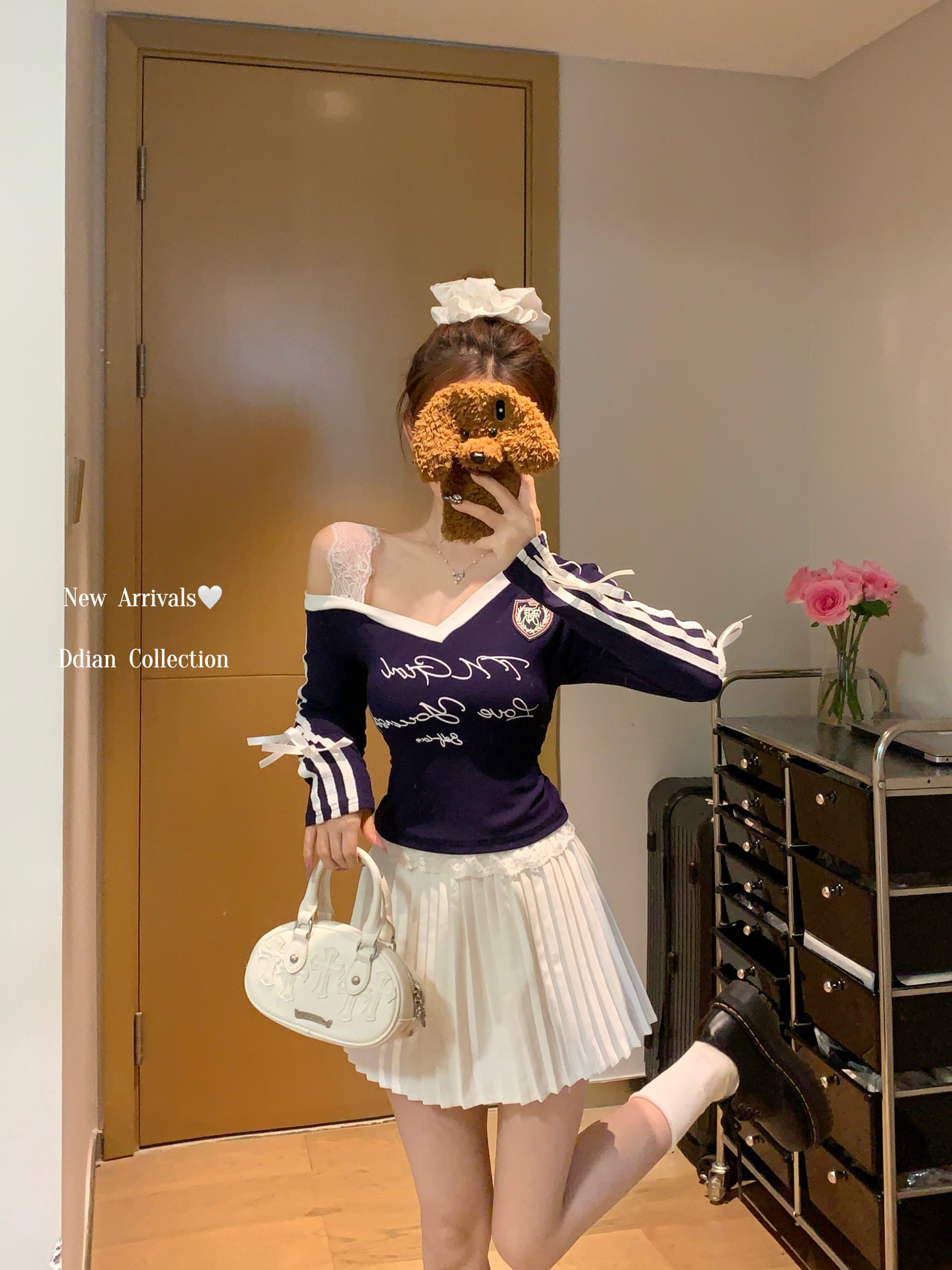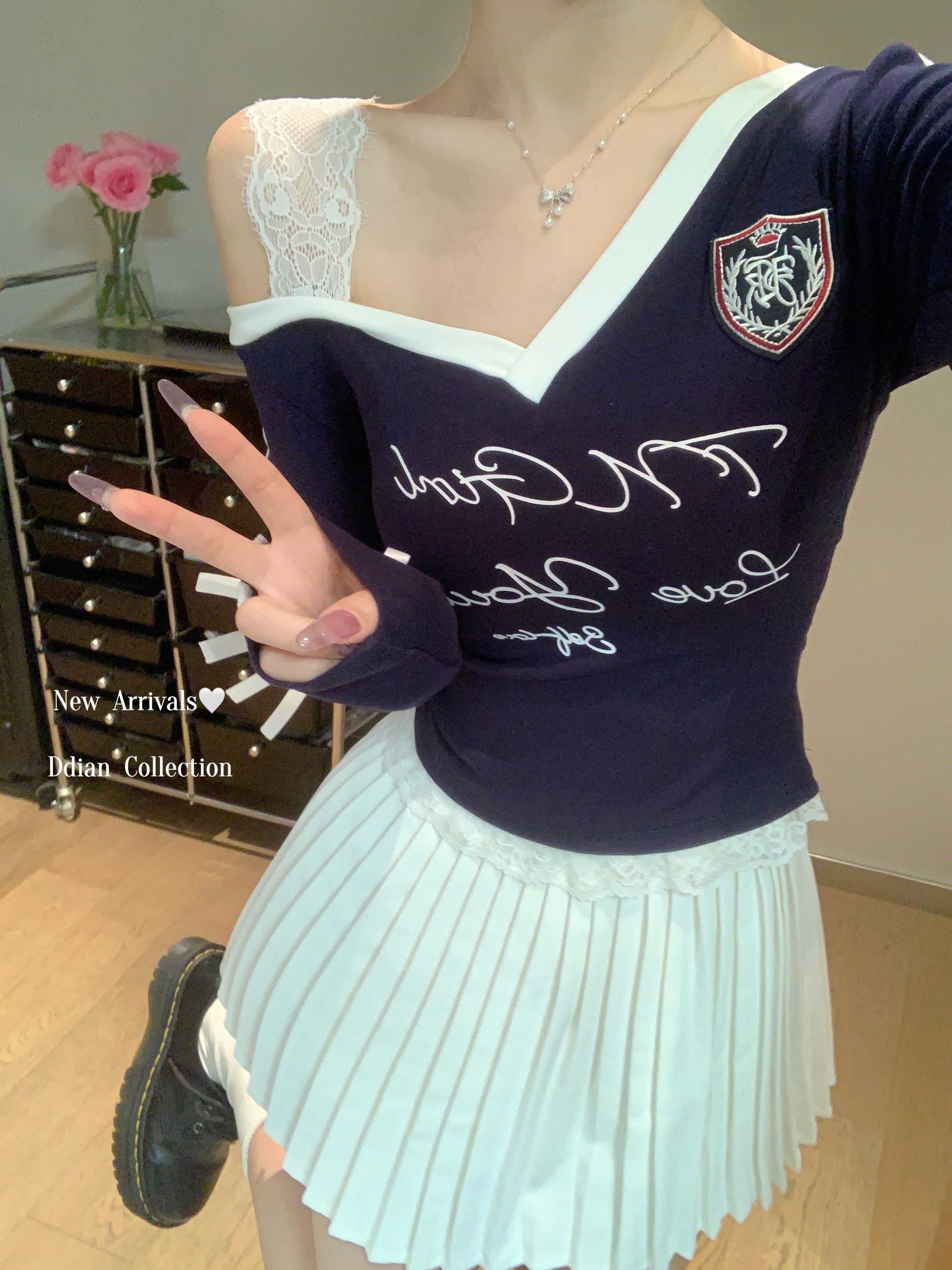 MY14288# 美式复古V领蕾丝拼接露肩长袖T恤女新款显瘦收腰打底衫上衣女裝貨源服裝批發