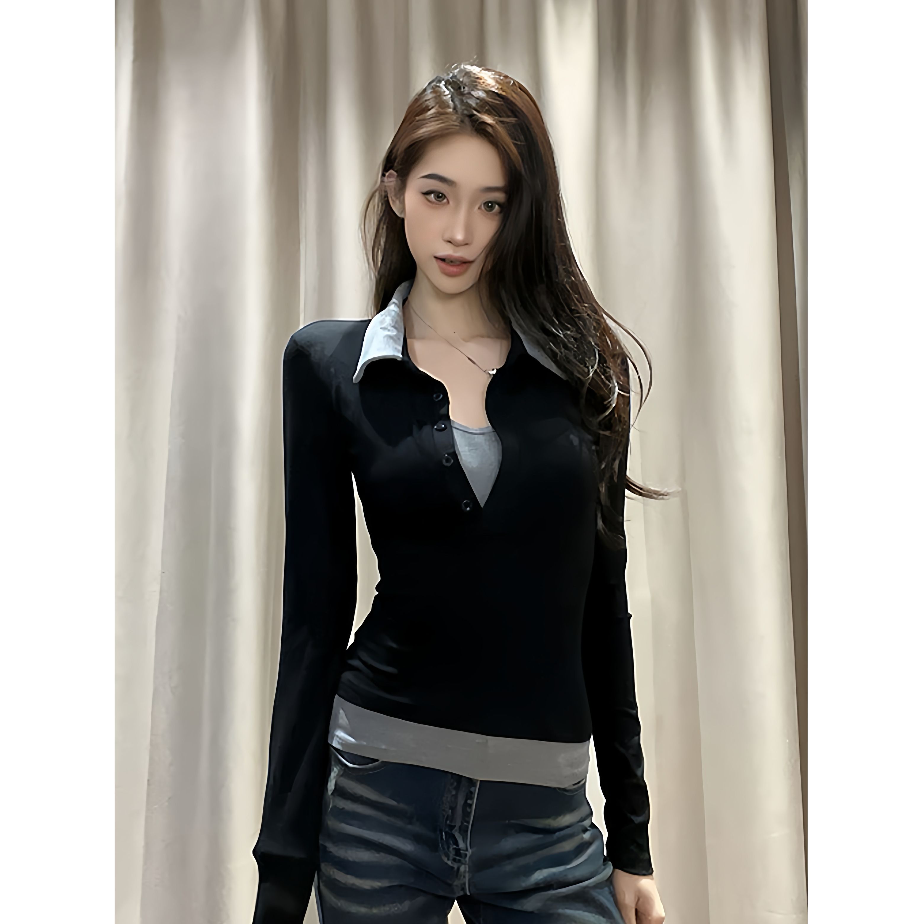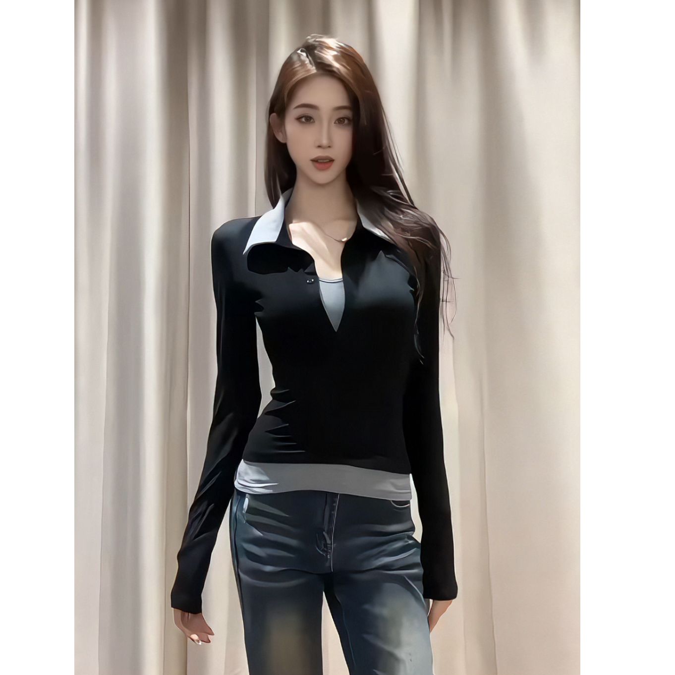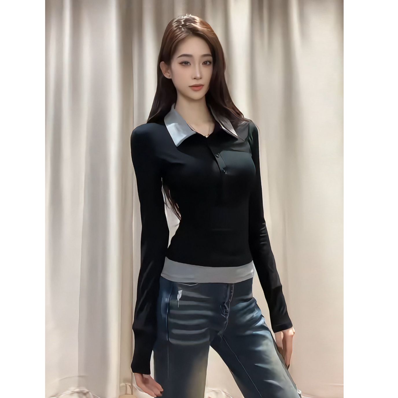 MY14291# 随心裁纯欲假两件Polo领长袖T恤女秋季设计感拼接显瘦上衣女裝貨源服裝批發
