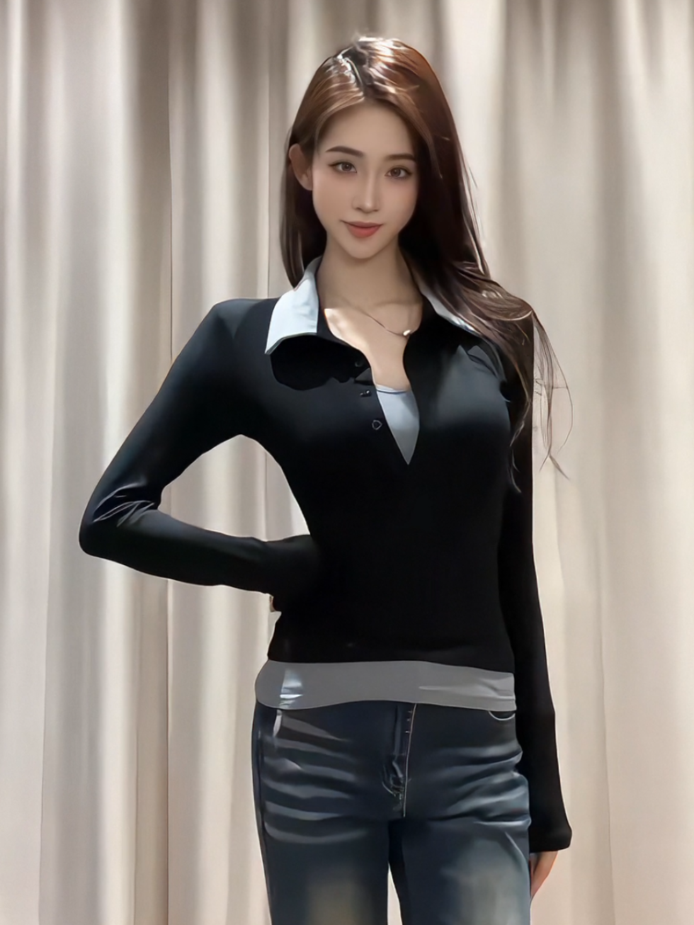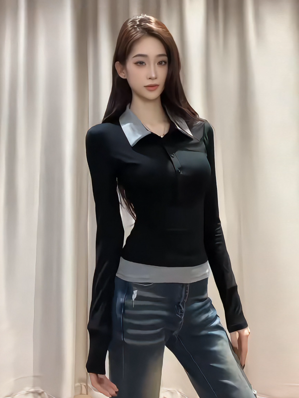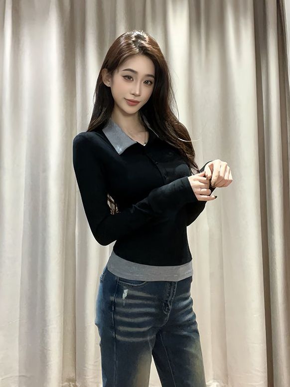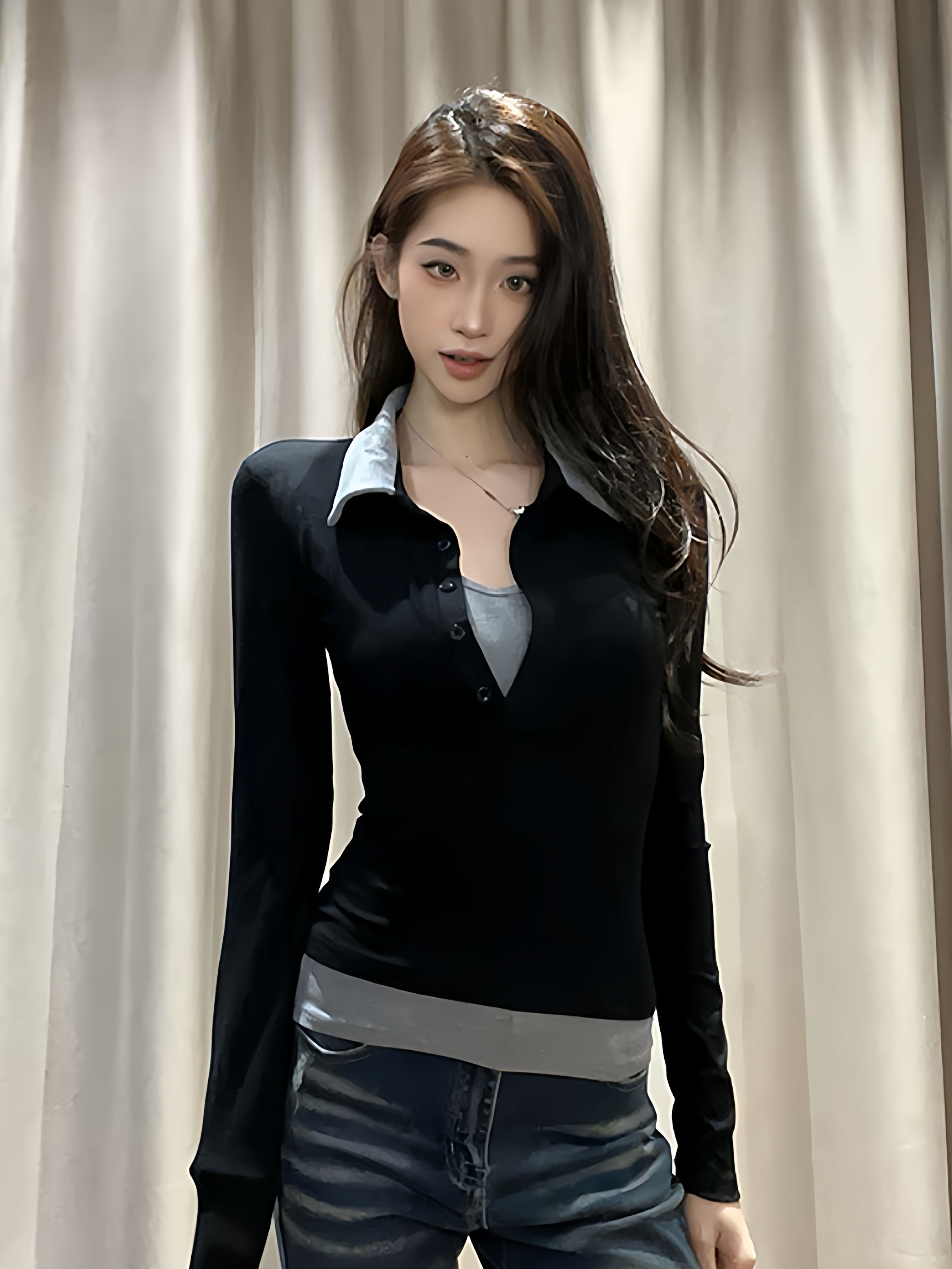 MY14291# 随心裁纯欲假两件Polo领长袖T恤女秋季设计感拼接显瘦上衣女裝貨源服裝批發