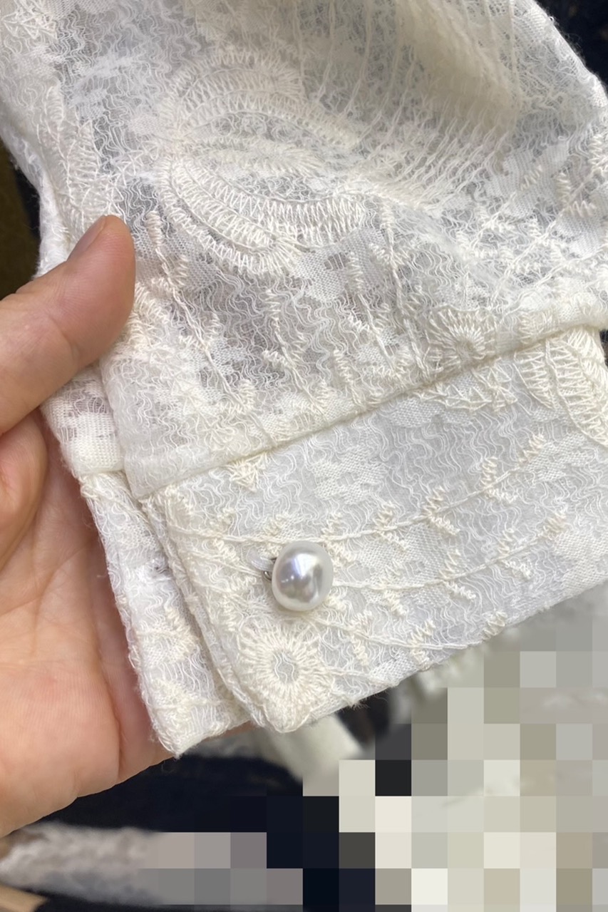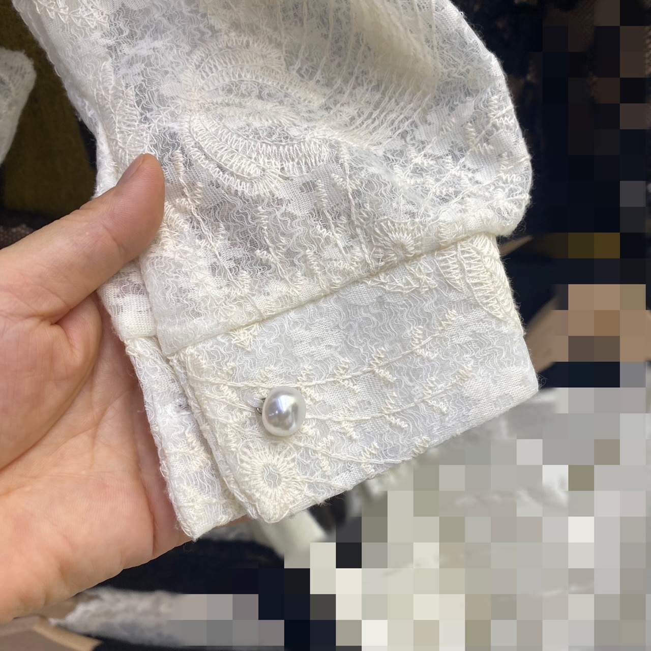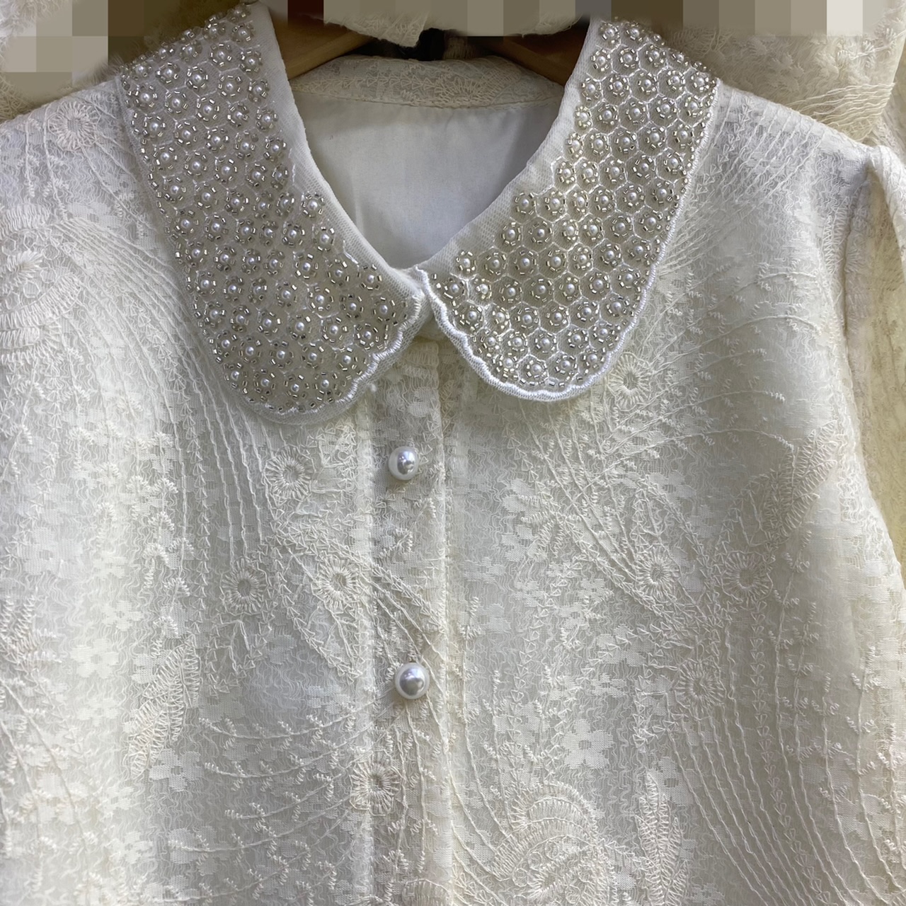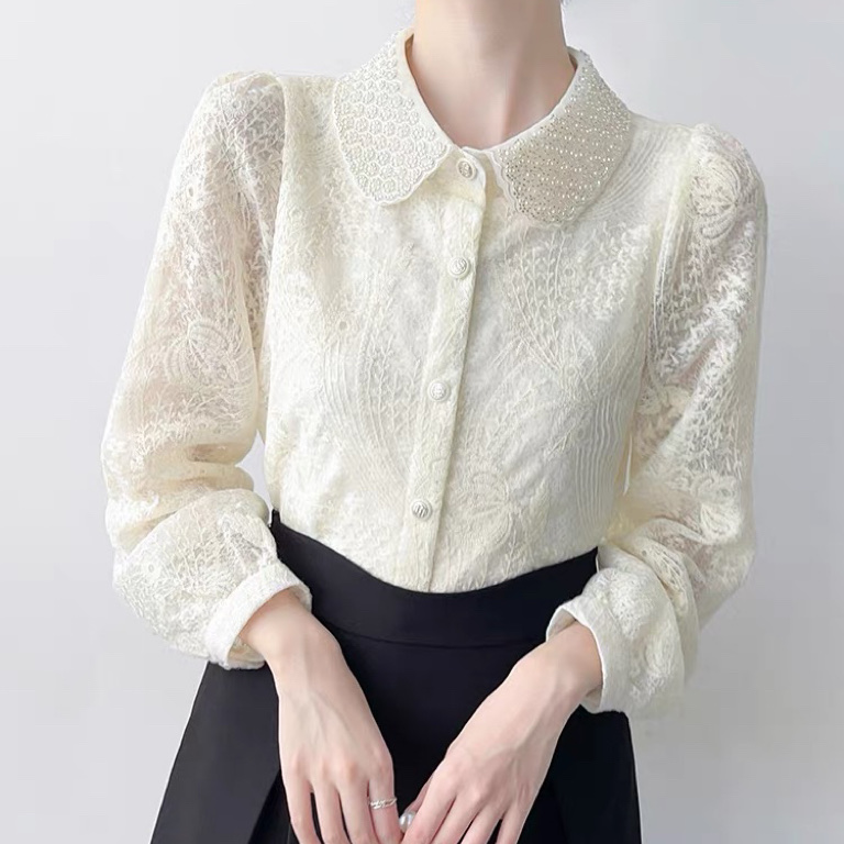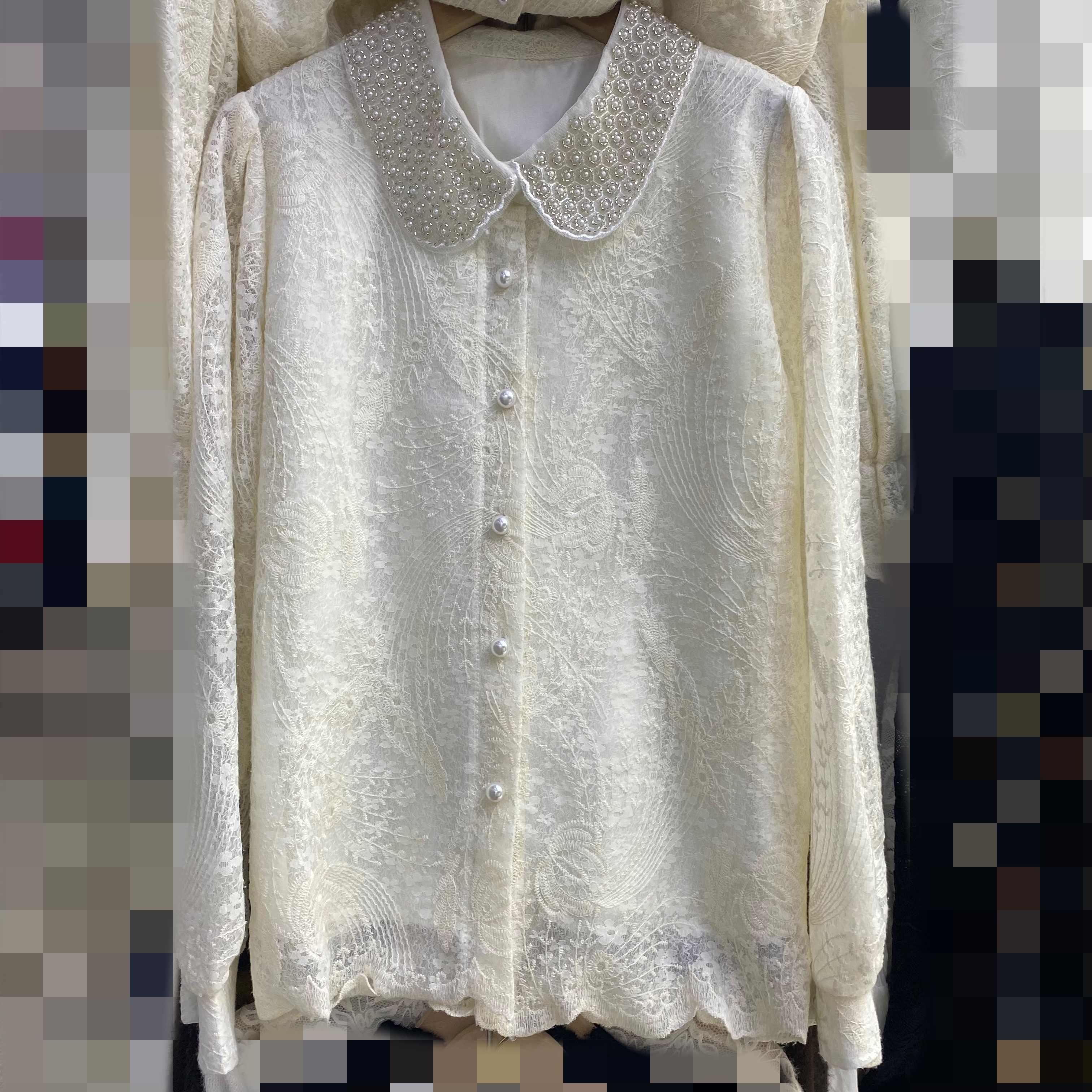 MY14295# 重工钉珠翻领长袖蕾丝衬衫春秋新款刺绣衬衫洋气小衫上衣女裝貨源服裝批發