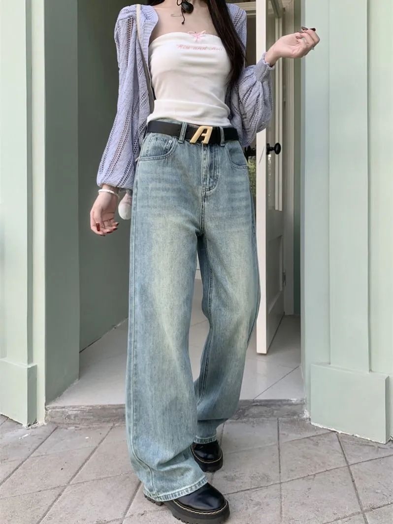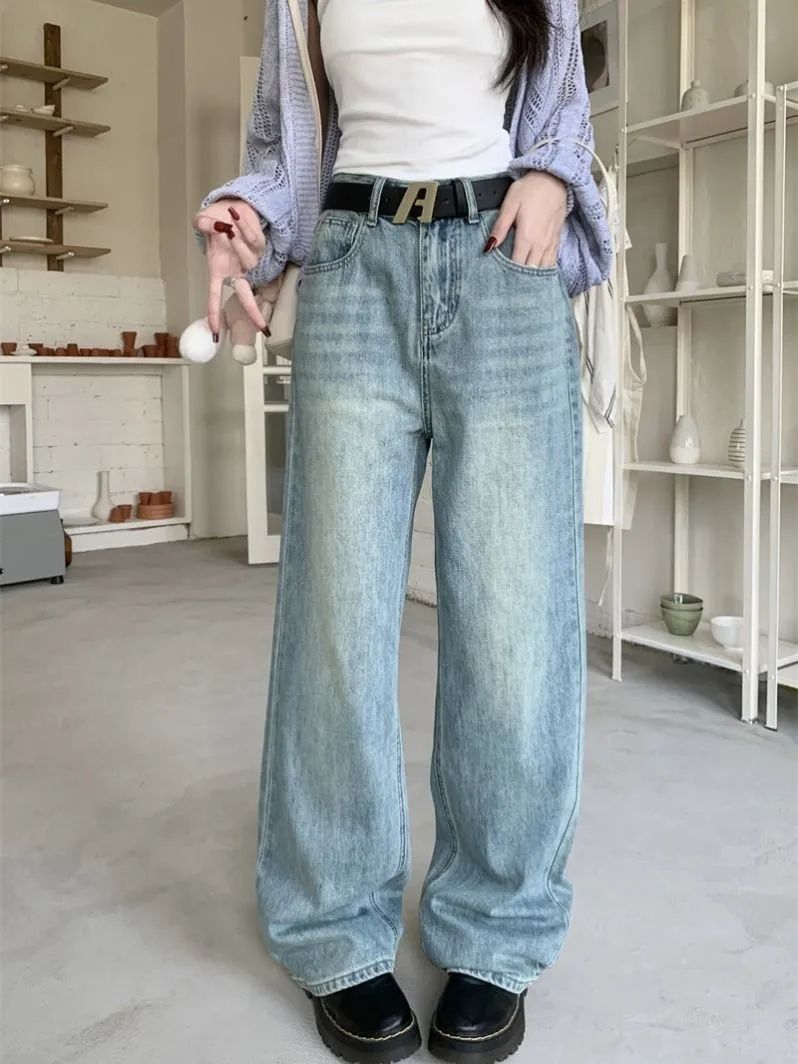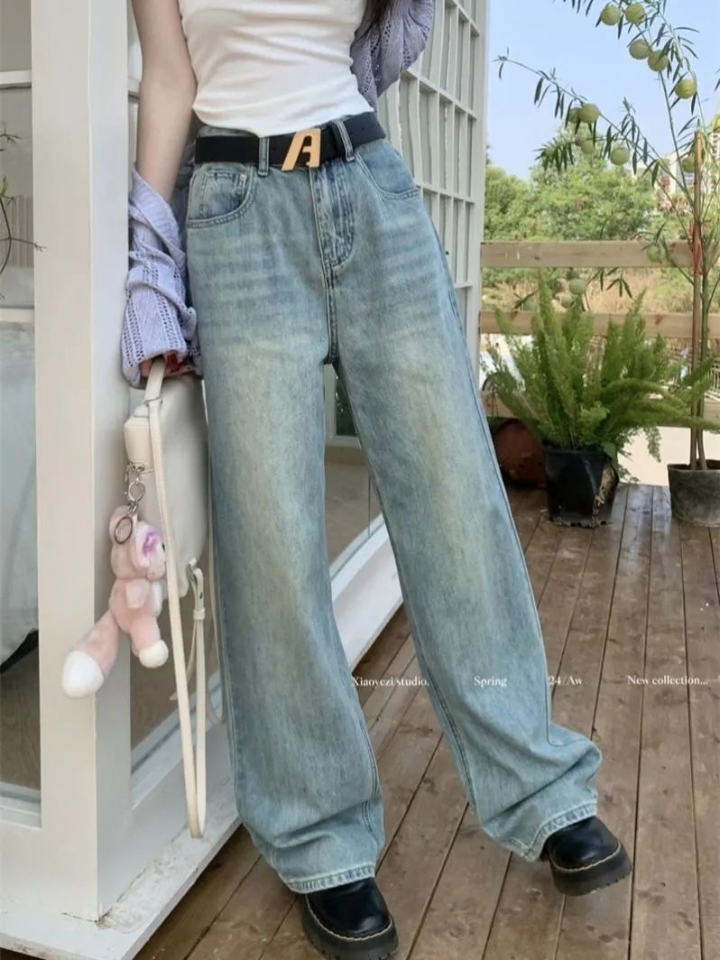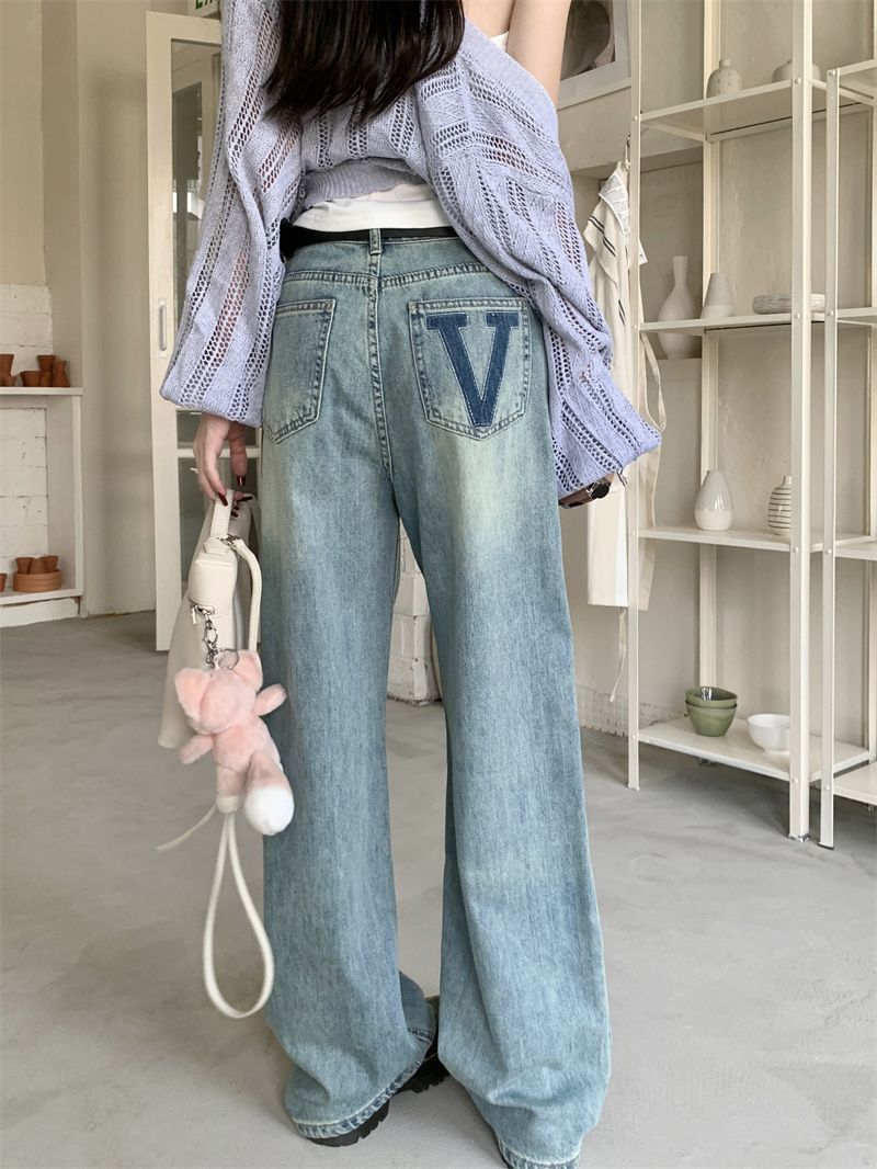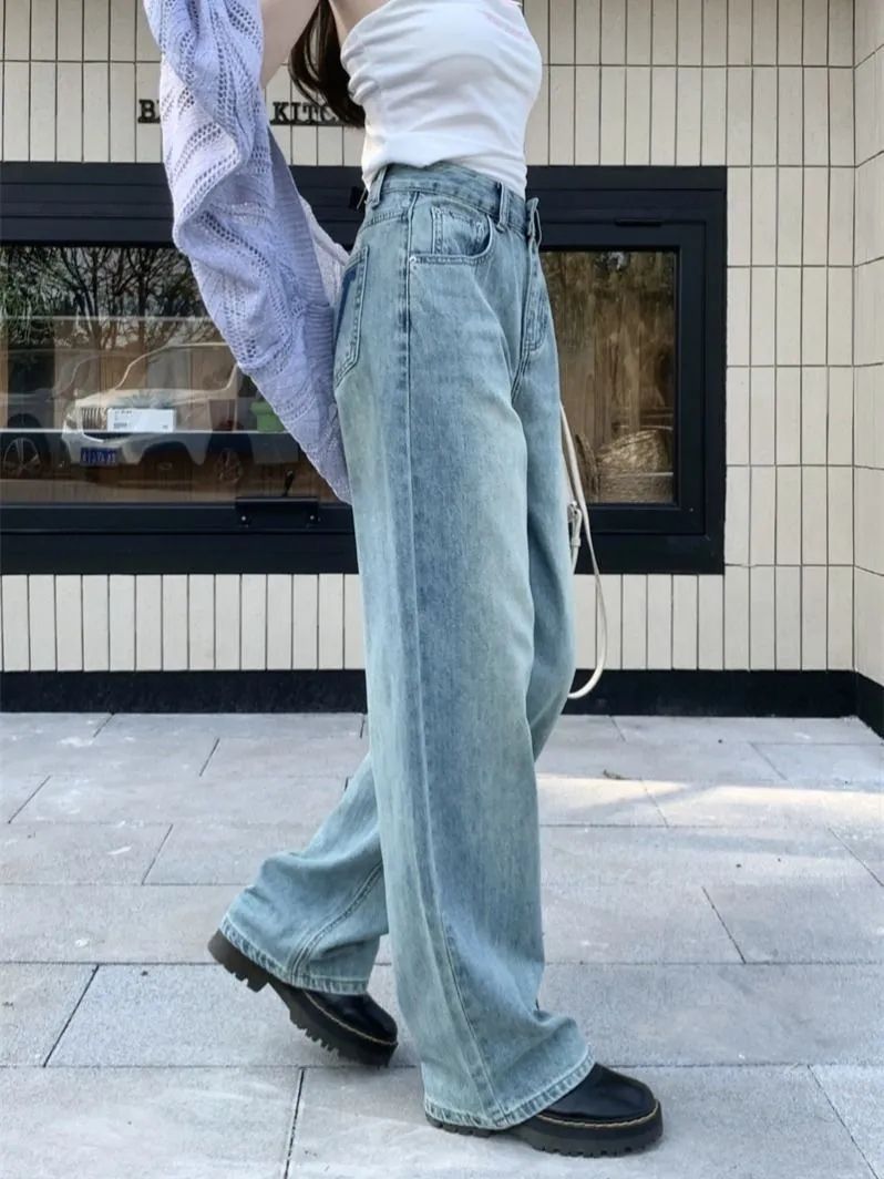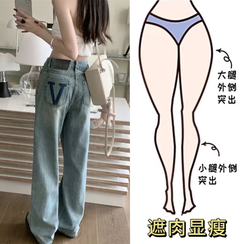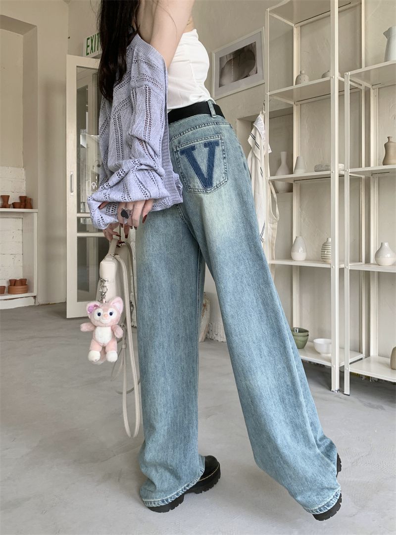 MY14317# 新款字母浅色高腰阔腿牛仔裤显瘦女宽松直筒垂感拖地裤女裝貨源服裝批發